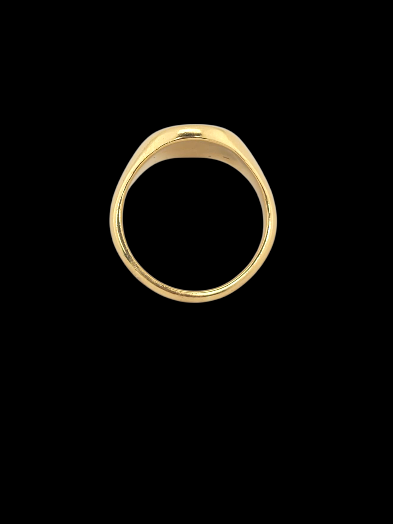 Heavy 18ct yellow gold oval signet ring. 11.25 grams. 14mm x 12.5mm oval head with lovely soft edges. English hallmarked Birmingham 1983 l. Maker's mark B&S. Currently finger size R (U.S 8.75)