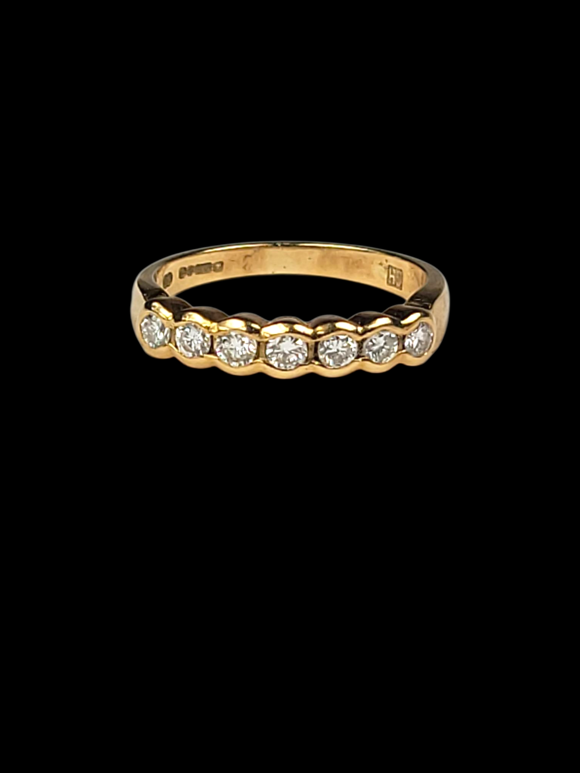 Unusual 18ct yellow gold bezel set natural brilliant cut diamond half hoop ring. 3.5mm wide. Currently finger size L 1/2. 18ct hallmarked 1998.