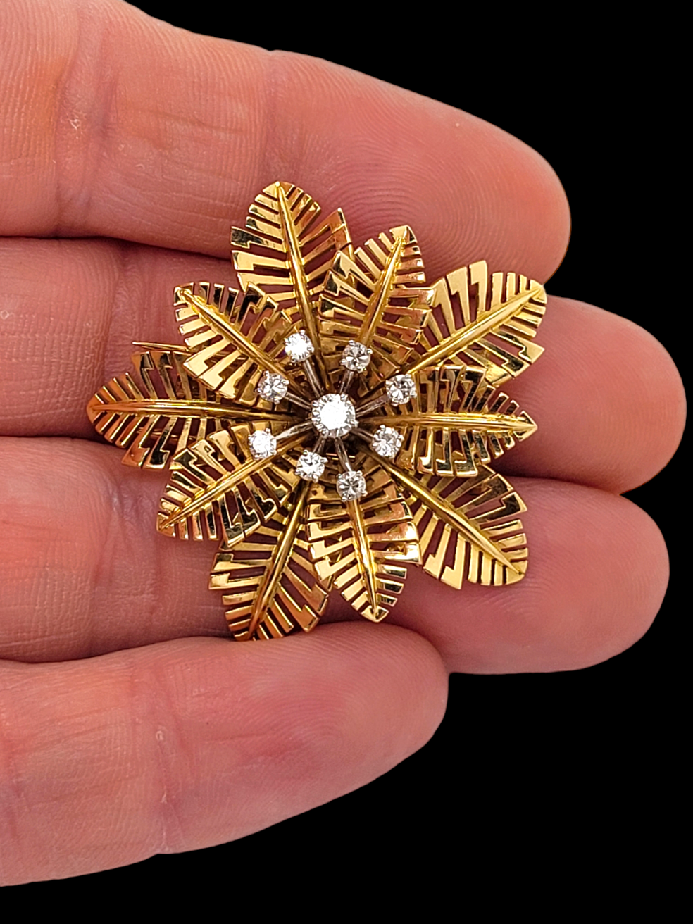Quality 18ct pierced out petals with 0.65cts of white brilliant cut diamonds. French circa 1960 serial number 31856. 40mm diameter