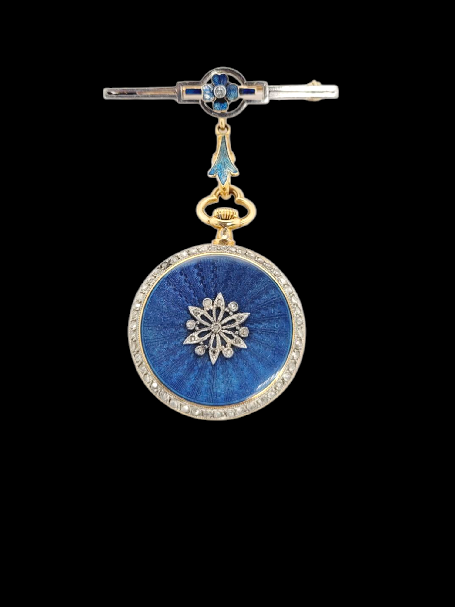 Early 20th century manual watch set in 18ct gold with guilloche blue enamel enhancing beautifully radial chevron engine turning beneath. Rose cut diamond snowflake to the centre milgrain set in platinum. Rose cut diamond boarder. Arabic numerals to dial with Cartier name. 24mm diameter. Gold trefoil to top hung off geometric brooch detailing a blue enamel forget-me-not diamond to centre.