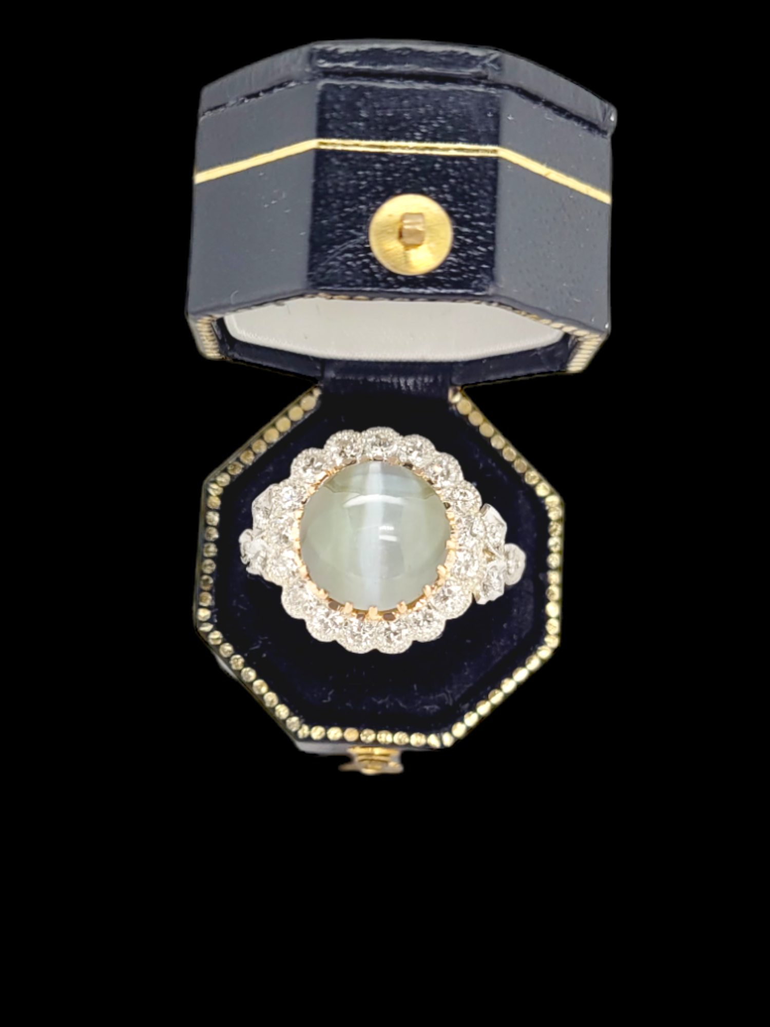 Fine gem 11.5mm diameter honey Cymophane chrysoberyl cat's eye surrounded by 1.4cts of old cut diamonds including diamond flower shoulders all set in milgrain platinum and 18ct yellow gold shank. Head size 16mm. Currently finger size M 1/2 (U.S 6)