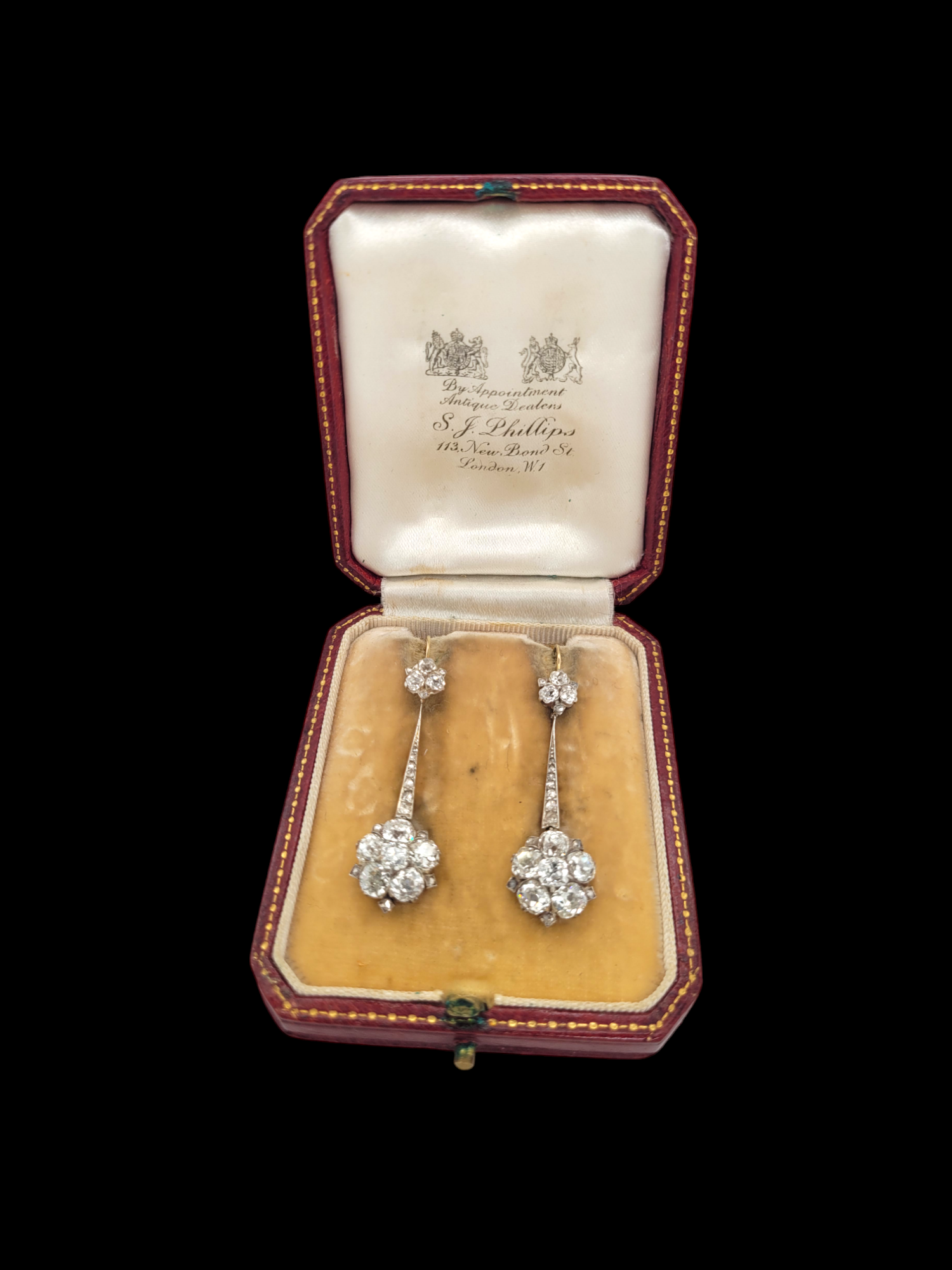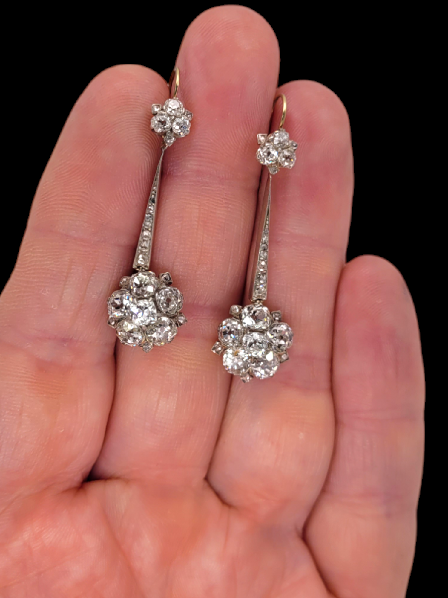 Awesome Edwardian diamond cluster drop earrings with earlier chunky old mine cut diamonds 6.80cts set in platinum with 18ct yellow gold backs. 40mm long 11.5mm wide. Five petal pansy flower clusters with added diamond points suspended by a graduating diamond set bar with a trefoil diamond top and diamond points.