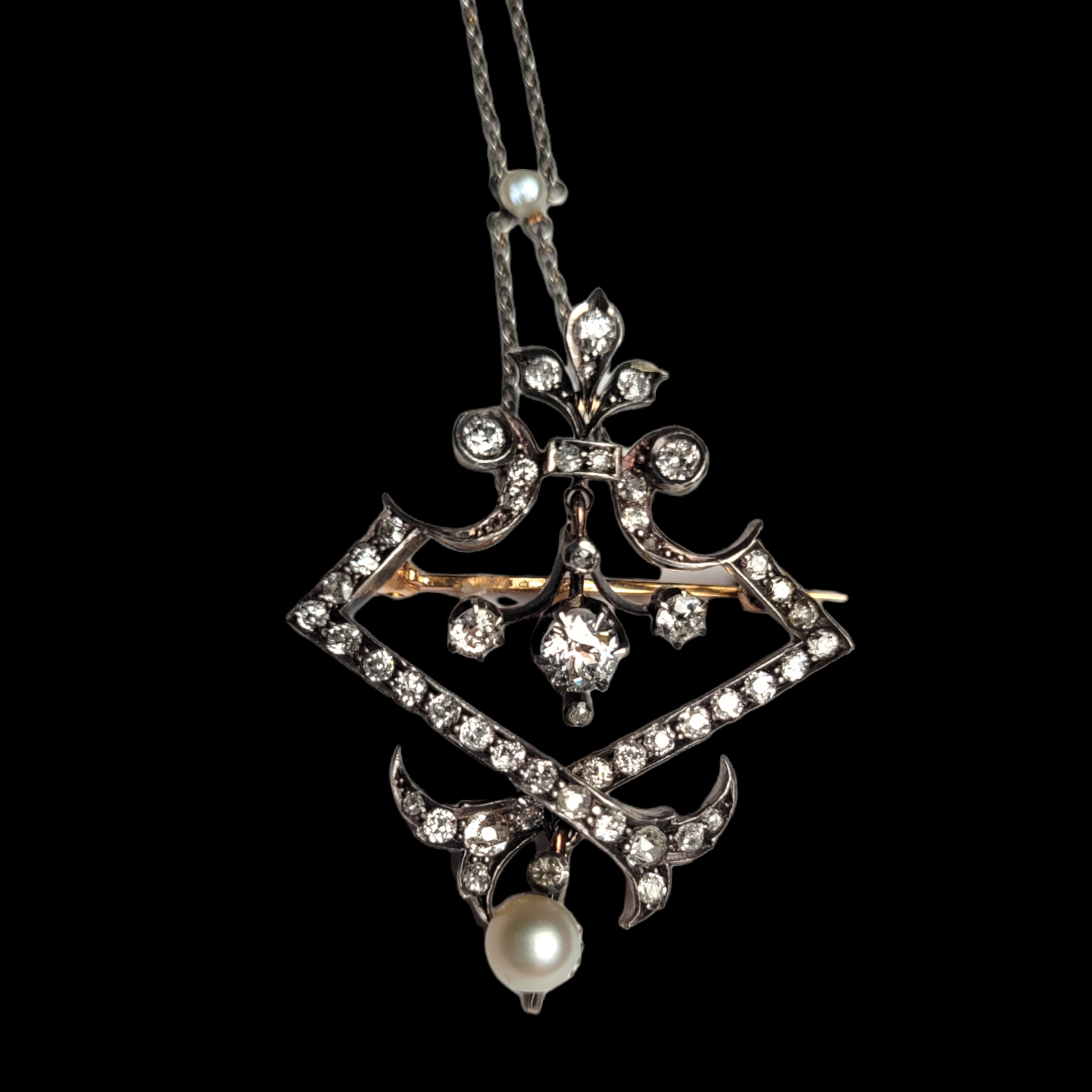 Old cut diamonds weighing approximately 2.5cts set in silver and gold. Detachable brooch fittings and chain. English circa 1870. 45mm x 40mm. 20 inch chain