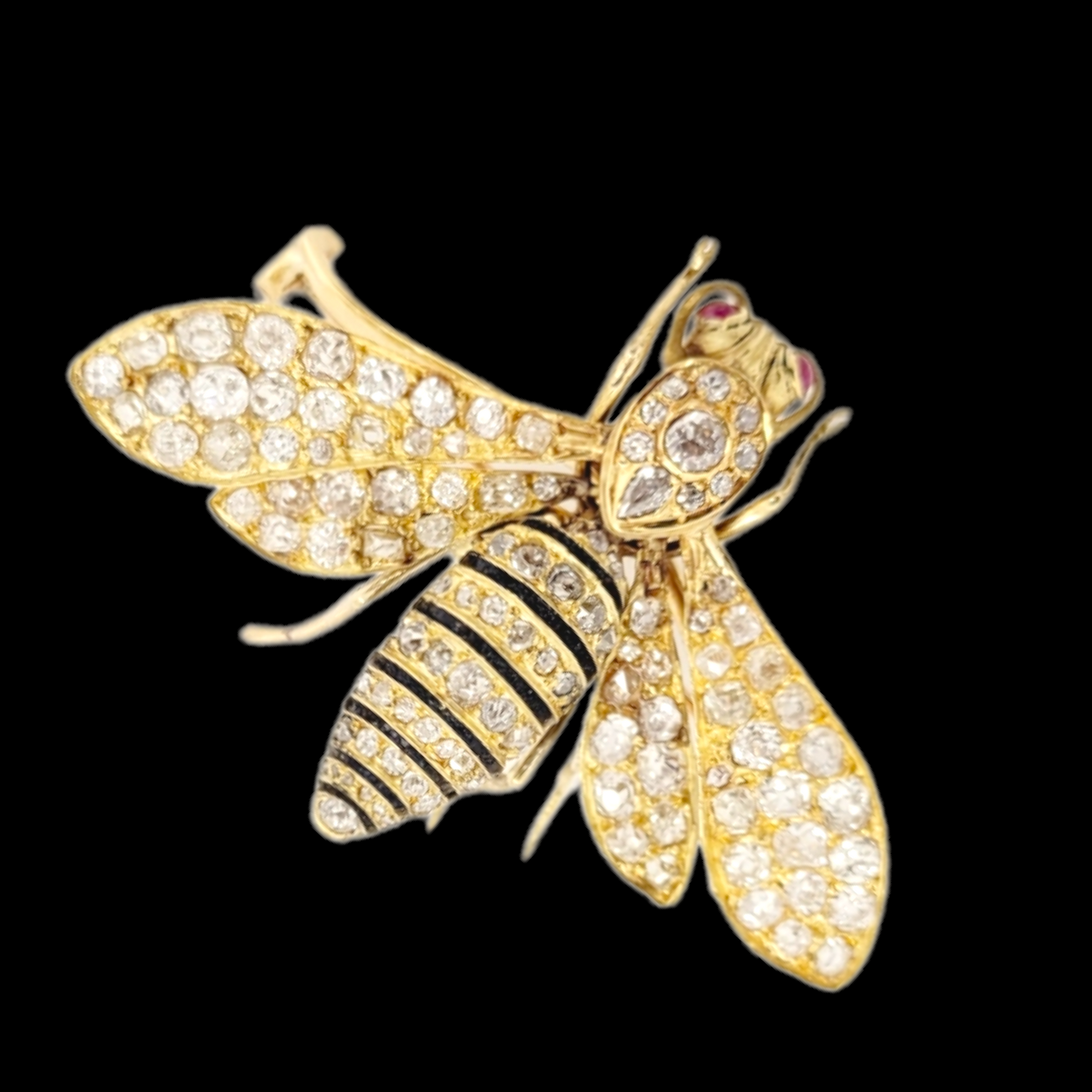 7cts of old cut diamonds set in 18ct gold, cabochon Ruby eyes and black enamel banded thorax. 40mm x 5.5mm