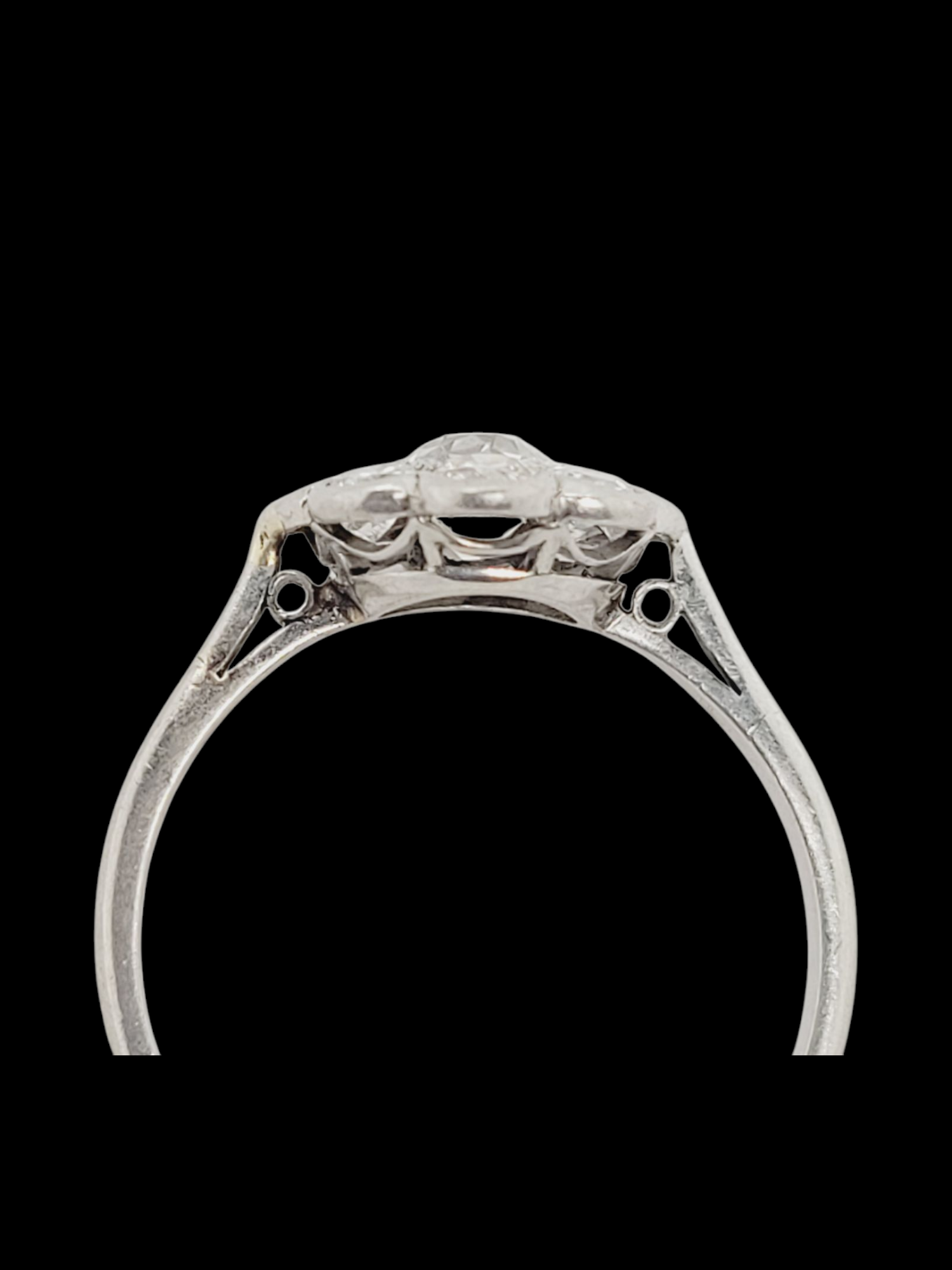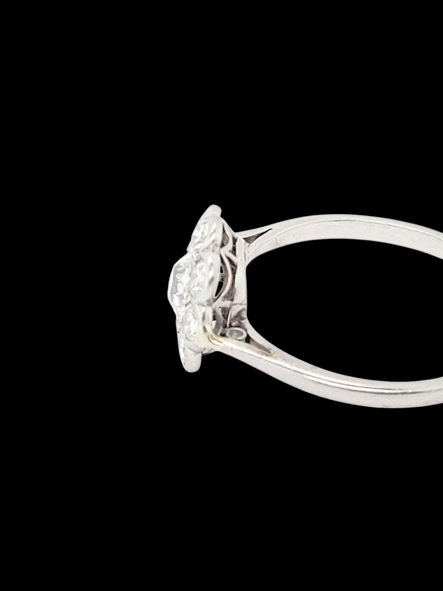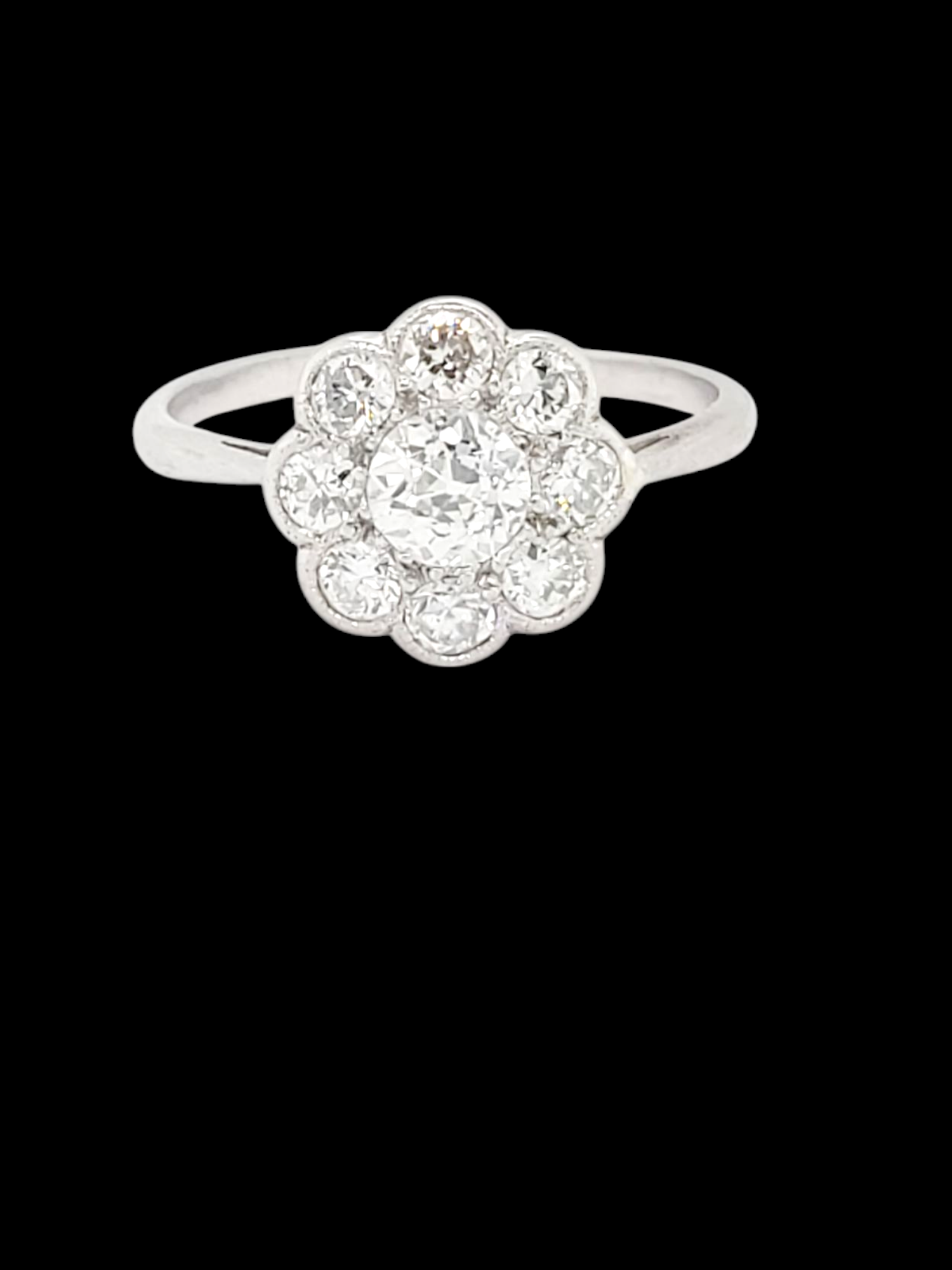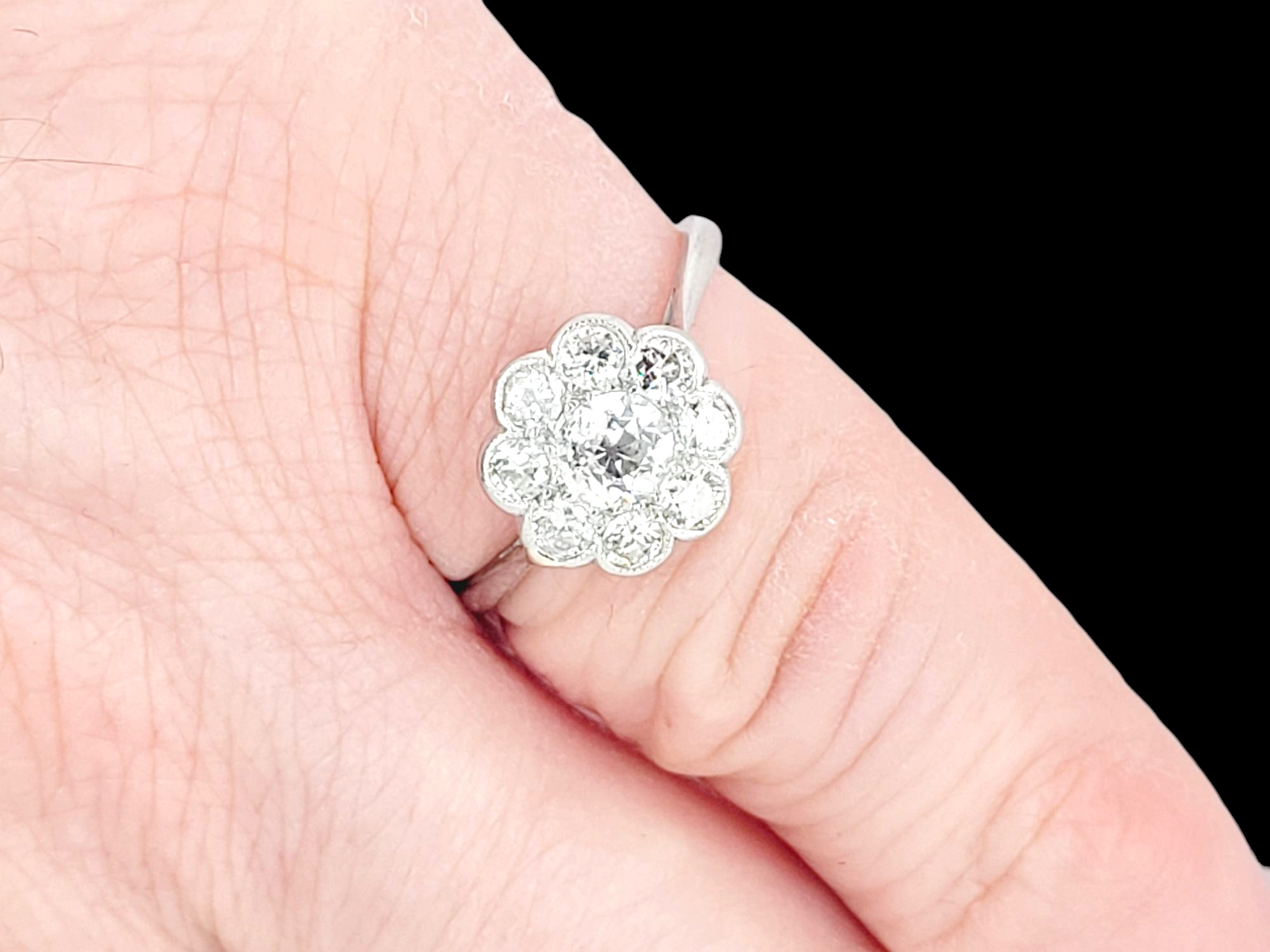 Old European transitional cut diamonds with 0.90cts G/h Vs1 set in a daisy cluster design in platinum. 11.5mm head size. English circa 1910. Currently finger size P 1/2 (U.S 8)