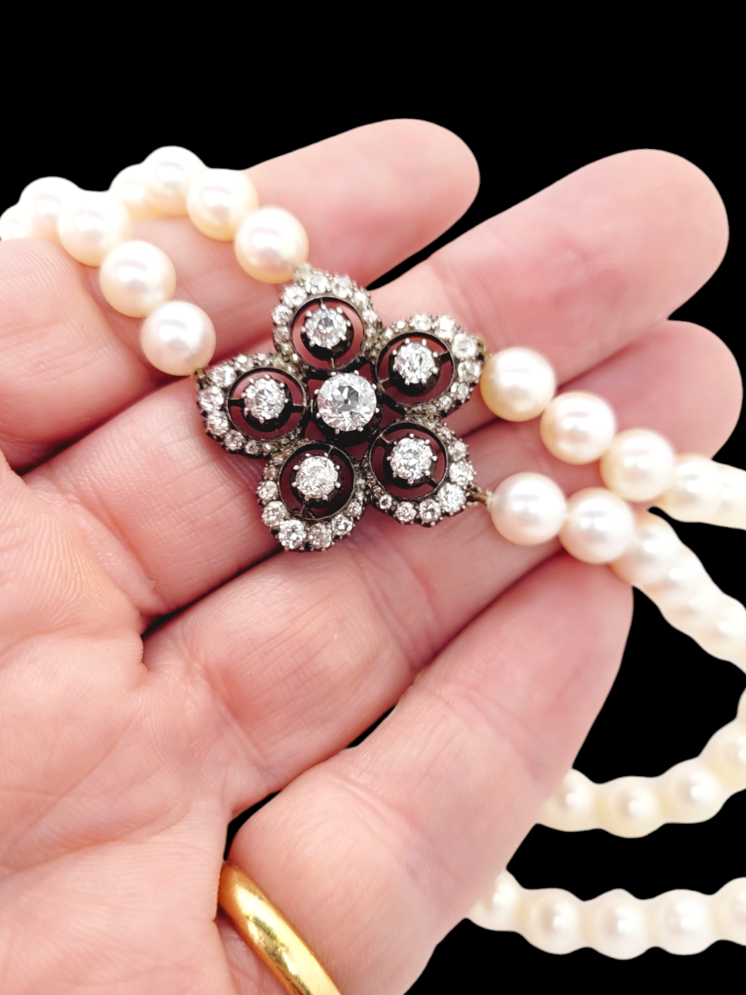 3.30cts of chunky old mine cut diamonds cut down collet set in silver and 18ct yellow gold in a five petal floral design.30mm diameter. English circa 1870. Two rows of 7.5mm Akoya salt water cultured pearls 14 inch top row (36cms) 15 inch bottom row (38cms)