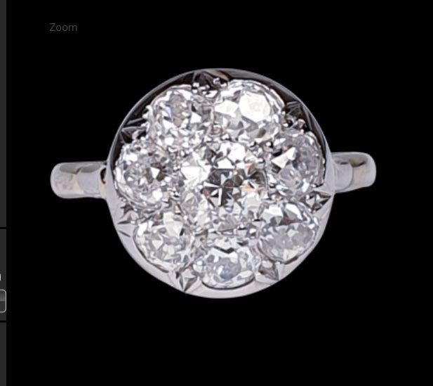 lovely old cut diamond cluster ring set with 2.25cts. Head size 12.5mm. Platinum head with a white gold shank. circa 1900