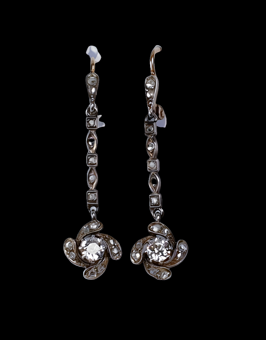 Stylish propeller cluster drops suspended by a row of diamonds in box and navette shaped collets approximately 1ct total diamond weight set in silver front and gold back. 35mm drop (1.4 inches) English circa 1900
