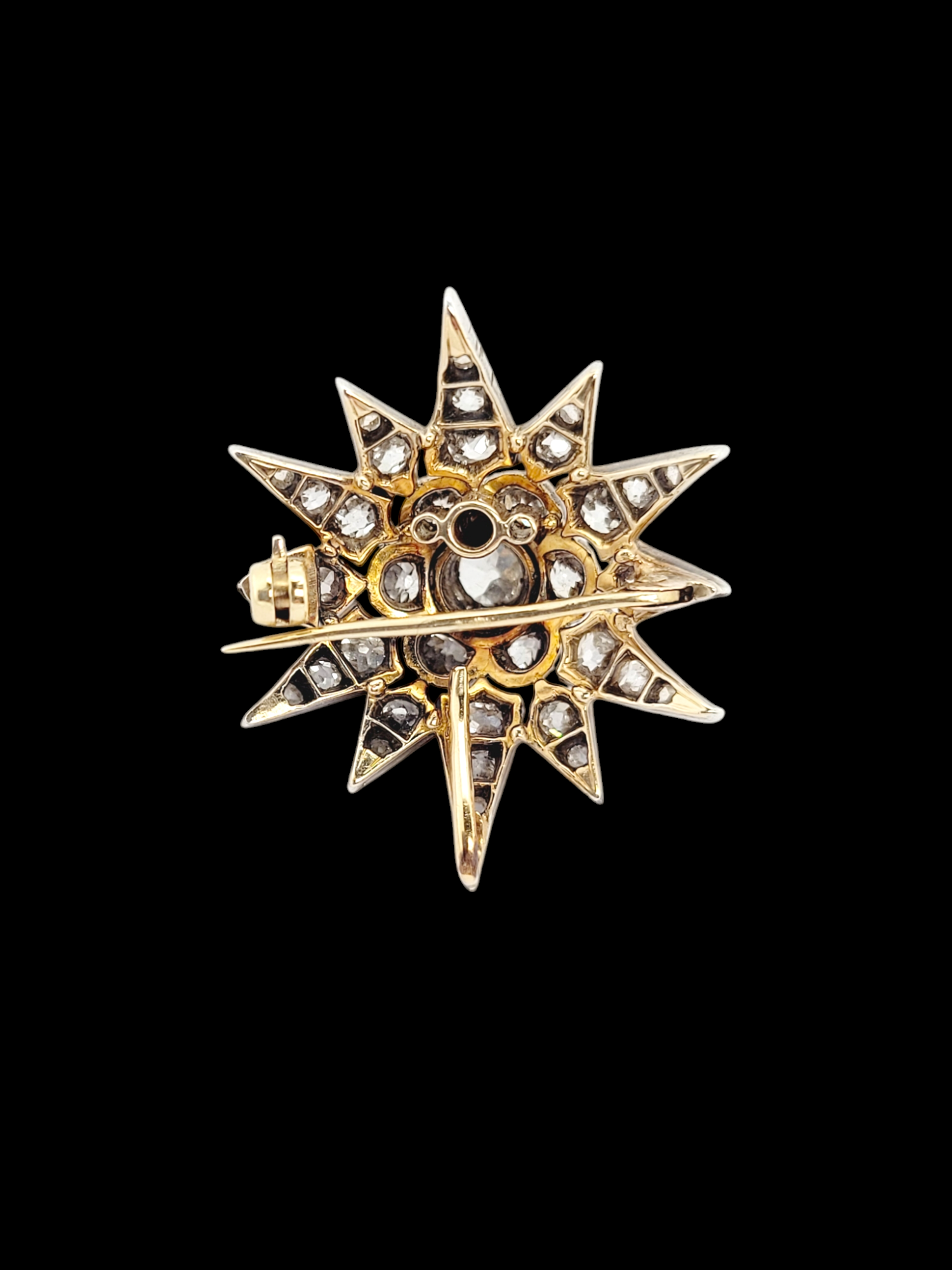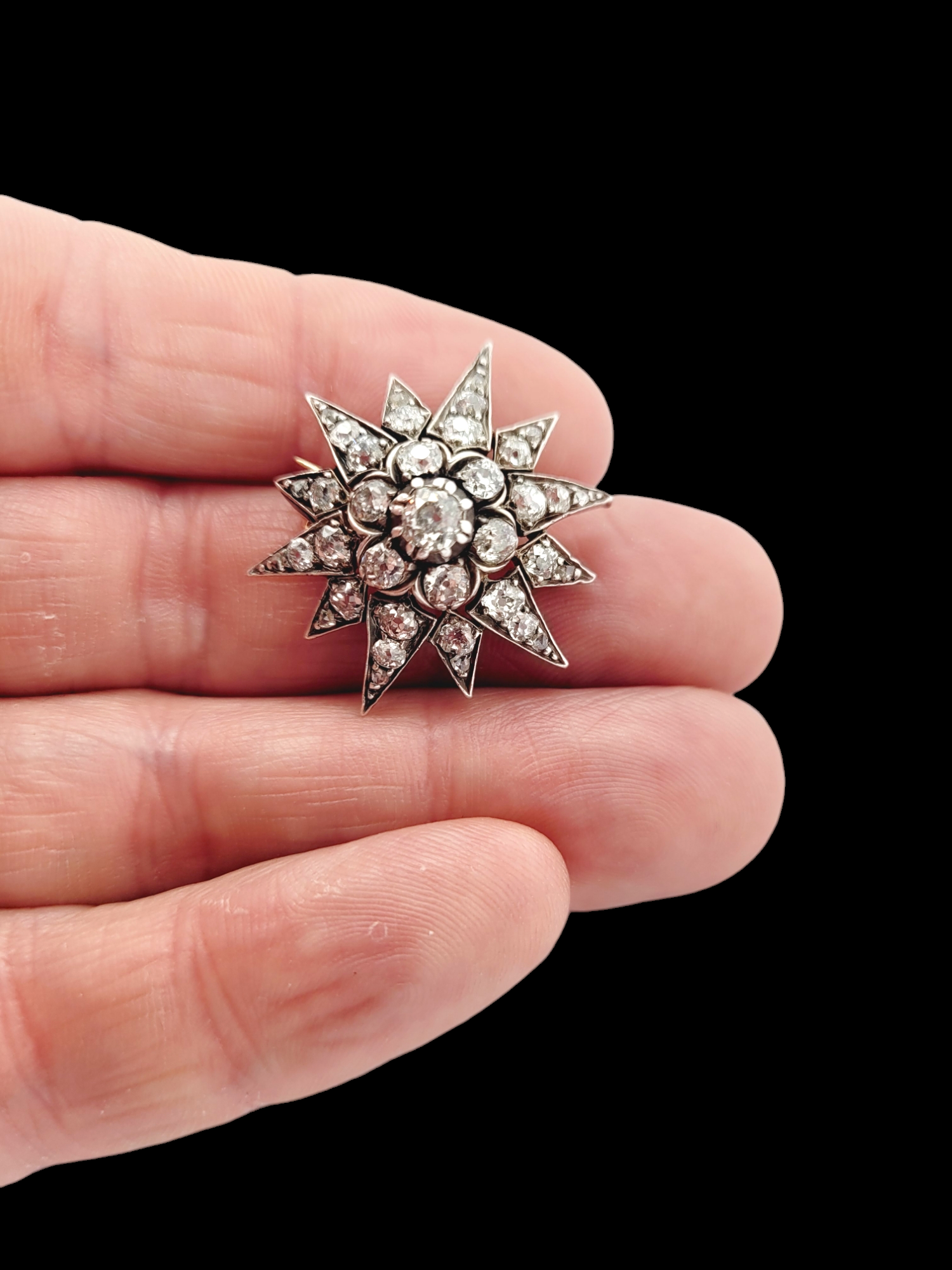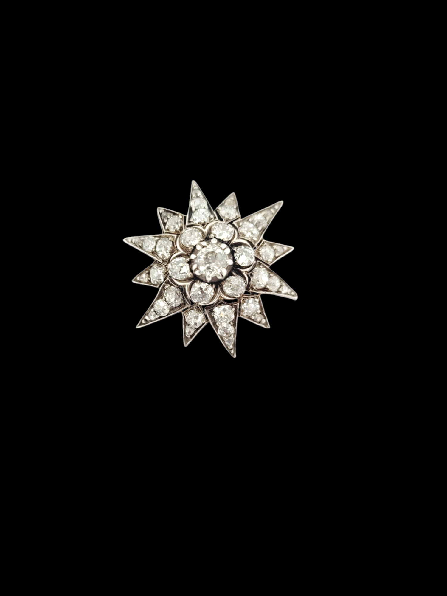 2cts of old mine cut diamond set in silver and gold, 35mm diameter. English circa 1870