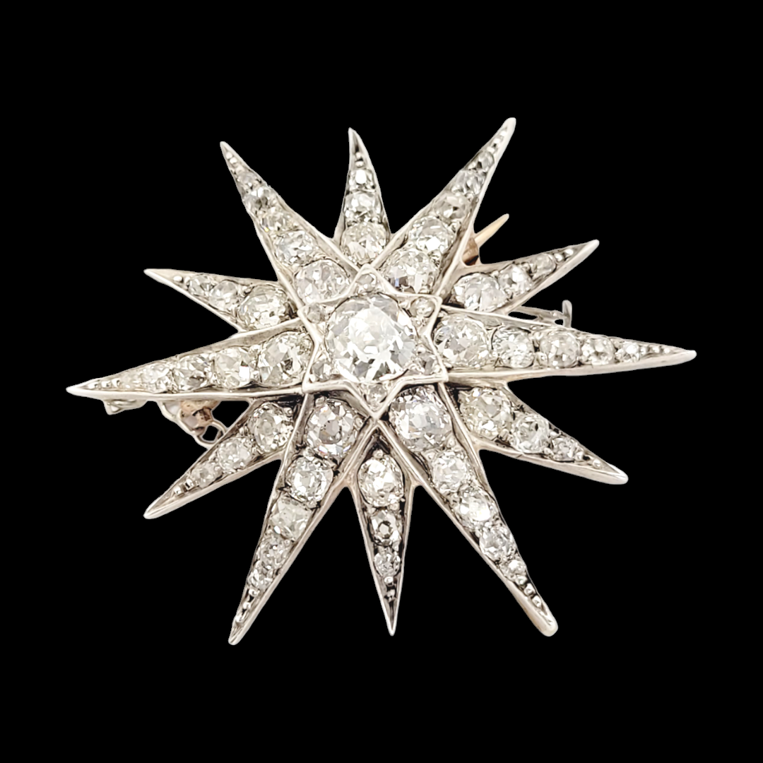 4cts of old mine cut diamonds set in silver top and 18ct gold back. Brooch pin with pendant pigtail to use as a pendant or to hang something from. 40mm diameter. English circa 1850