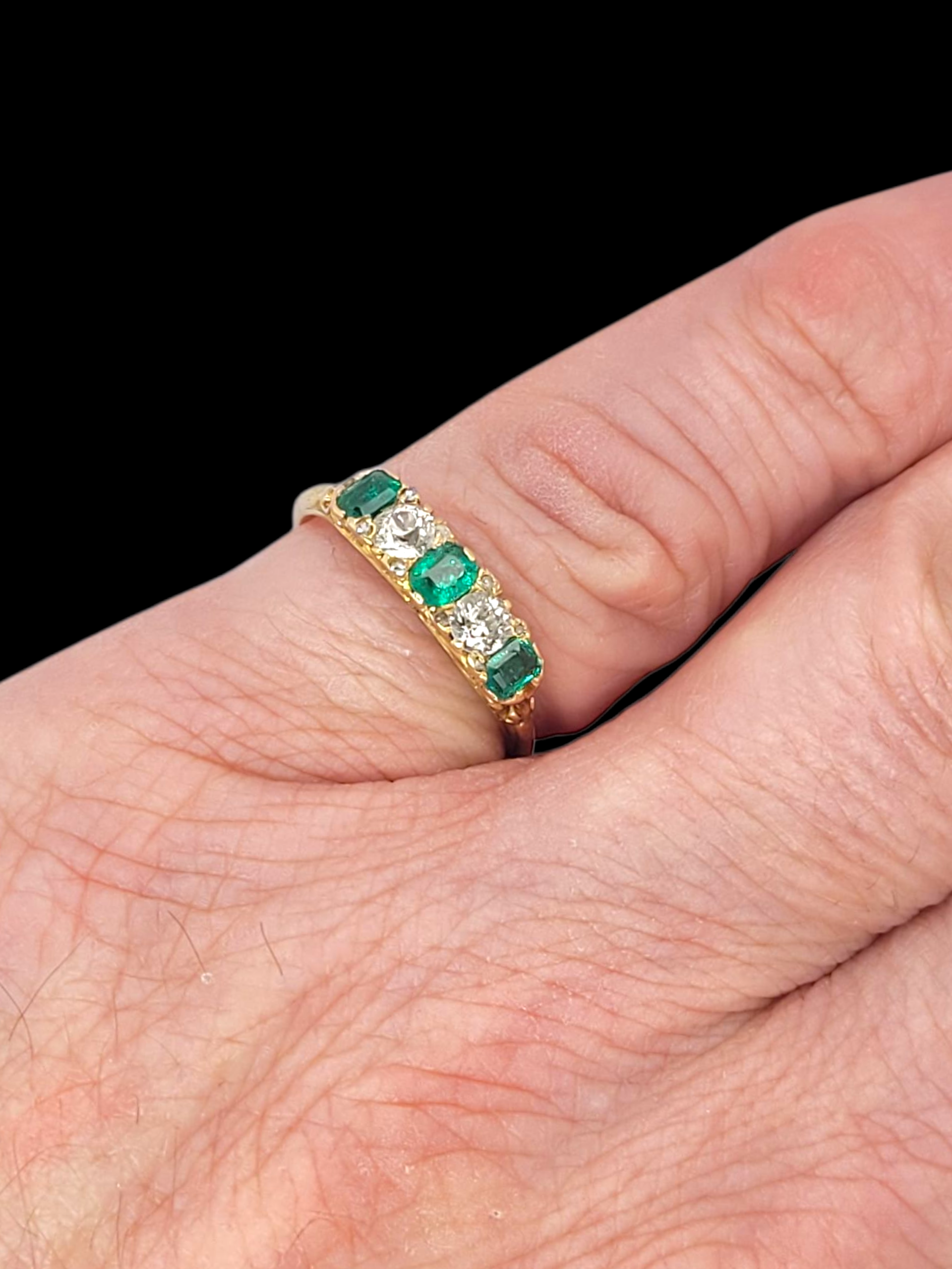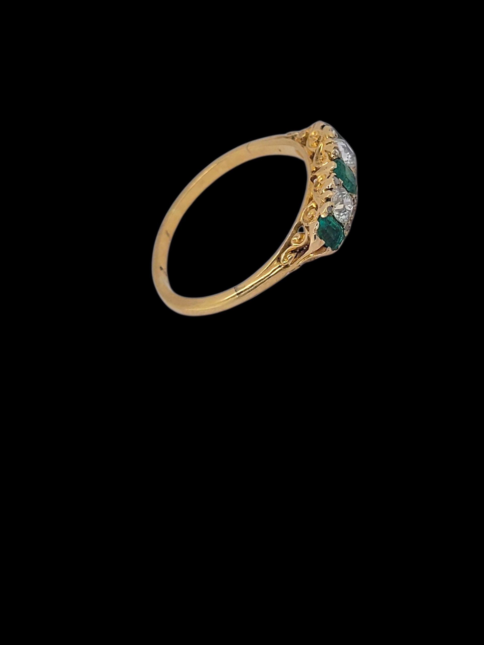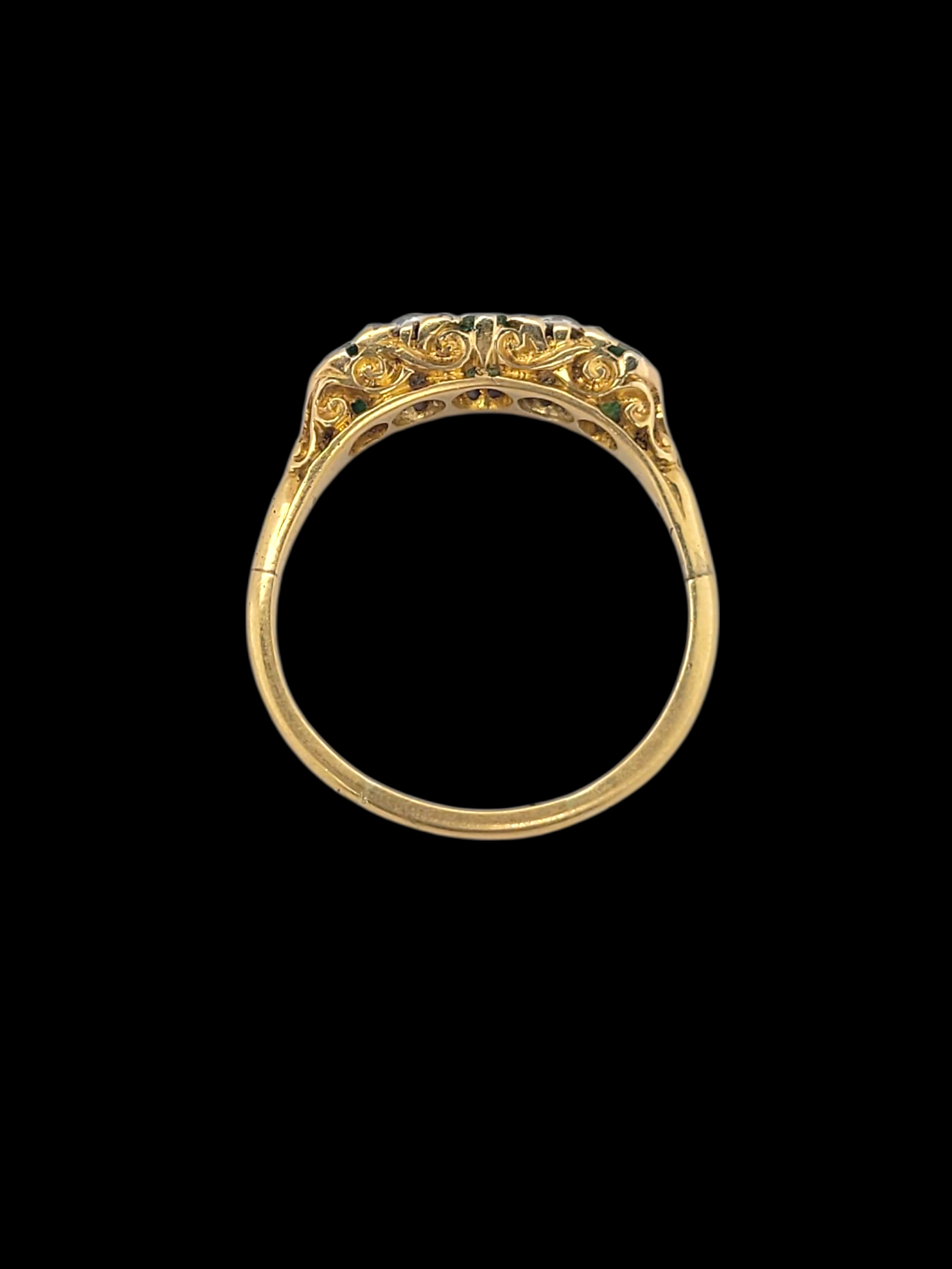 Antique emerald and old mine cut diamond ring. Three vibrant emerald cut emeralds (0.30cts) with old cut diamonds and 8 rose cut diamonds (0.20cts) claw set with carved half hoop scroll work gallery. 4mm x 15mm. English circa 1890. Currently finger size N (U.S 6.75)