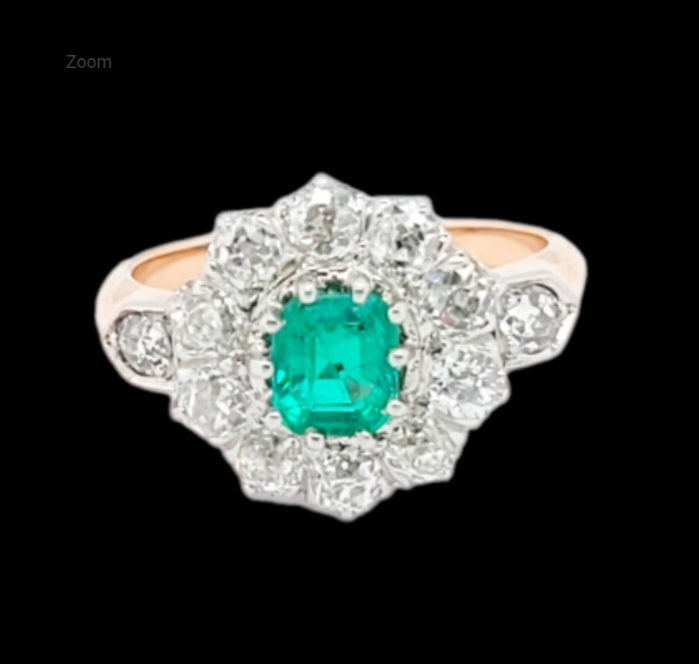 6mm x 5.2mm x 3.2mm vibrant intense Colombian emerald (0.70cts) surrounded by 1.50ct of old mine cut diamonds and 0.20ct total diamond shoulders set in platinum with 18ct rose gold shank. English circa 1895. Head size 14mm x 19.5mm. Currently finger size M