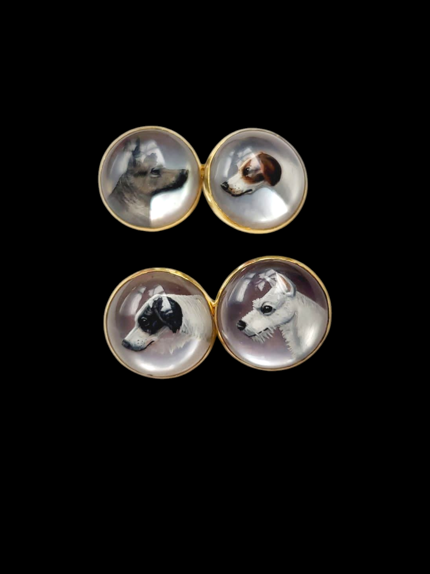 Great gift idea for him! Country gentleman must! Antique rock crystal cufflinks featuring four different dog heads engraved intaglio and painted beutifully on a mother of pearl field. 13.5mm diameter bezel set in 18ct hallmarked yellow gold with trace chain link. English circa 1900.