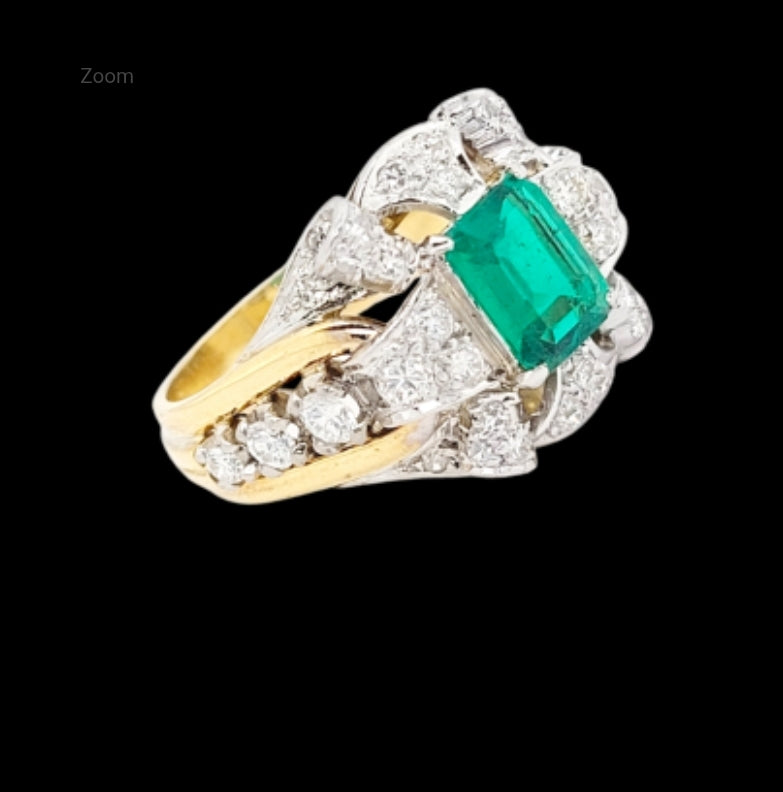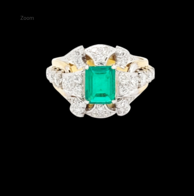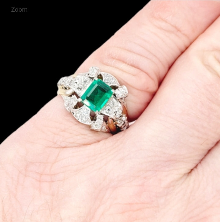 Fine 7mm x 6mm x 2.8mm (0.81ct calculated) Columbian emerald cut emerald within white gold scroll design with 18ct ribbed shank. Head size 13.5 x 14mm. 0.30cts diamonds. Currently finger size L (U.S 5.75) English circa 1950