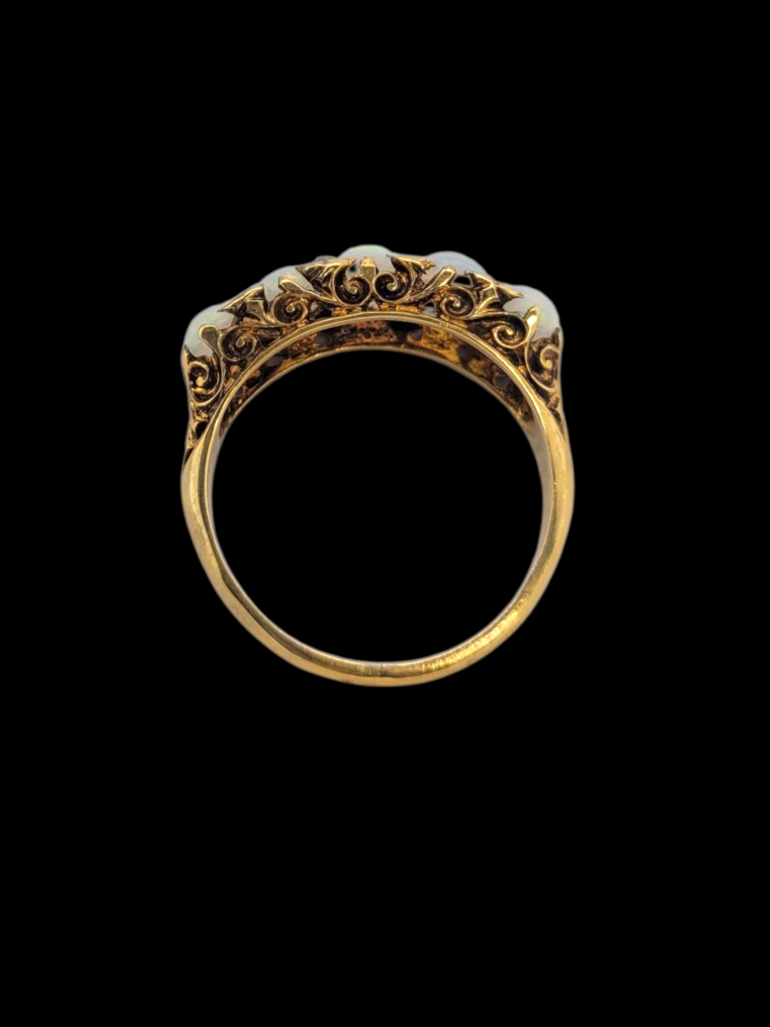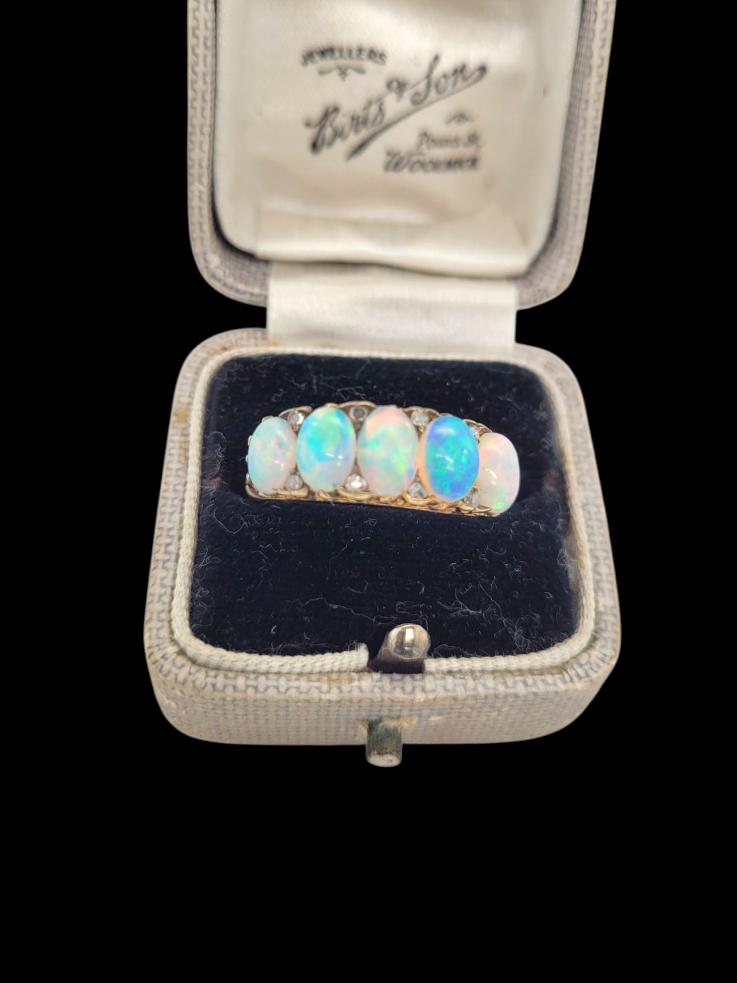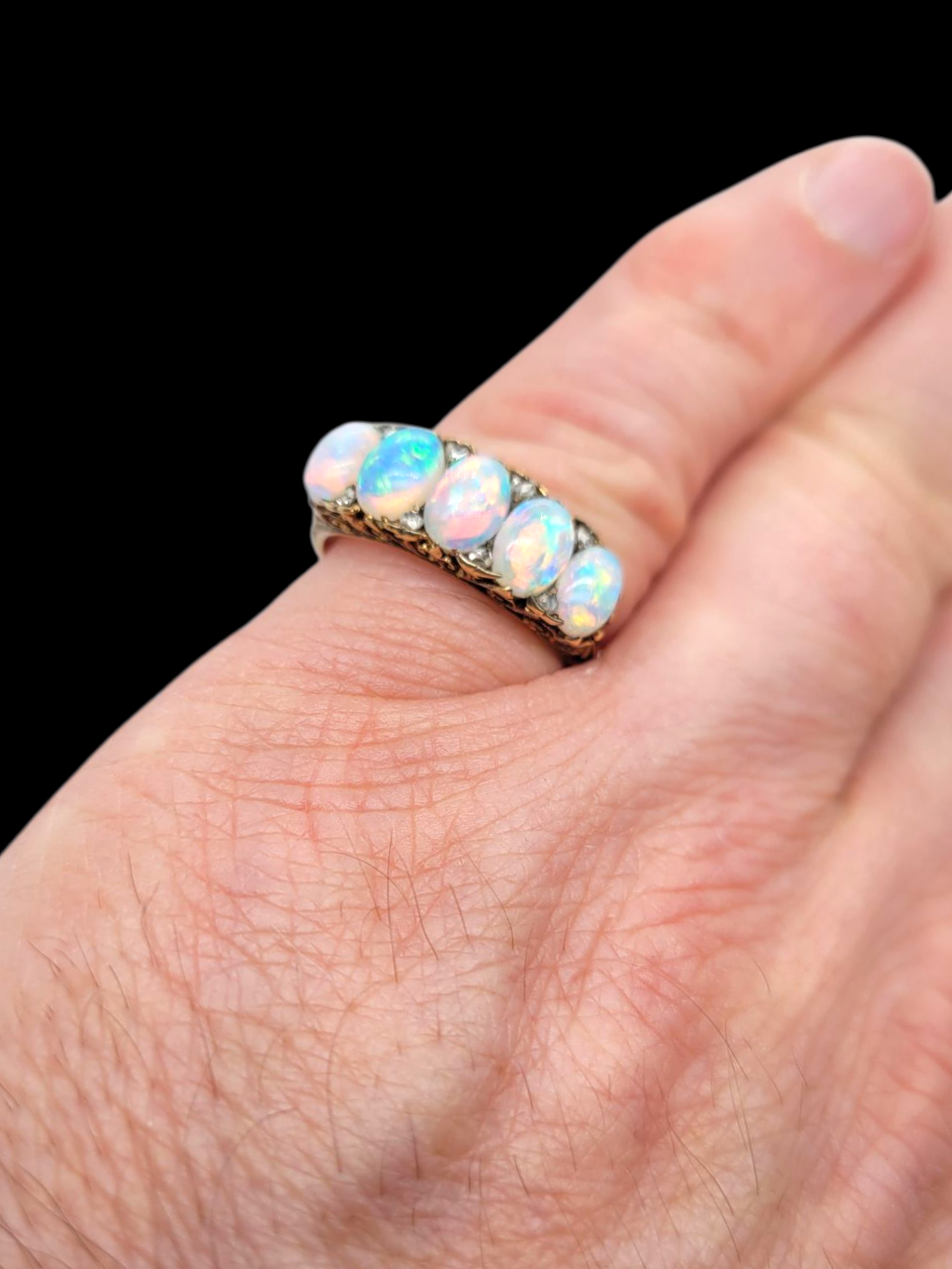 Antique five stone opal and diamond carved half hoop ring SKU: 8141