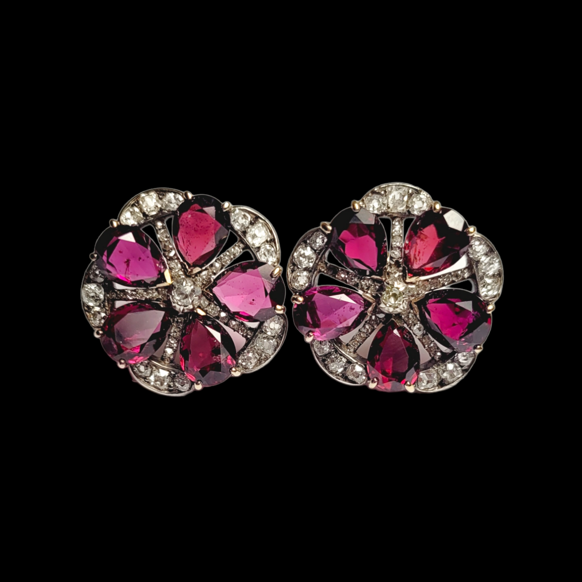 Rhodolite and old mine cut diamond 3.10cts earrings 25mm diameter. English circa 1880.