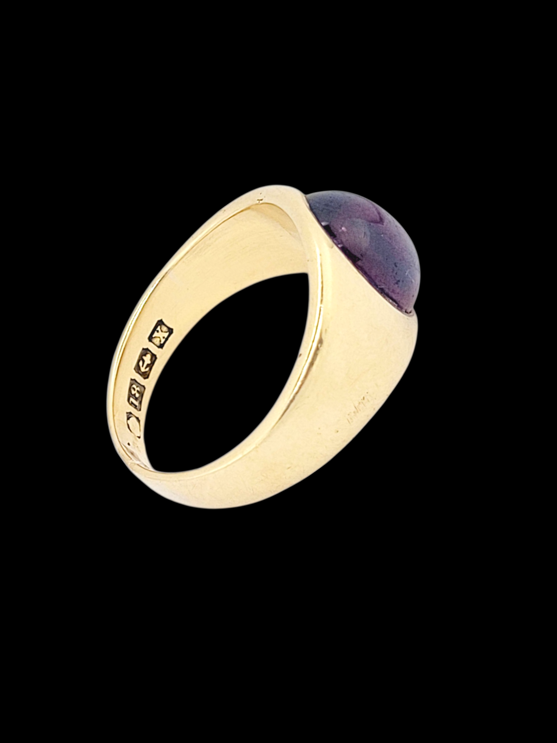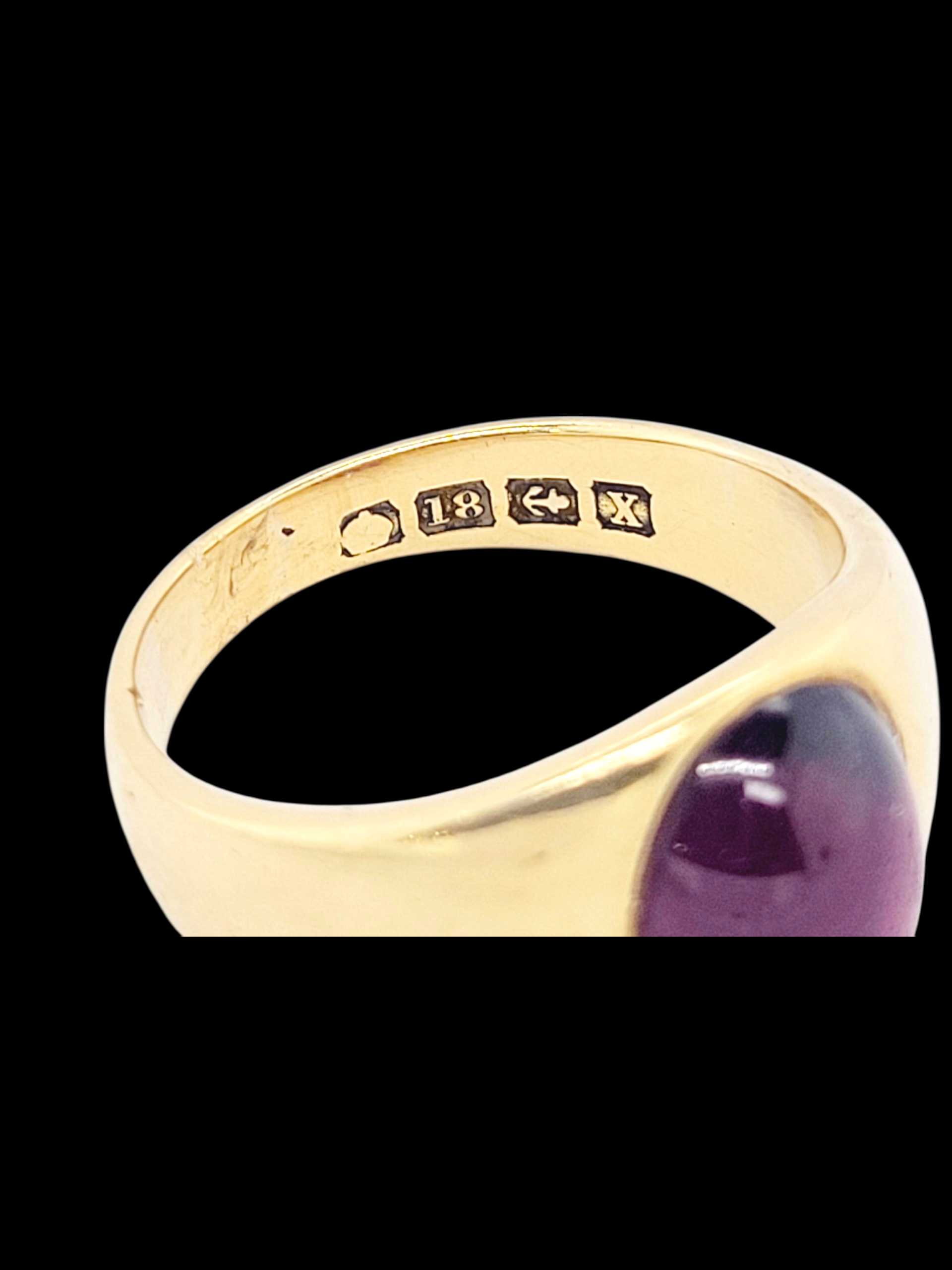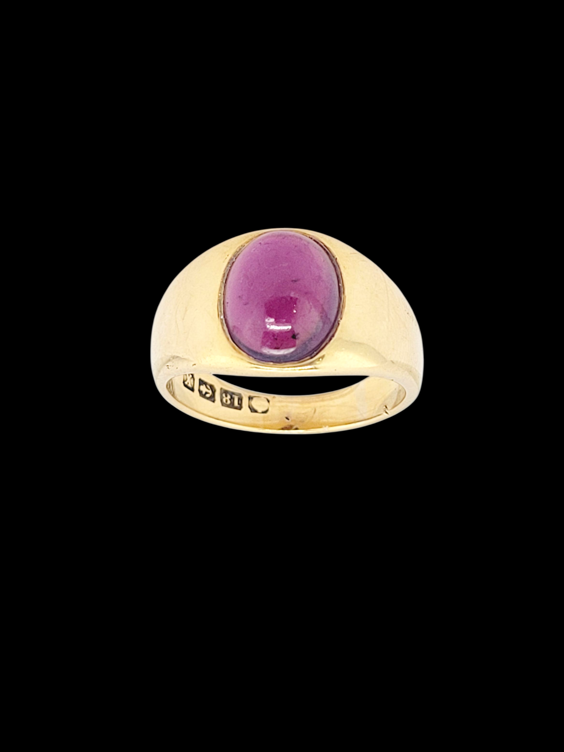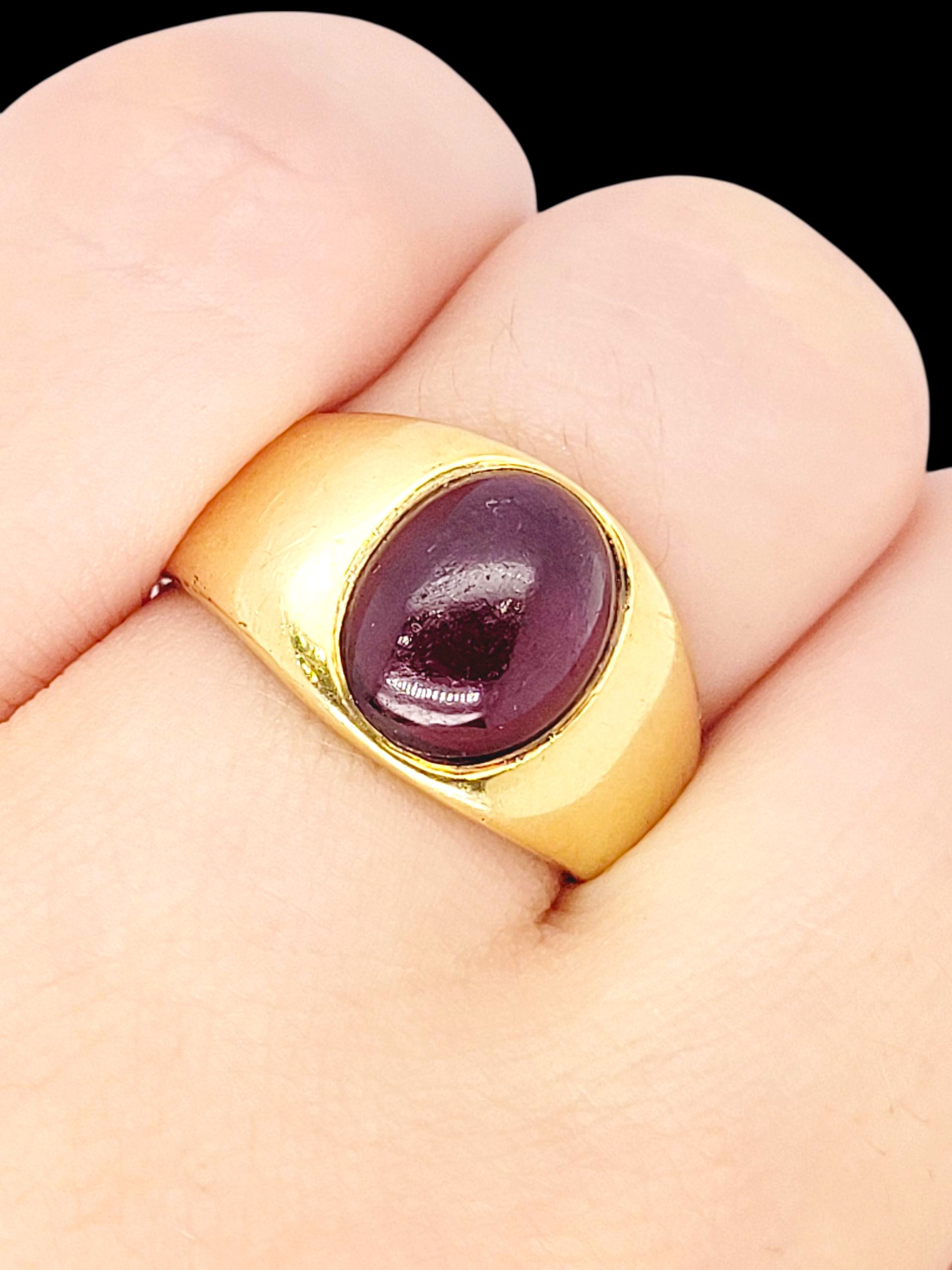 Heavy 18ct buttery yellow gold signet ring hallmarked BIRMINGHAM 1922. Juicy wine red oval cabochon garnet 11mm x 9mm. Great for everyone, everyday, everywhere! 8 grams. Currently finger size N 1/2 (U.S 7)