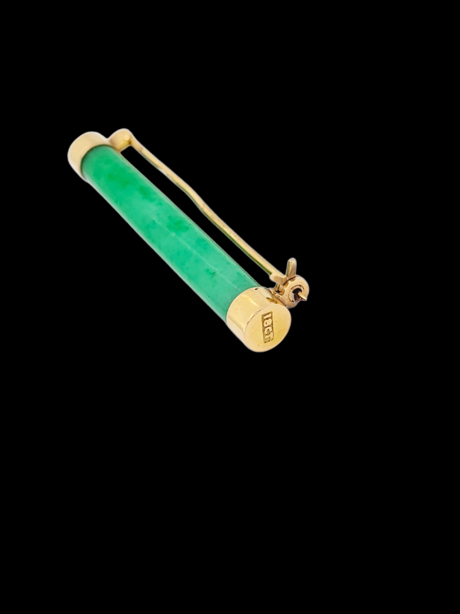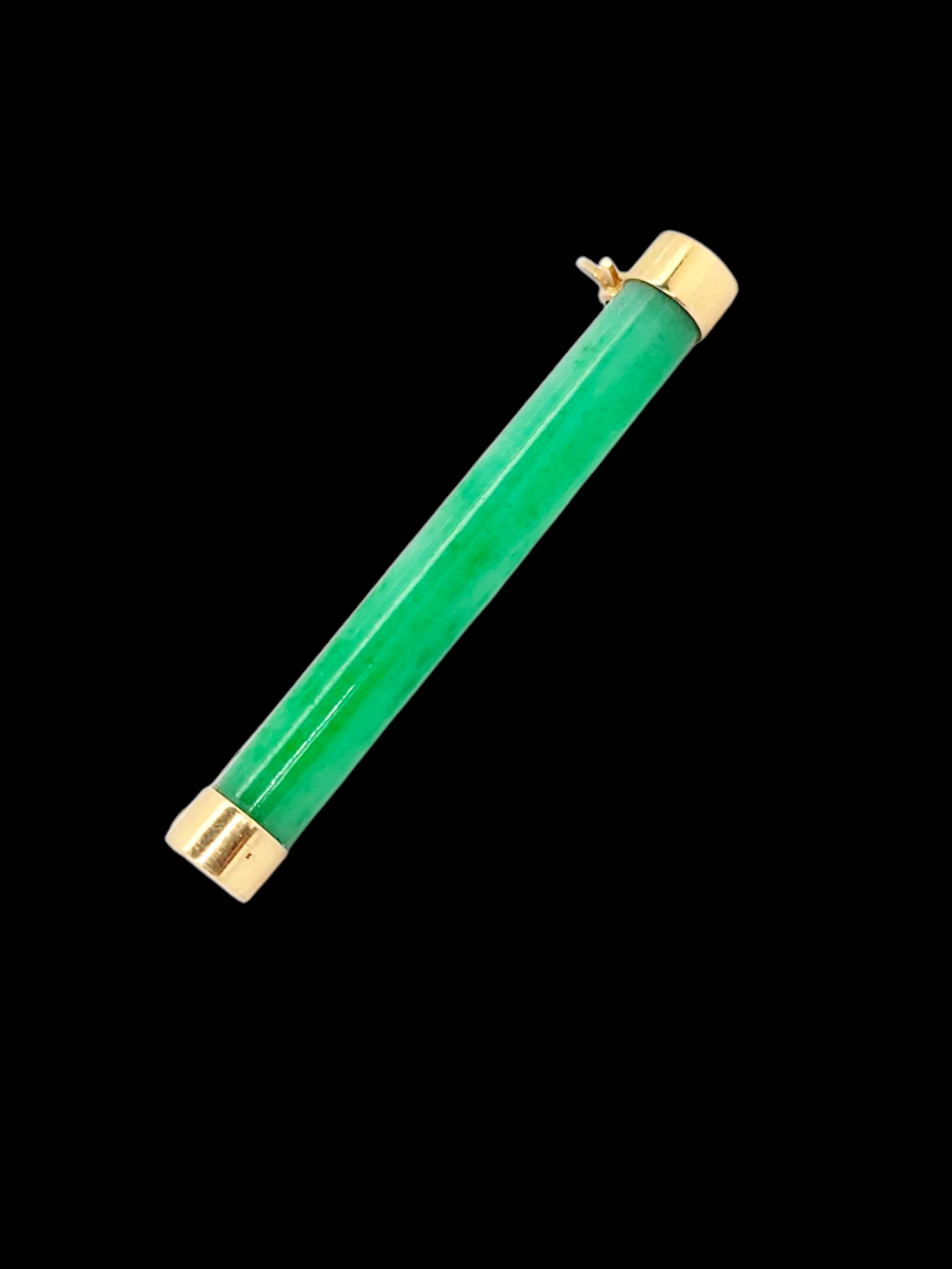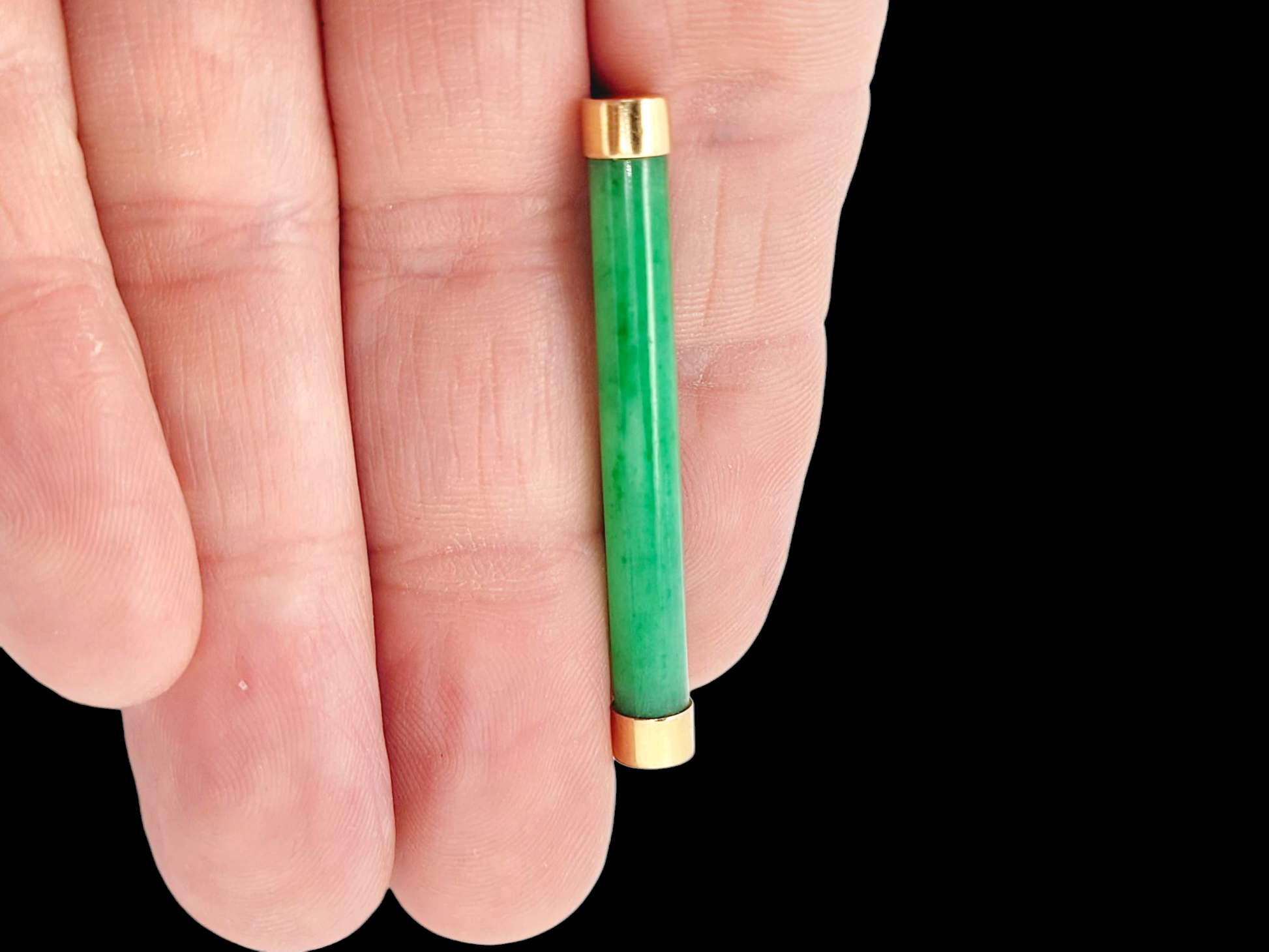 Attractive natural Burmese jade column 5.6mm diameter x 43mm long. Capped in hallmarked 18ct yellow gold 3.8mm. English circa 1900. Even medium colour with some translucency and molting. A good example of old Jade material, often collected for its positive chakra promoting harmony and balance.