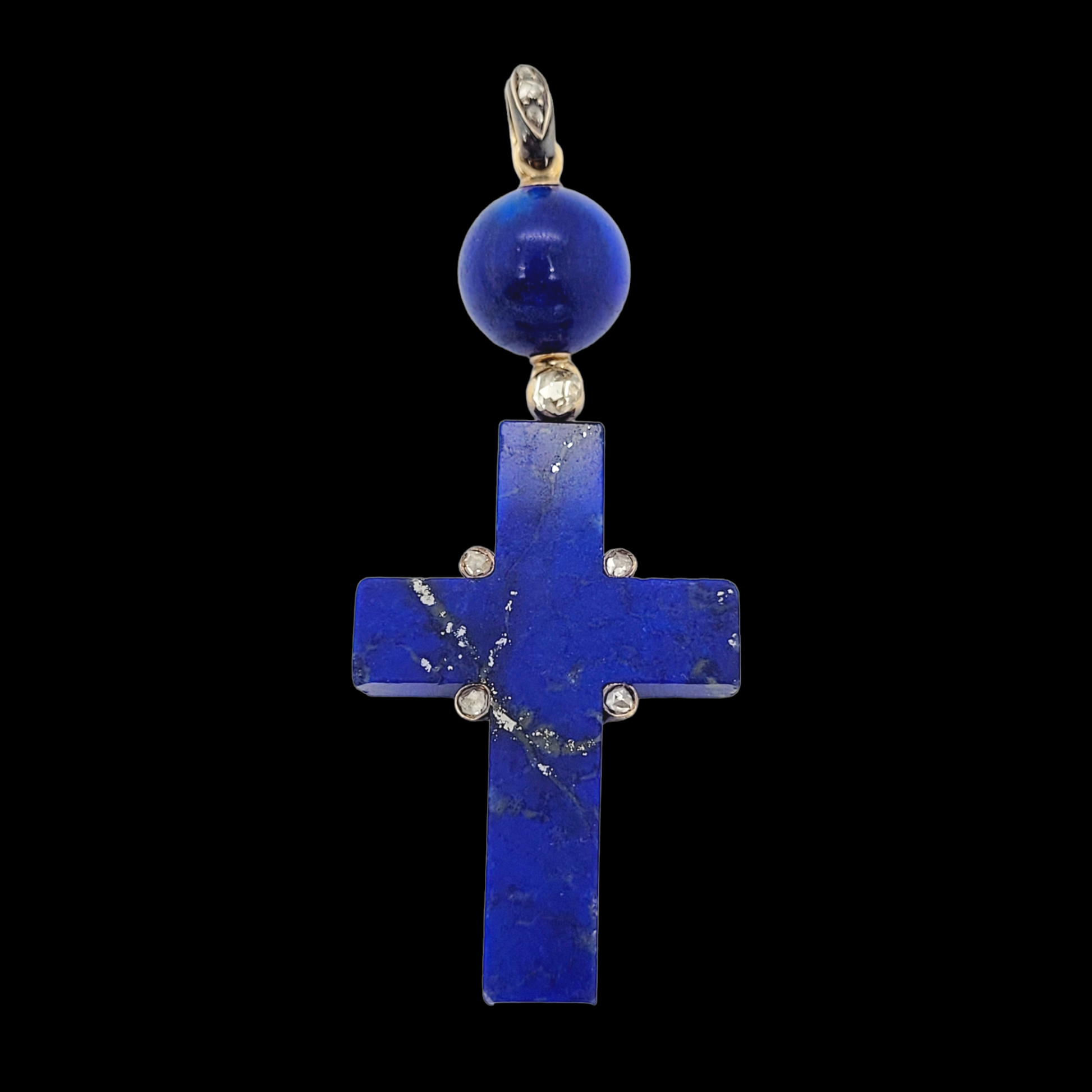 19th century pendant with a lapis lazuli cross with four rose cut diamonds, a diamond top, lapis bead with a rose cut diamond bale, set in silver and gold. English circa 1870. 55mm x 22mm