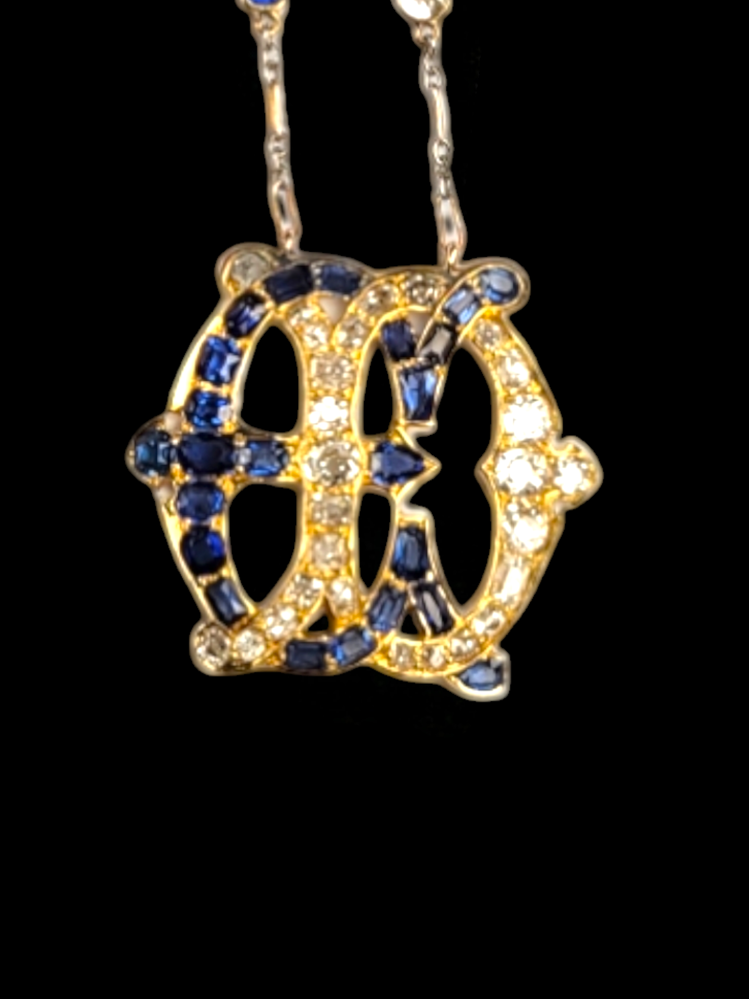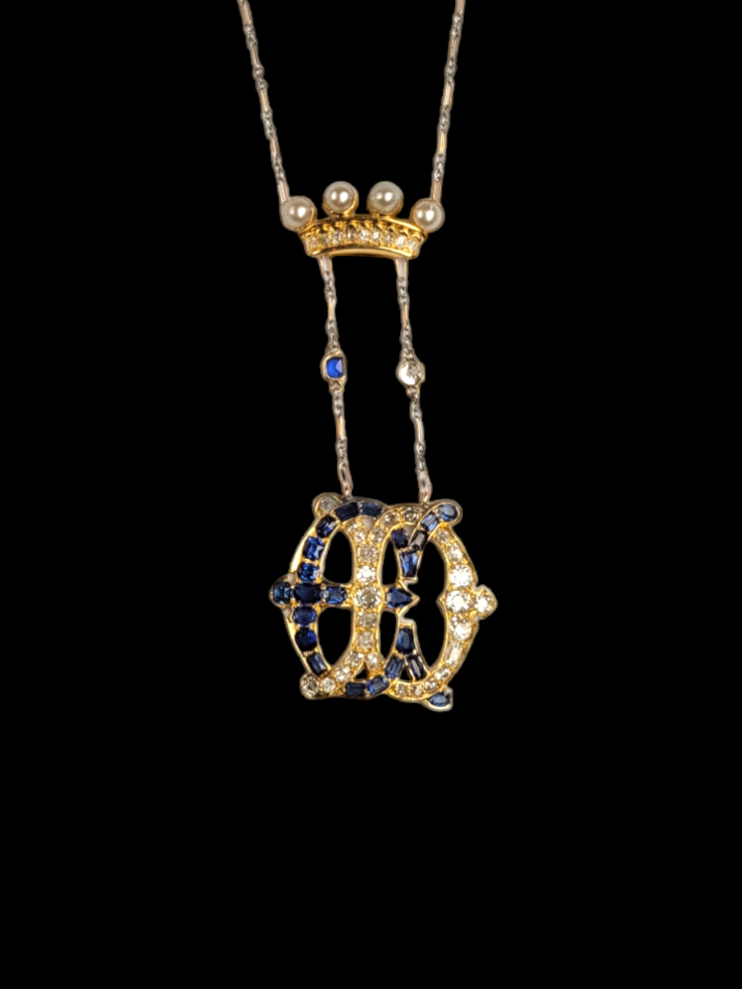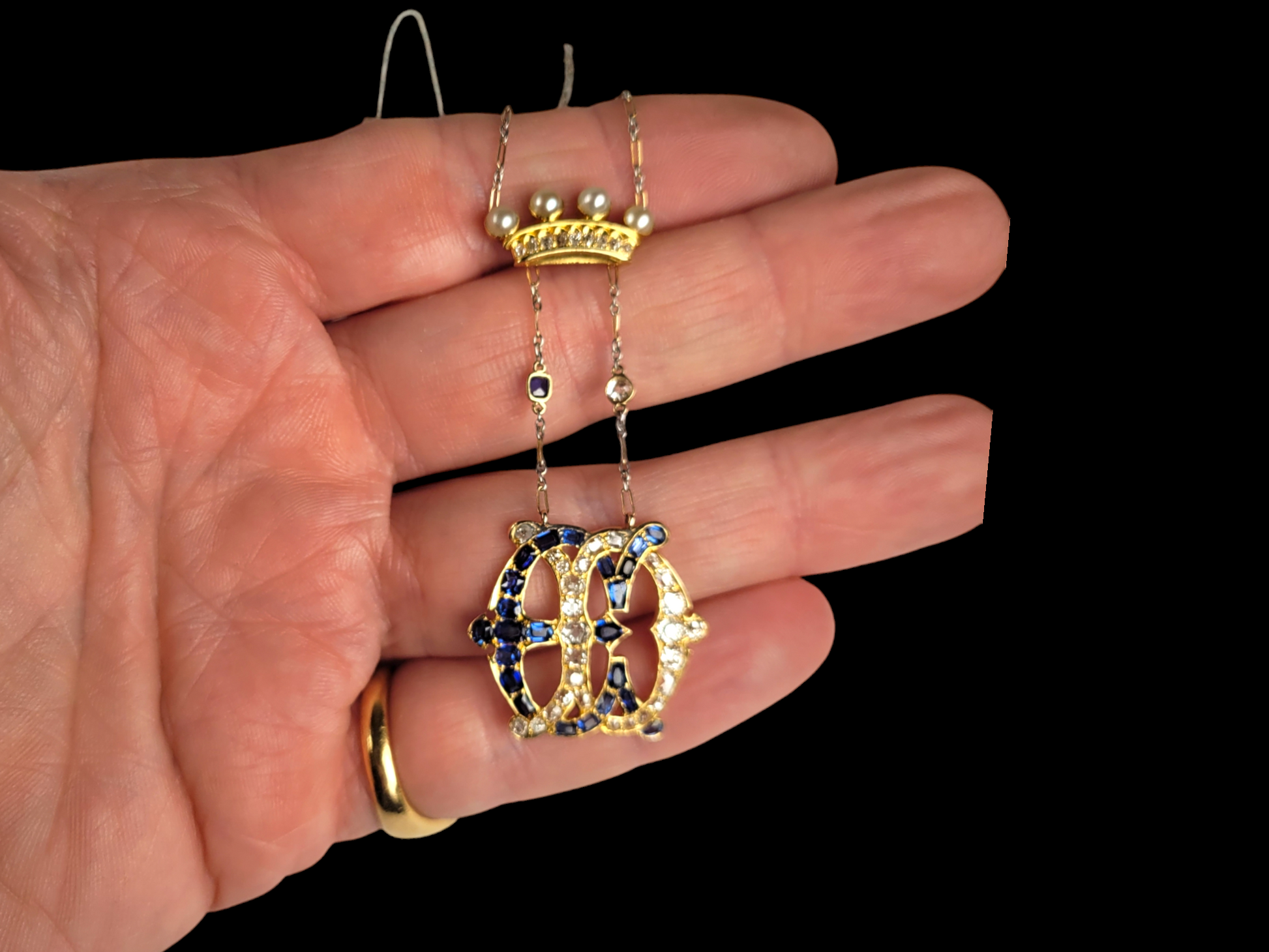 Edwardian marriage pendant with a four pearl and diamond crown suspending an entwined cypher of E an D old cut sapphires and diamonds. 25mm diameter. 1.60cts of old mine cut diamonds 2cts of old cut sapphires. Trombone gold andd three platinum fine chain 16.5 inches (42cms)