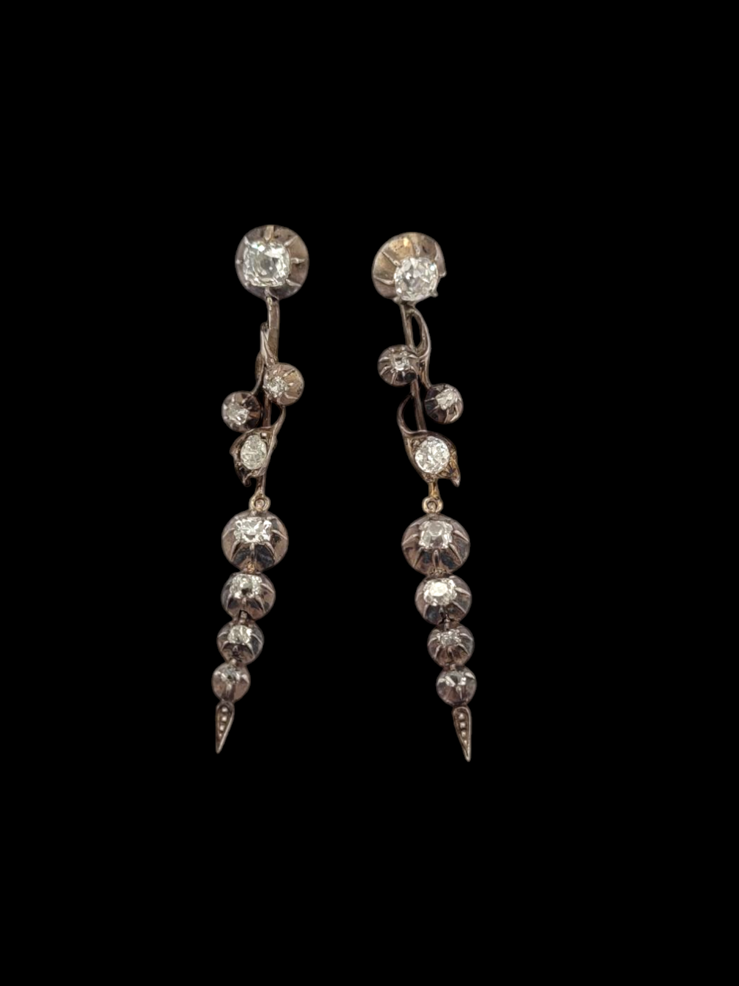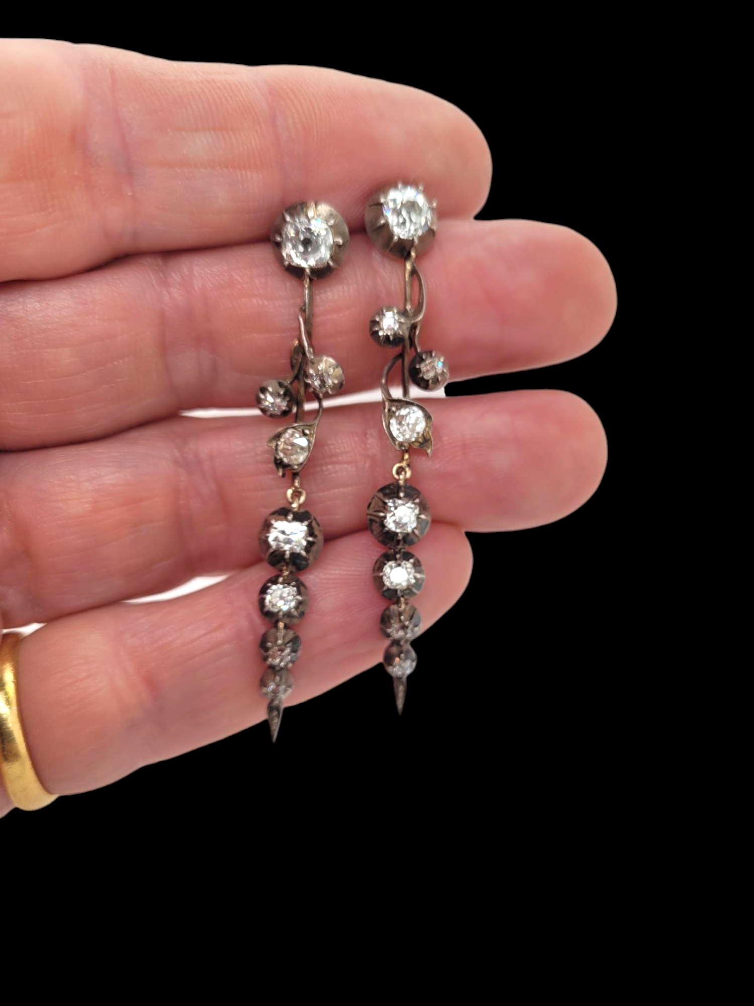 Old mine cut and table cut diamonds set in cut down collets silver front and yellow gold backs. 2.80cts of charming old cuts with large tops suspending floral design and articulated graduating tassel. English circa 1860.