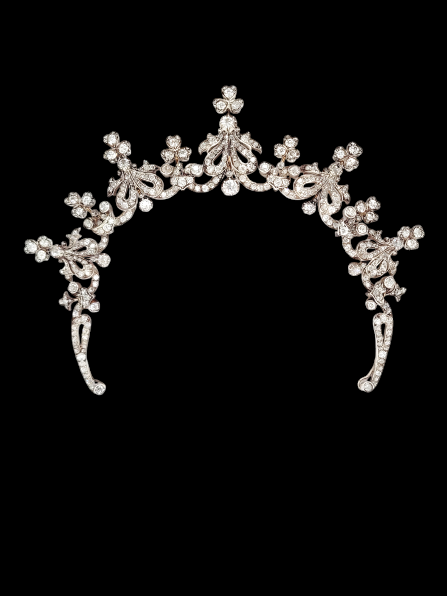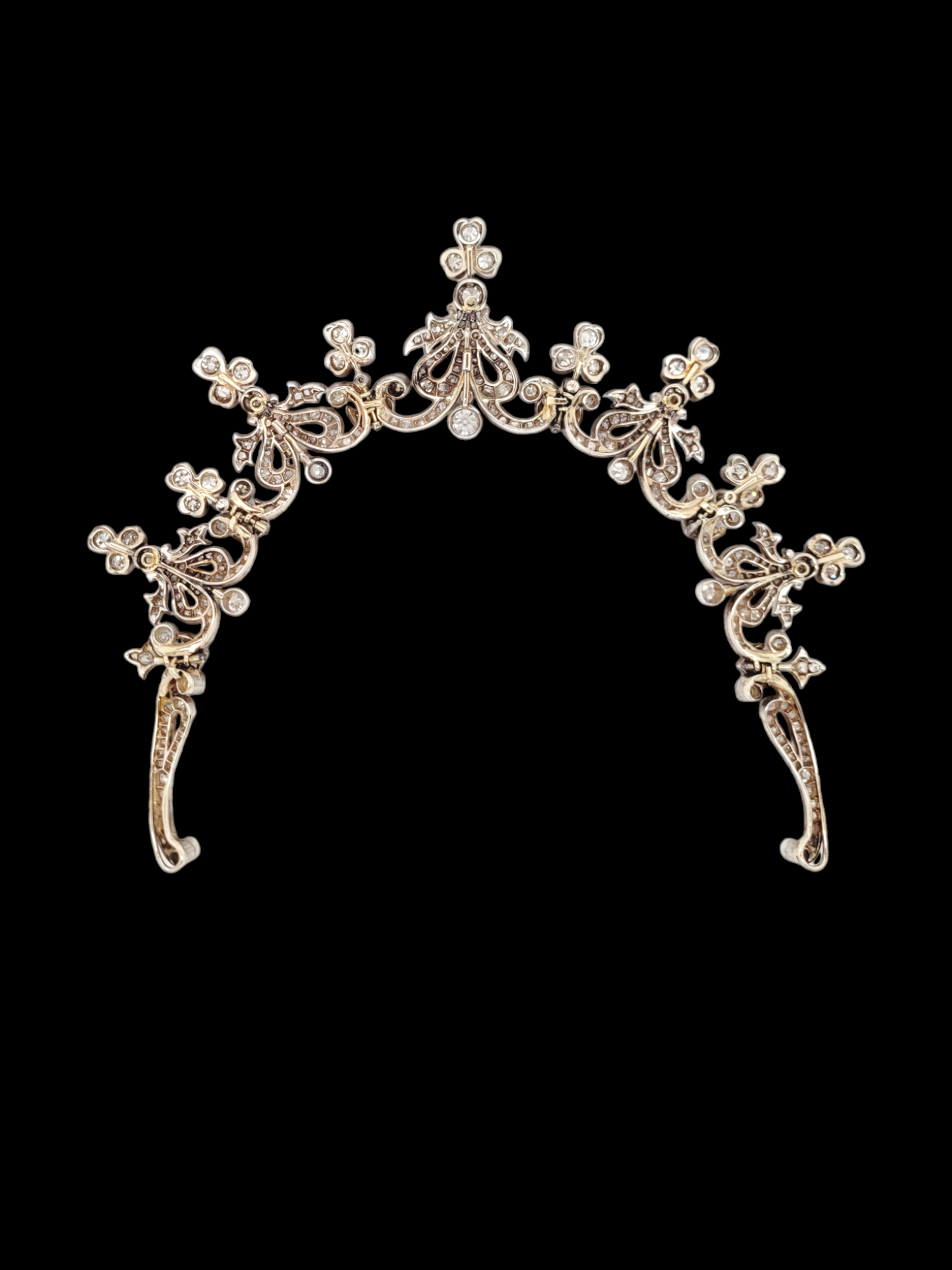20cts of old mine cut diamonds set in cut down silver and gold. English circa 1850. Graduating floral scroll work with trefoil tops. 16cm diameter 43mm high 24cm circumstance. Can be worn as necklace with a ribbon