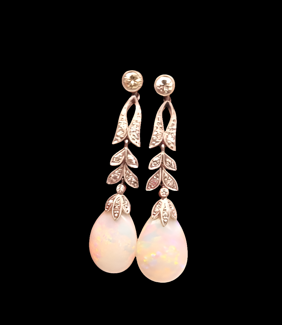 Edwardian diamond and opal drop earrings, diamond top suspending a floral diamond leaf design with trefoil diamond cap holding pear drop opals (15mm x 10.5mm x 5mm) 0.30cts of diamonds. 42.5mm long. English circa 1905.