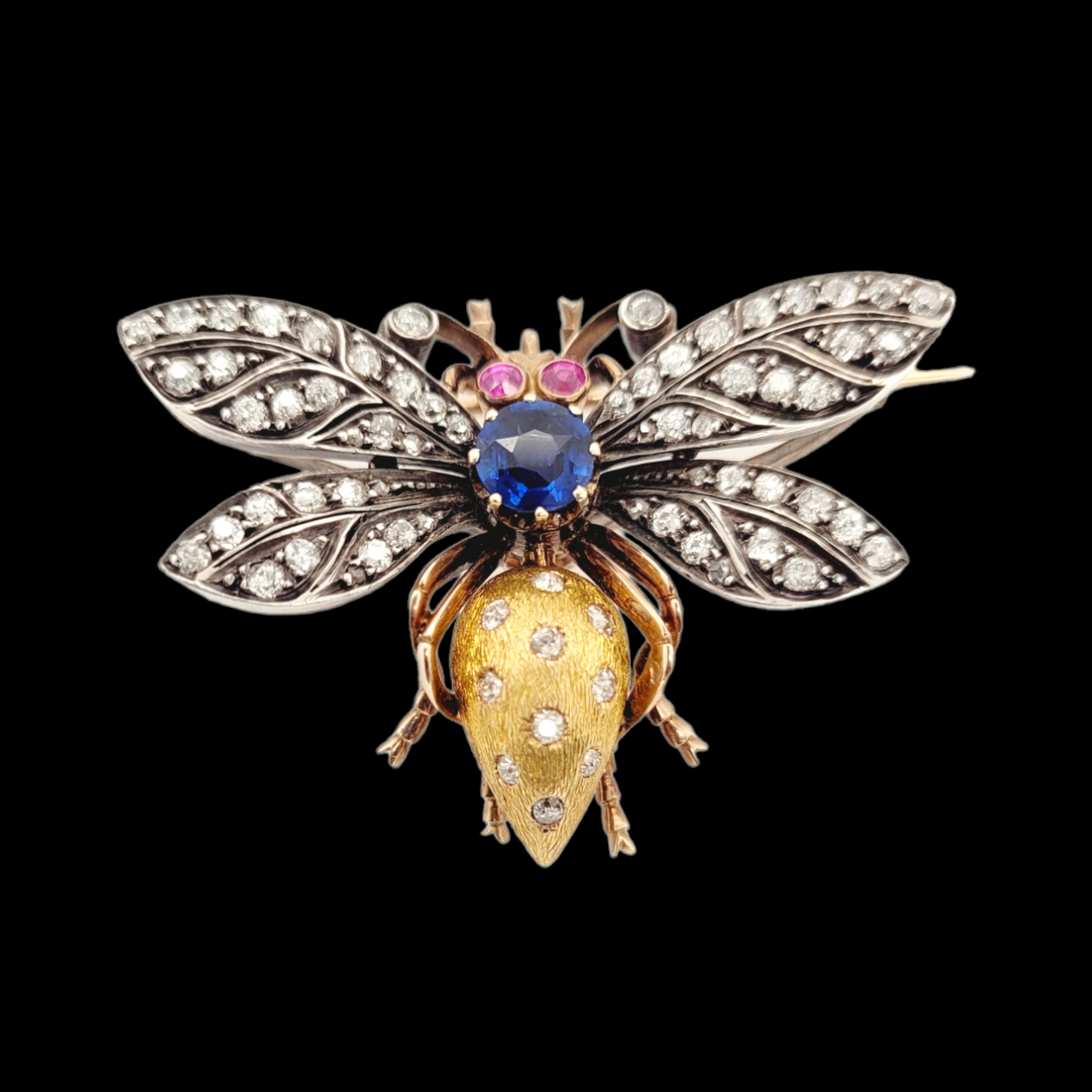 Gemset bug brooch with diamond set wings and antennae, ruby eyes, a 1.20ct sapphire body and an old mine cut studded brushed gold thorax. French circa 1860 (35mm x 45mm)