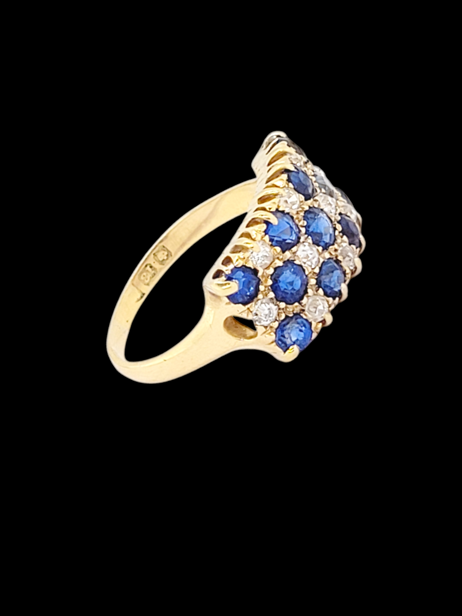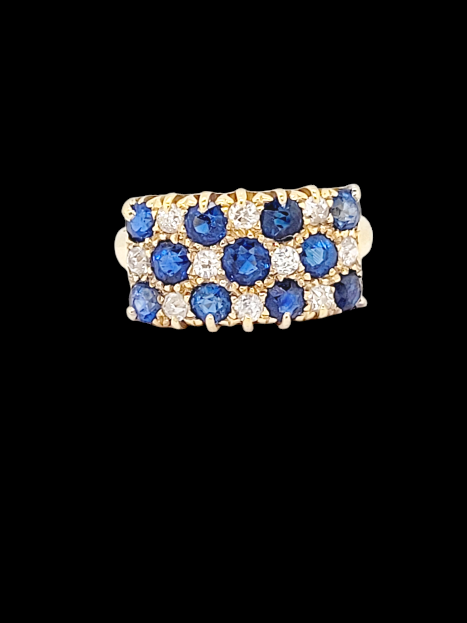 Three row sapphire and diamond chequer board ring with 0.0.77cts of blue sapphires and 0.20cts of old cut diamonds. All set in 18ct yellow gold. Head size 9mm x 16.5mm. English circa 1880. Currently finger size (N U.S 6.75)