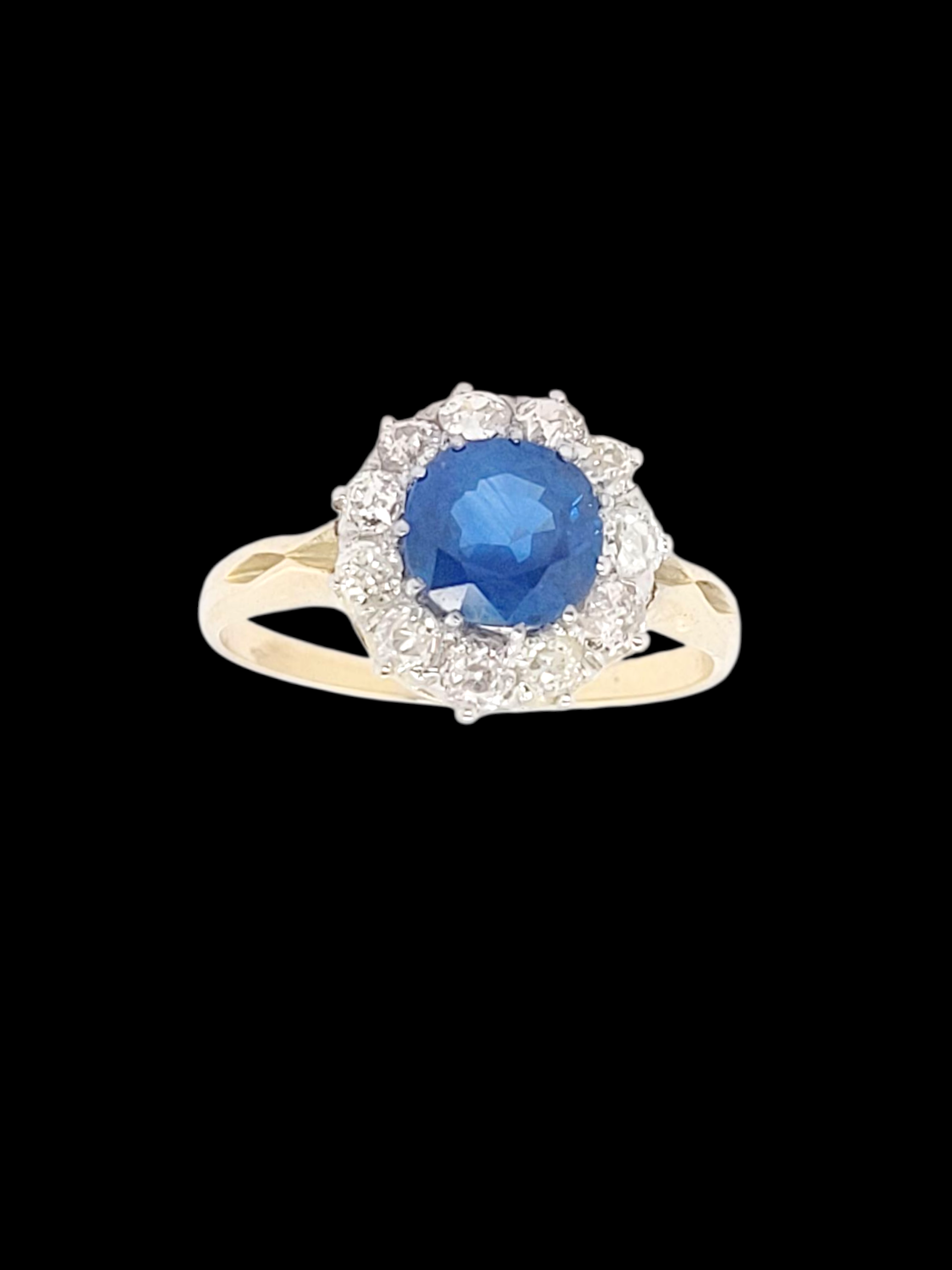 Well proportional sapphire and diamond cluster engagement ring. 6.5mm round sapphire (1ct) with 0.88cts of old cut diamonds all set in 18ct yellow gold. 12mm diameter. Currently finger size O (U.S 7.25)