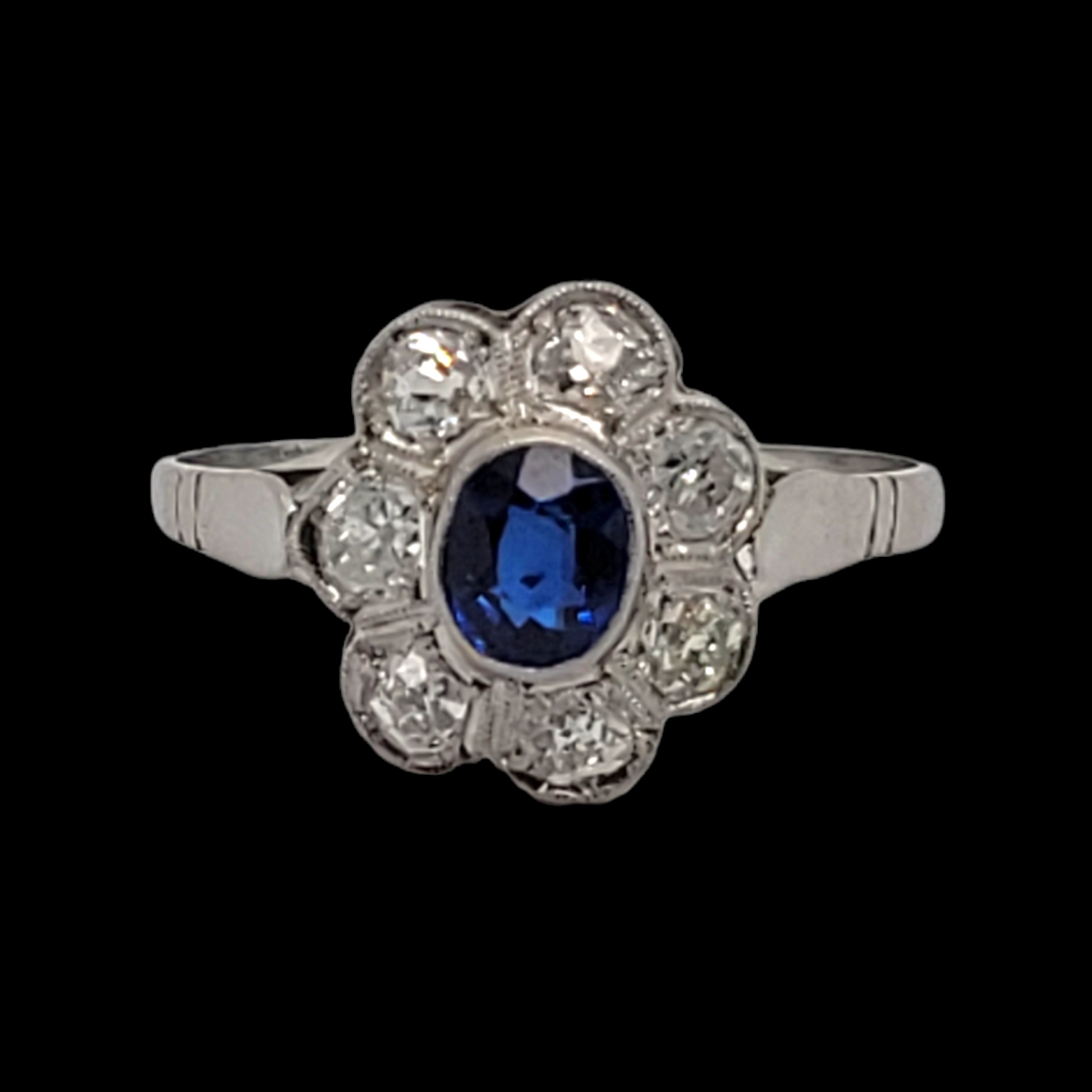 Royal blue oval sapphire weighing approximately 0.60cts surrounded by 1.05cts of old mine cut diamonds in milgrain rubover platinum. Head size 12.5mm x 11mm. American circa 1920. Currently finger size P (U.S 7.75)