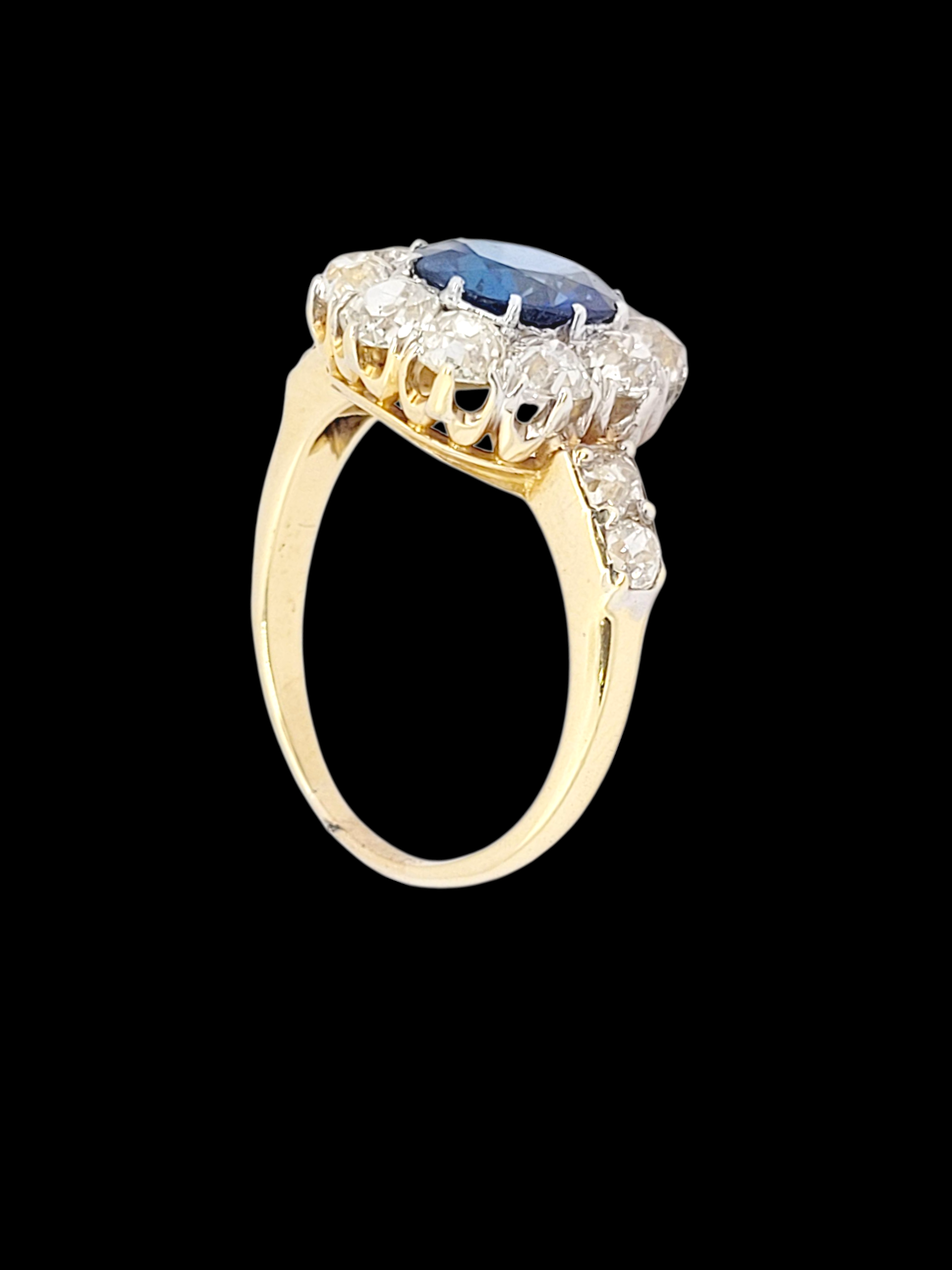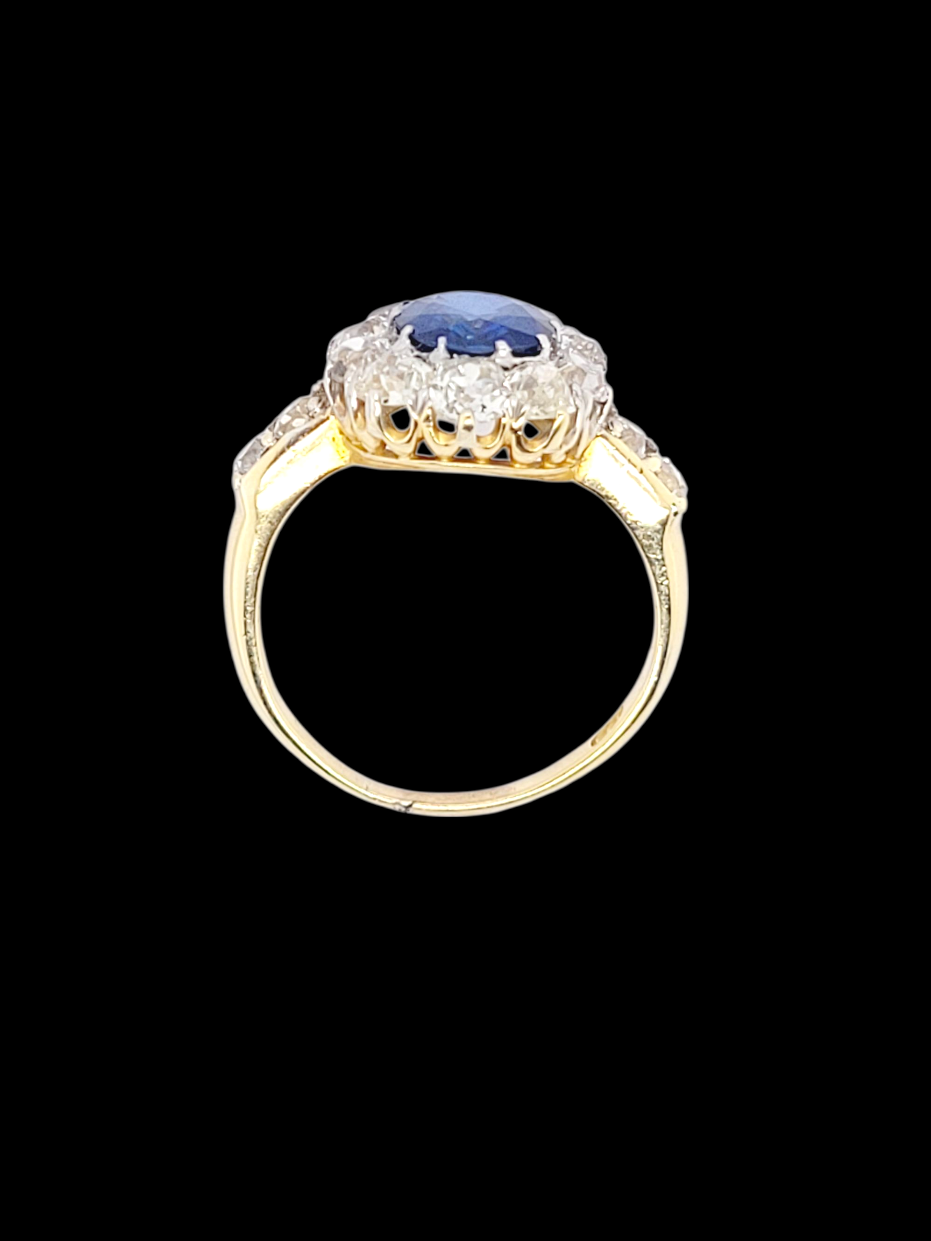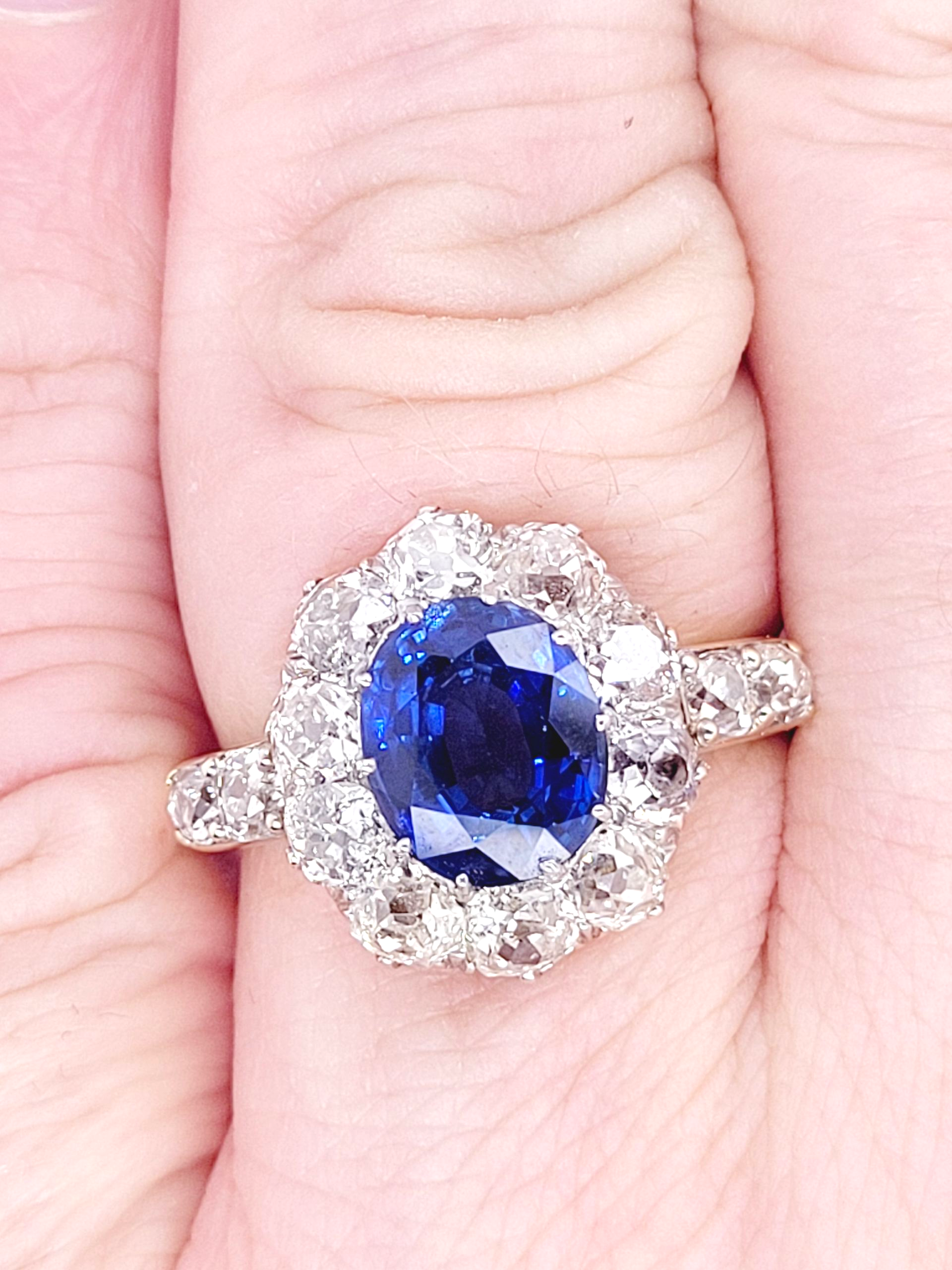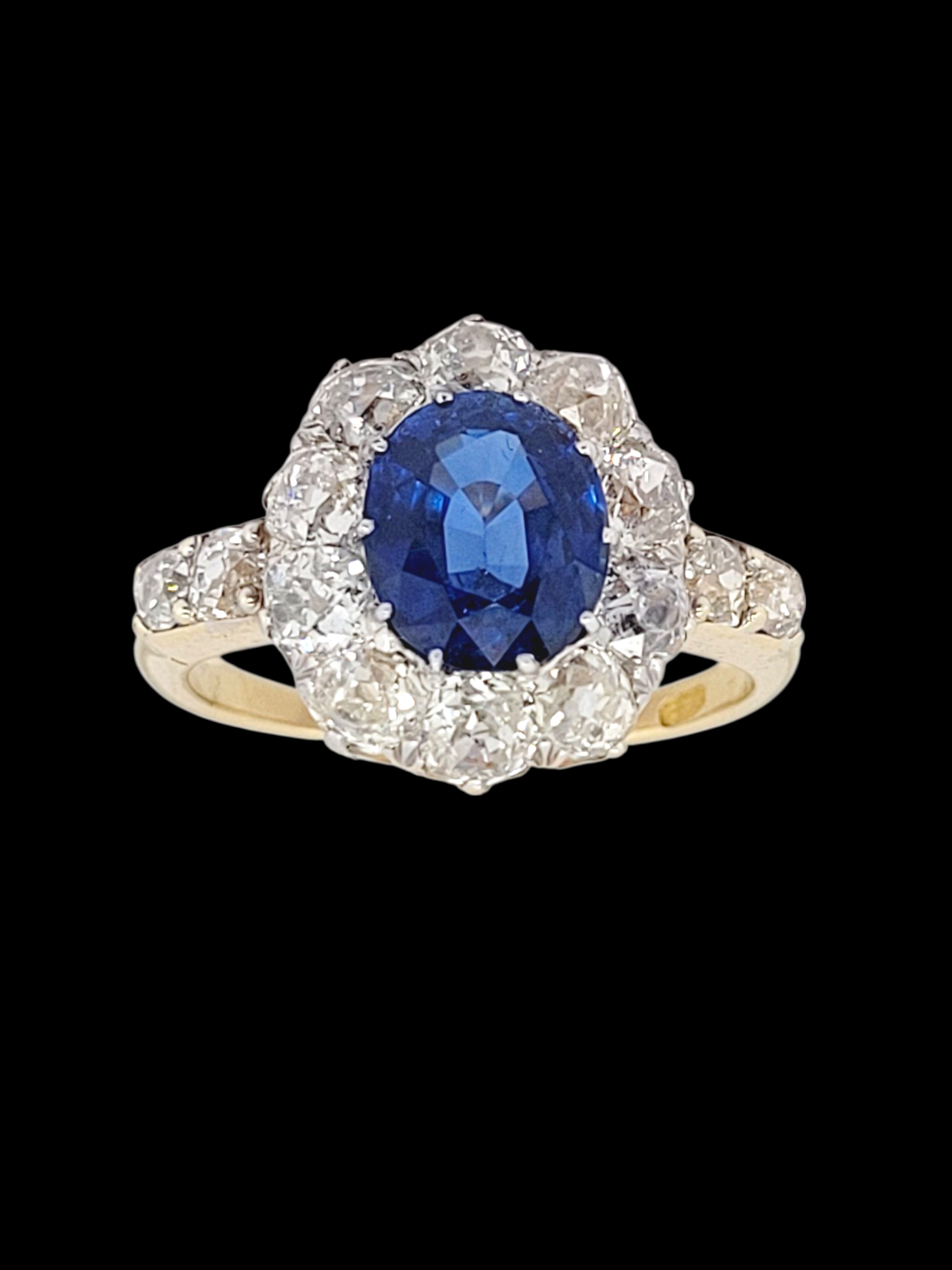 Bright blue oval sapphire (2.55cts) classic claw set with with charming chunky old mine cut diamonds and diamond shoulders (2.35 cts). Head size 15.5mm 13.5mm. English circa 1890. Currently finger size Q 1/2 (U.S 8.5)