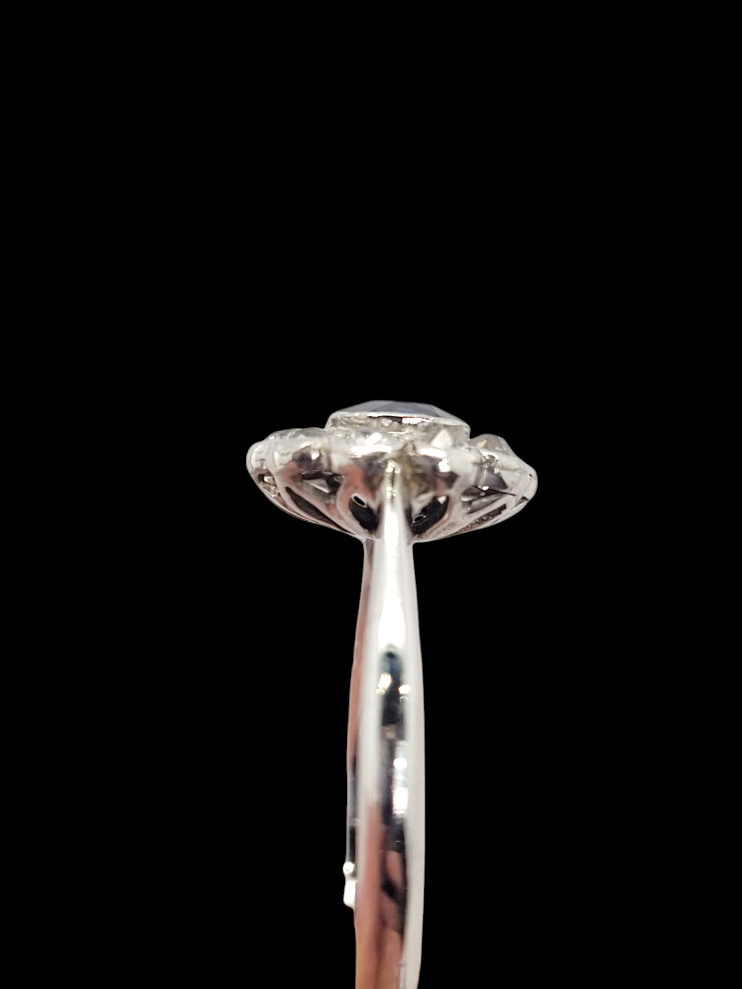 Electric blue old cut 0.60ct sapphire surrounded by 0.50ct old cut diamonds rubover set in platinum and 18ct white gold. Head size 10mm. English circa 1920. Currently finger size I 1/2