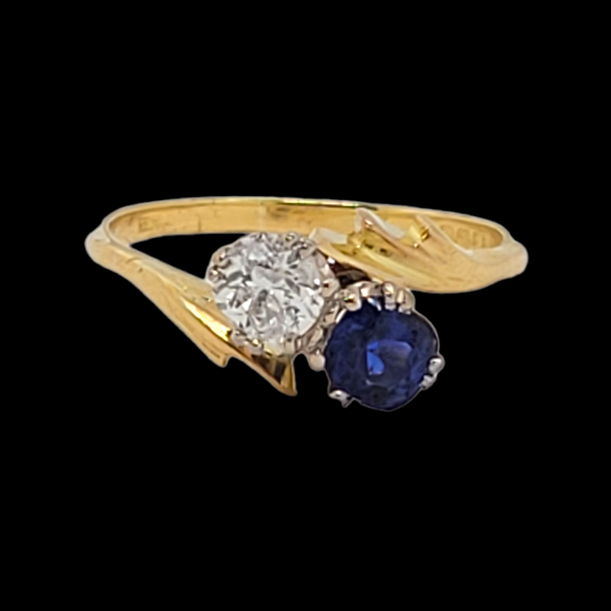 0.50ct old cut diamond and 0.50ct native cut natural sapphire set in a cross over in 18ct gold. Currently finger size N