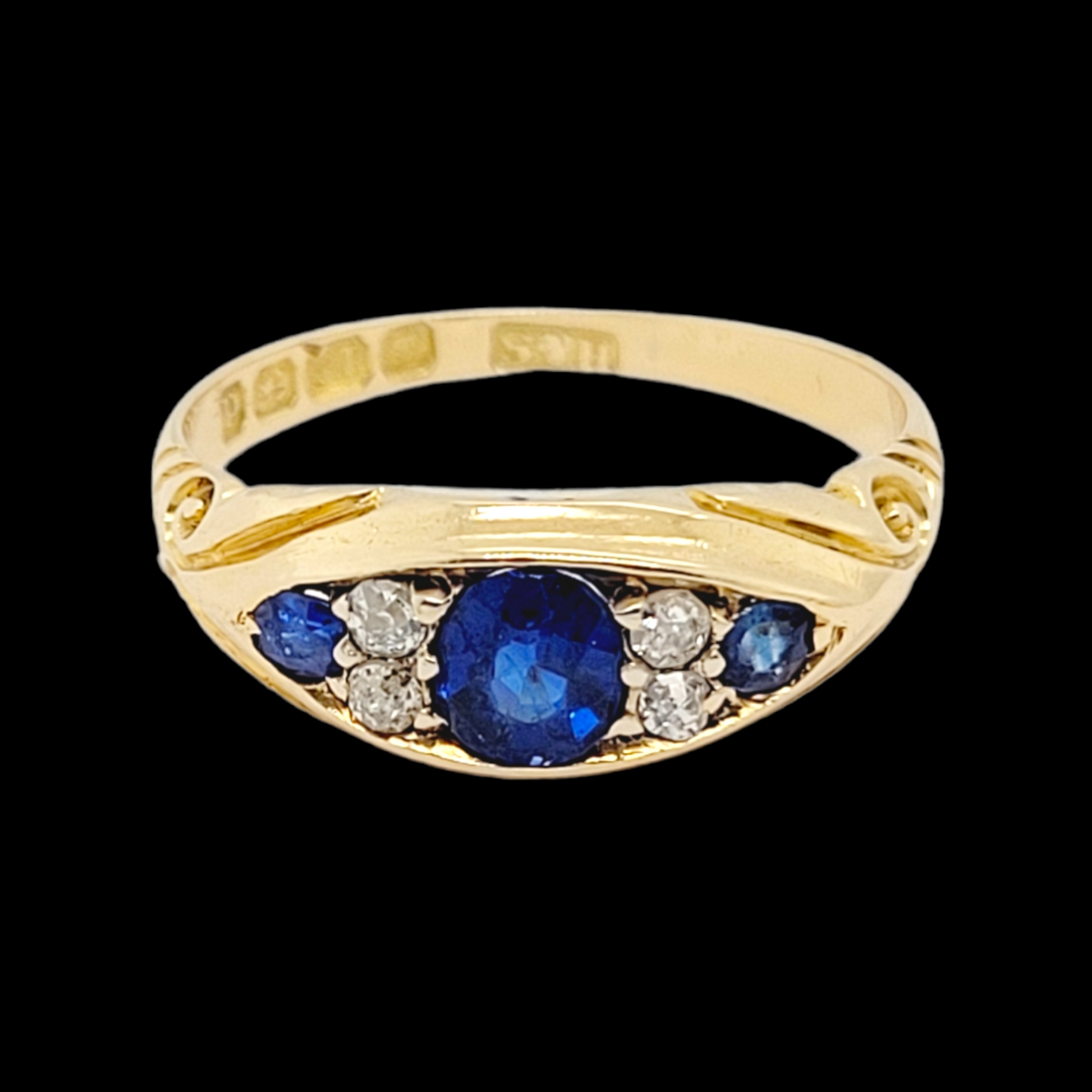 0.50ct sapphire with 0.12cts of old cut diamonds and 0.06ts of sapphire set in 18ct gold. Hallmarked Birmingham 1903