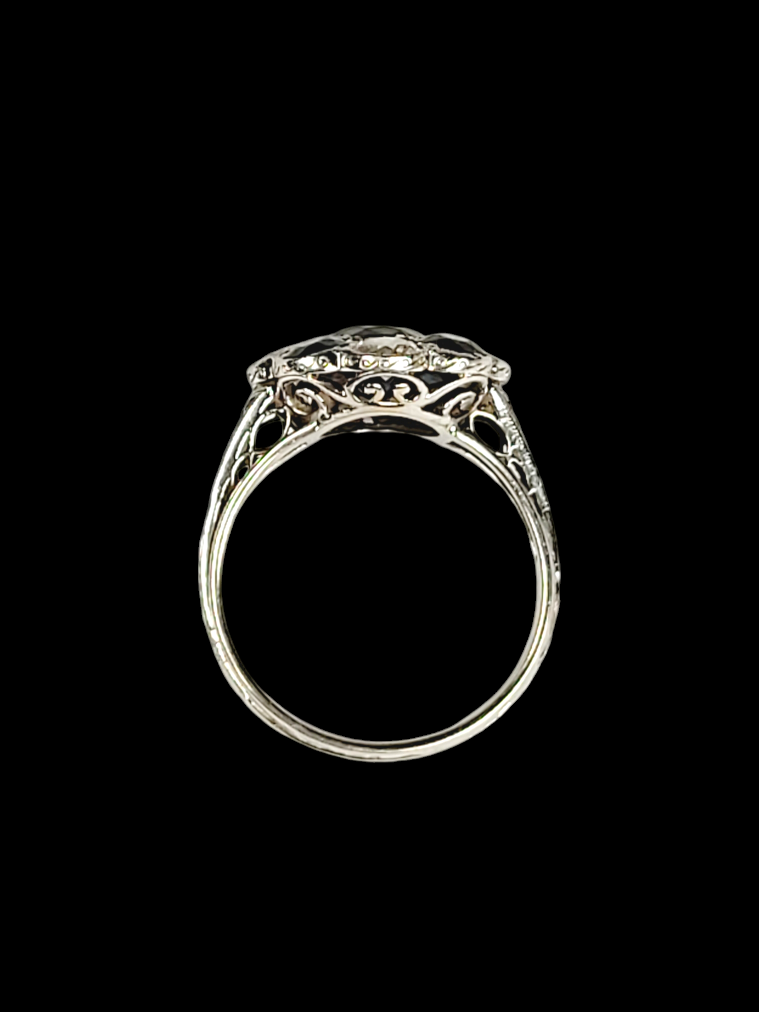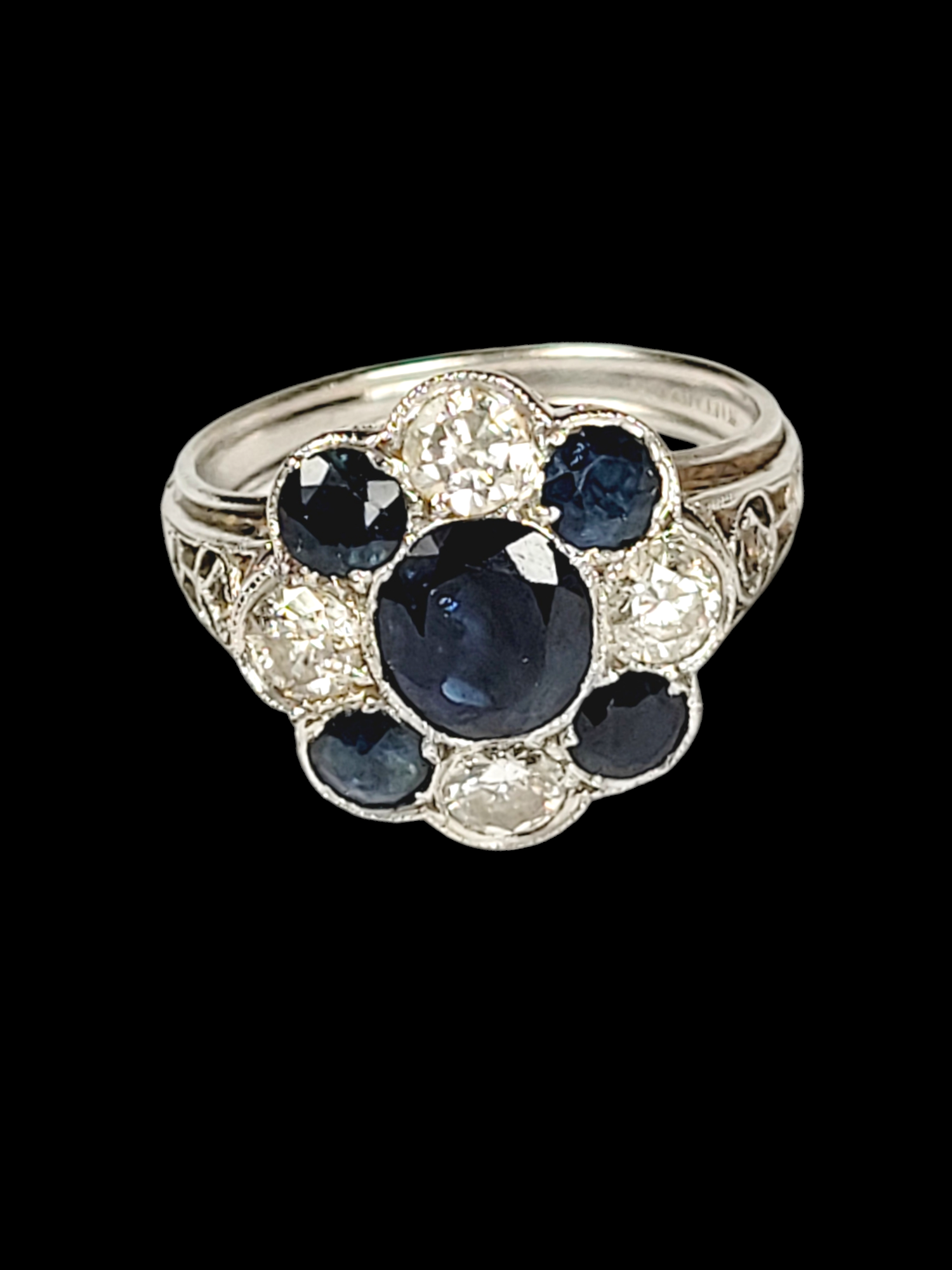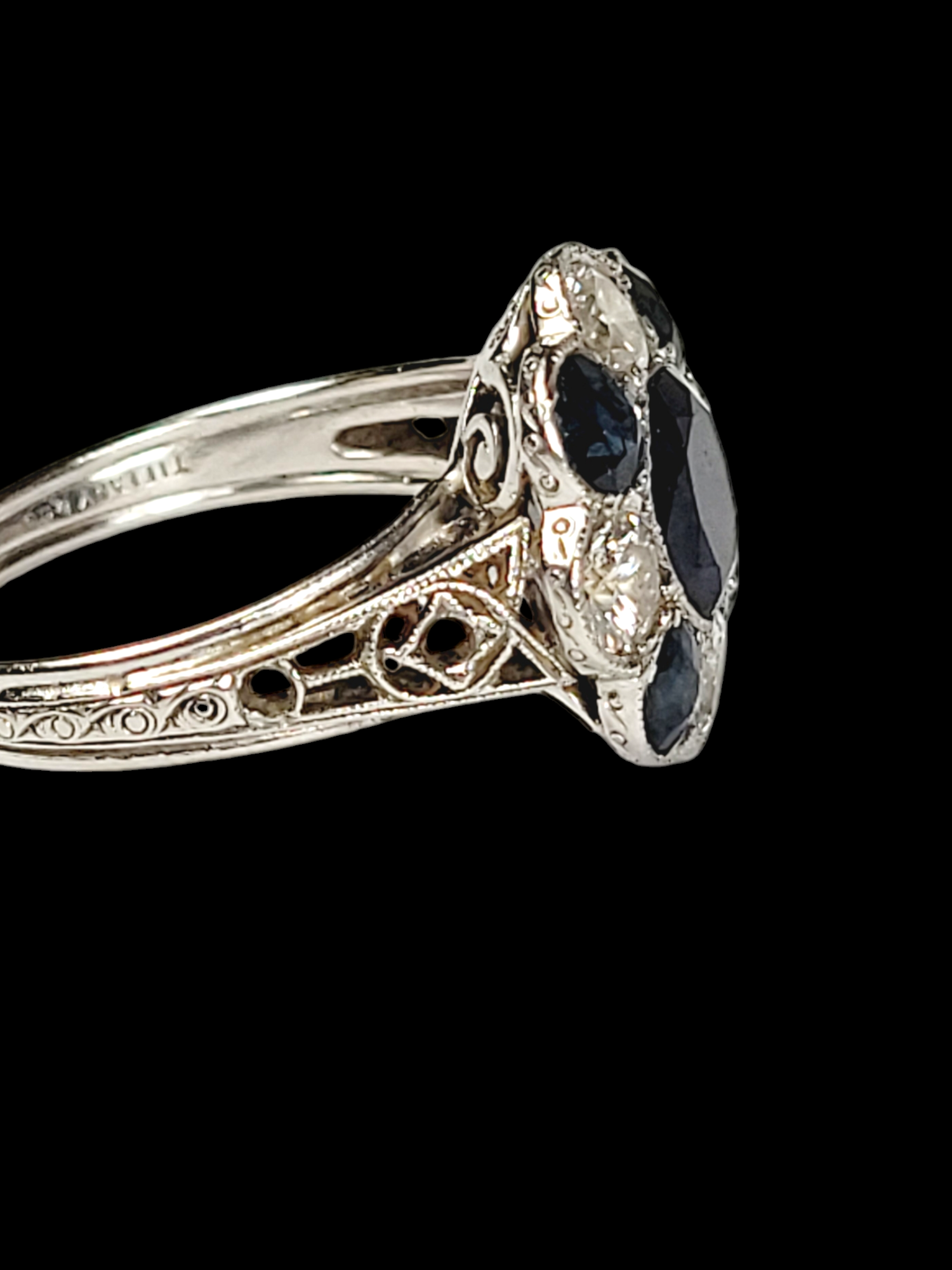 1.50ct sapphire with 0.60cts of sapphires and 0.50cts of diamonds set in platinum circa 1920, notice scrolling gallery and shoulders with engraving and ribbed shank. Signed Tiffany & Co. Head size 14mm. American. Currently finger size M (U.S 6.25)