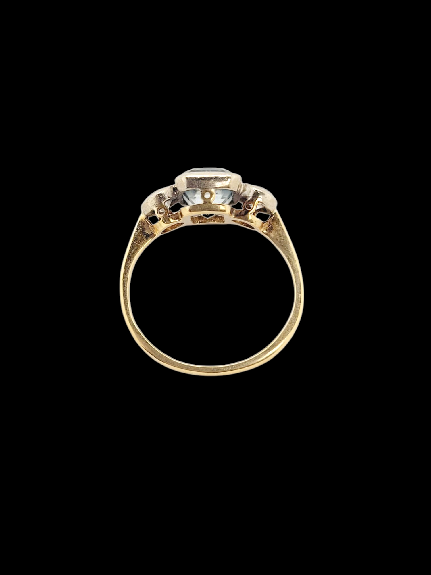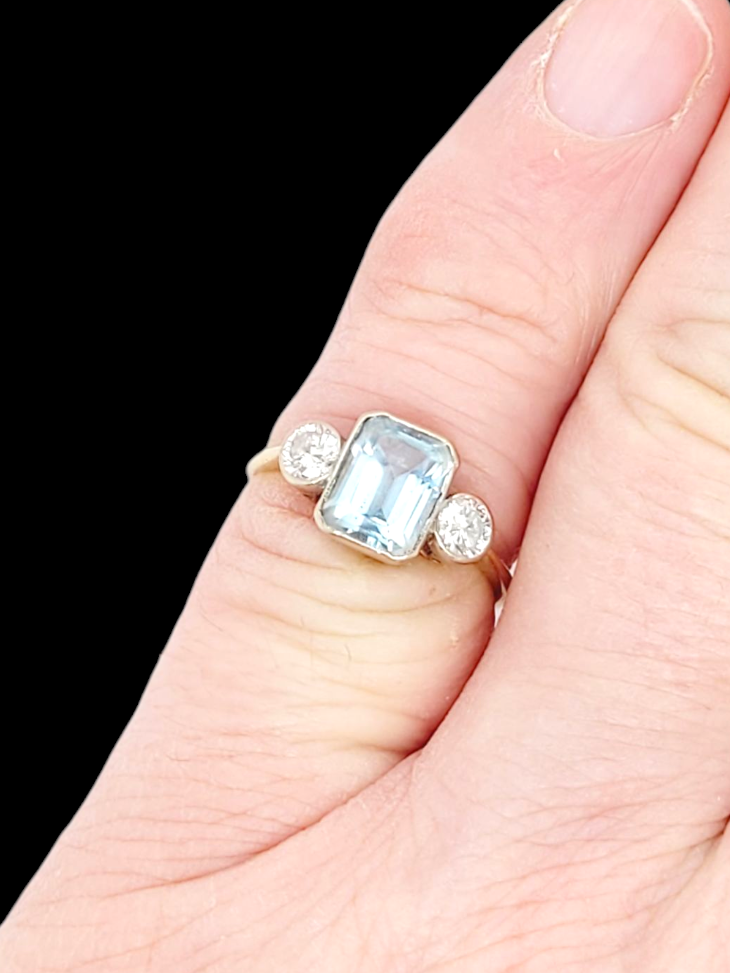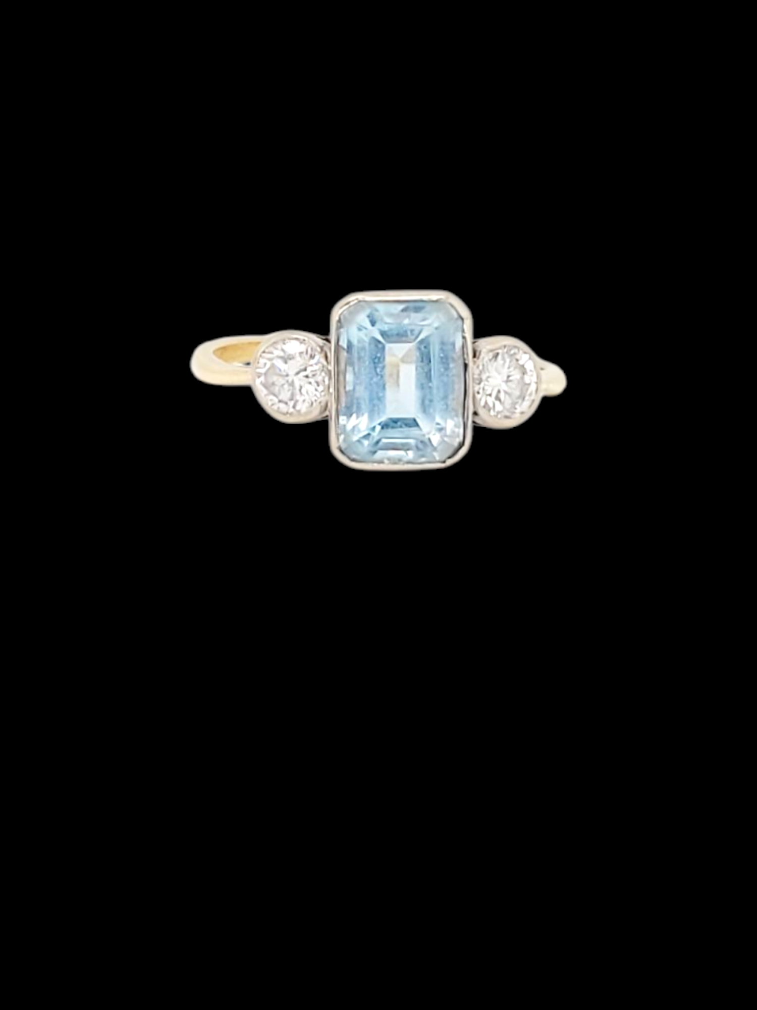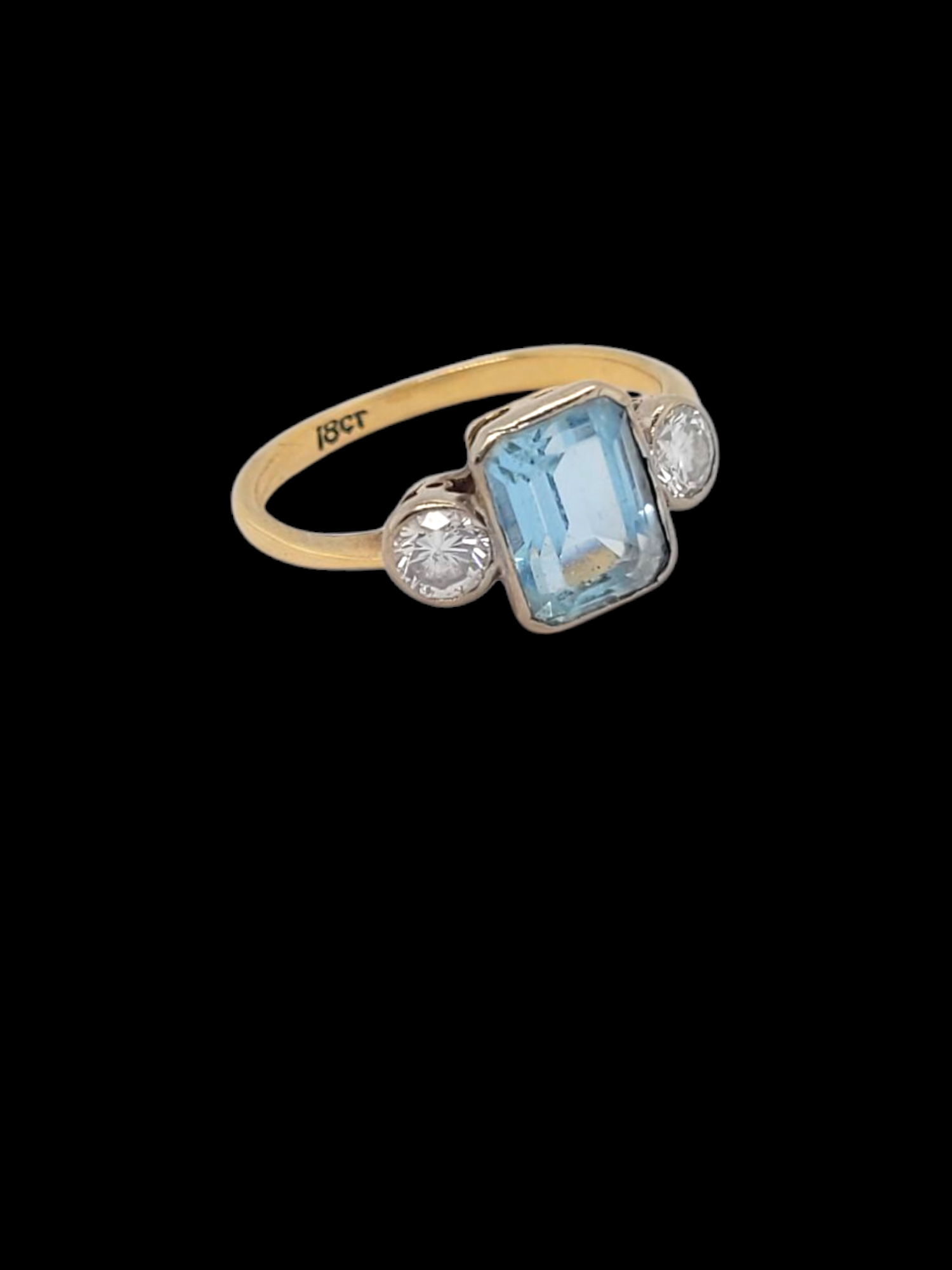 Emerald cut aquamarine bezel set with brilliant cut diamond sides in 18ct gold. 8.5mm 7mm x 4.5mm emerald cut aquamarine 1.83ct. Diamond total weight 0.30cts. Currently finger size J (U.S 4.75)