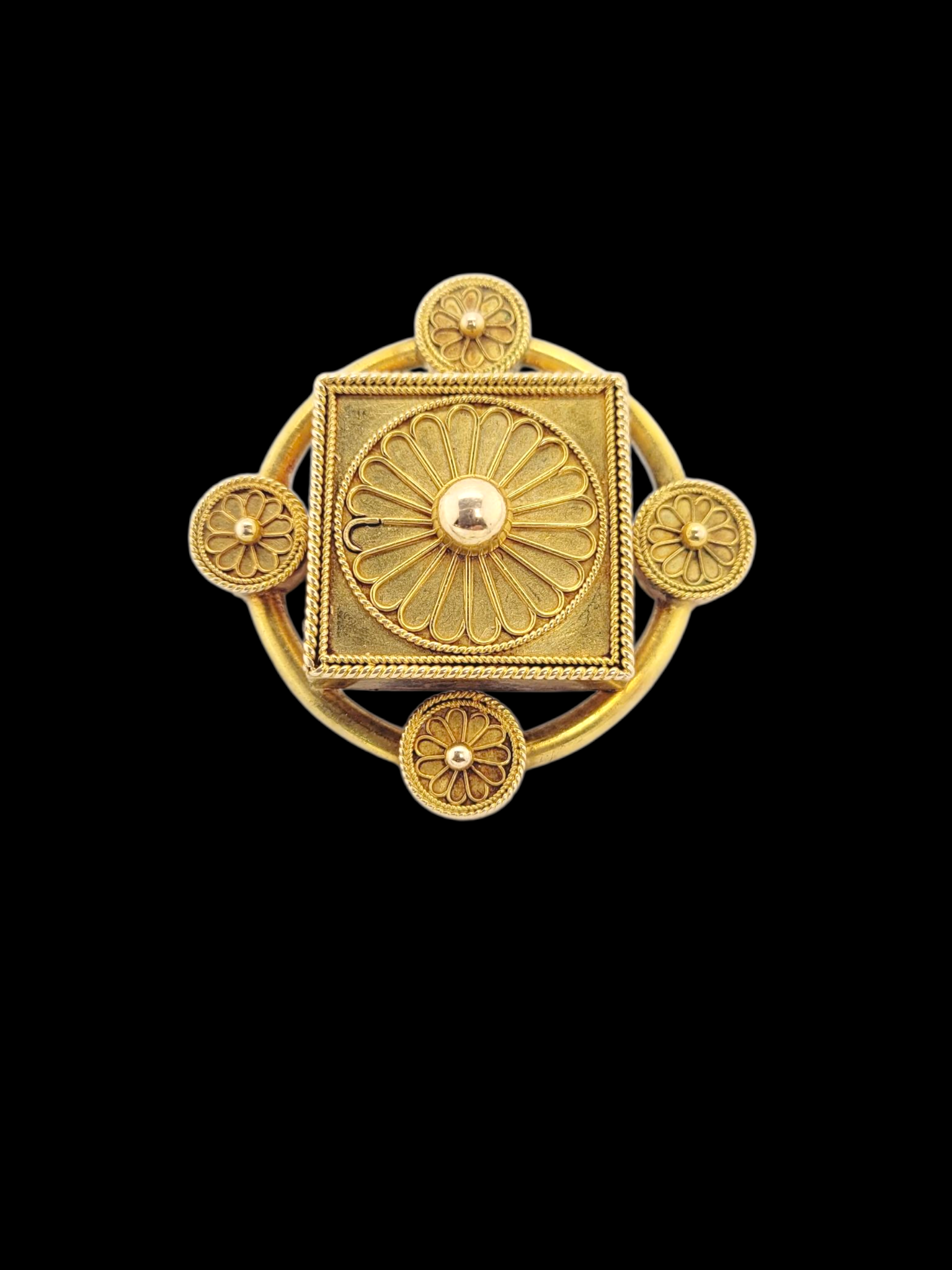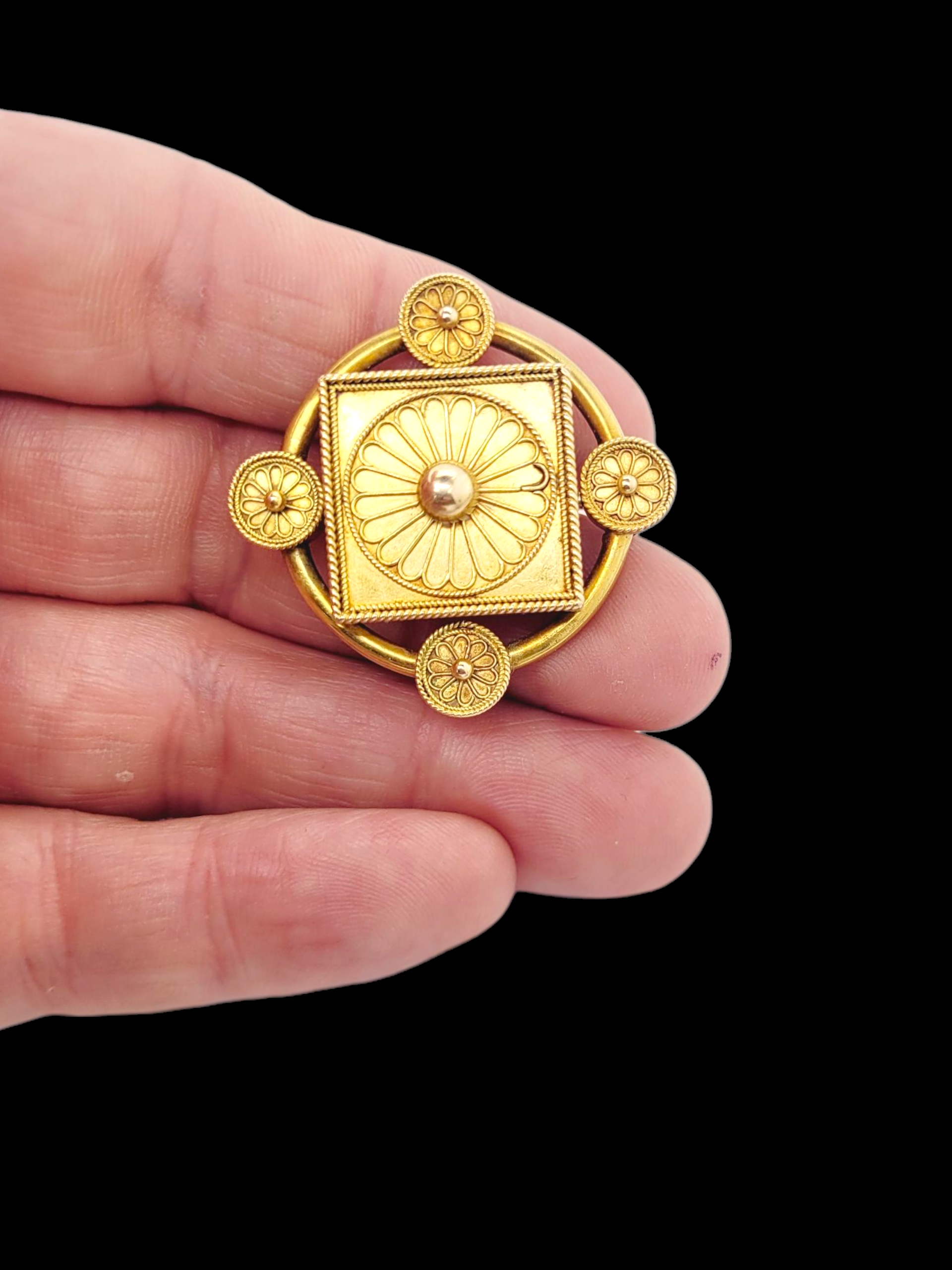 Ancient revival 18ct buttery yellow gold with intricate designs. 37mm diameter. English circa 1860.