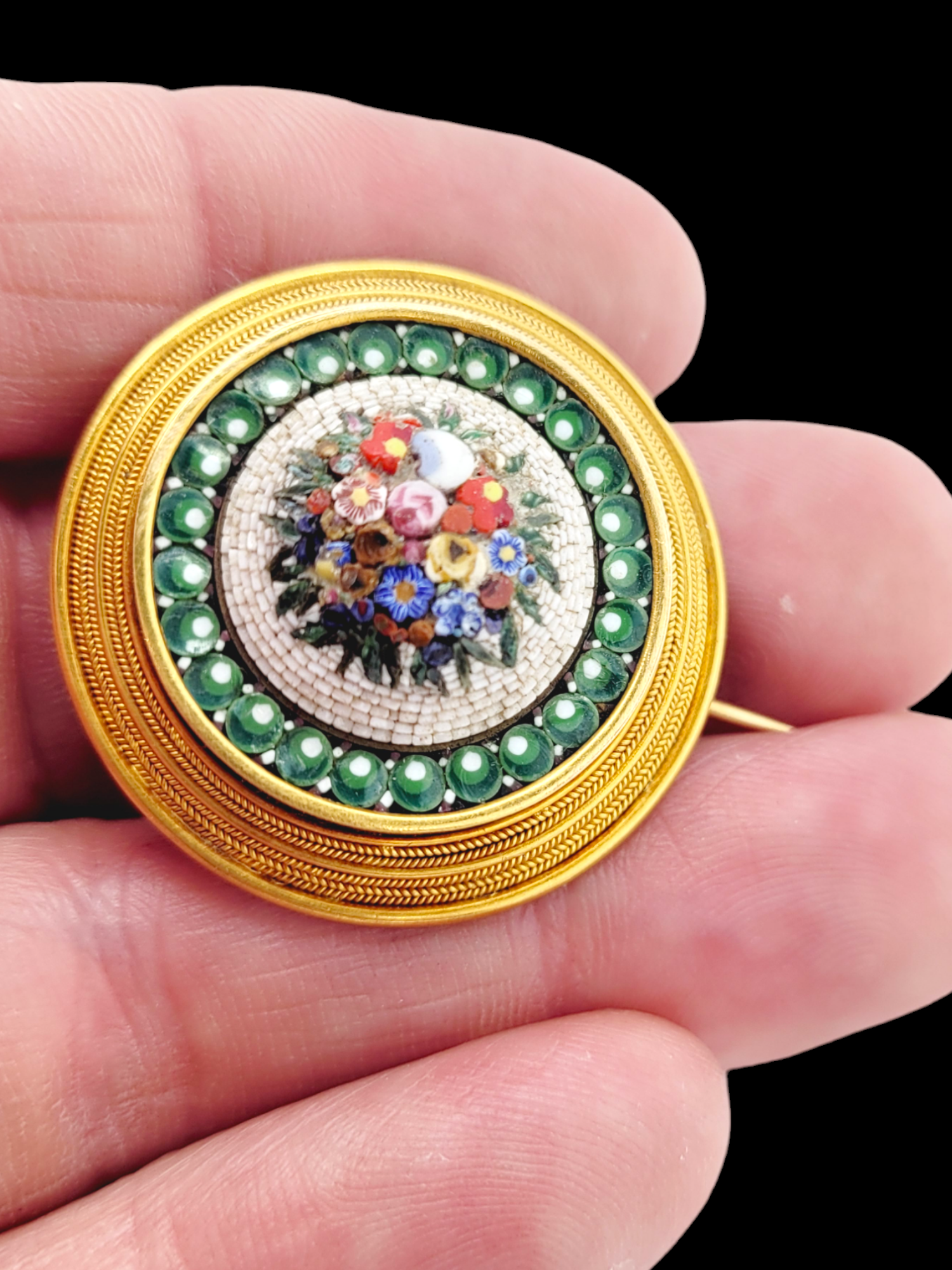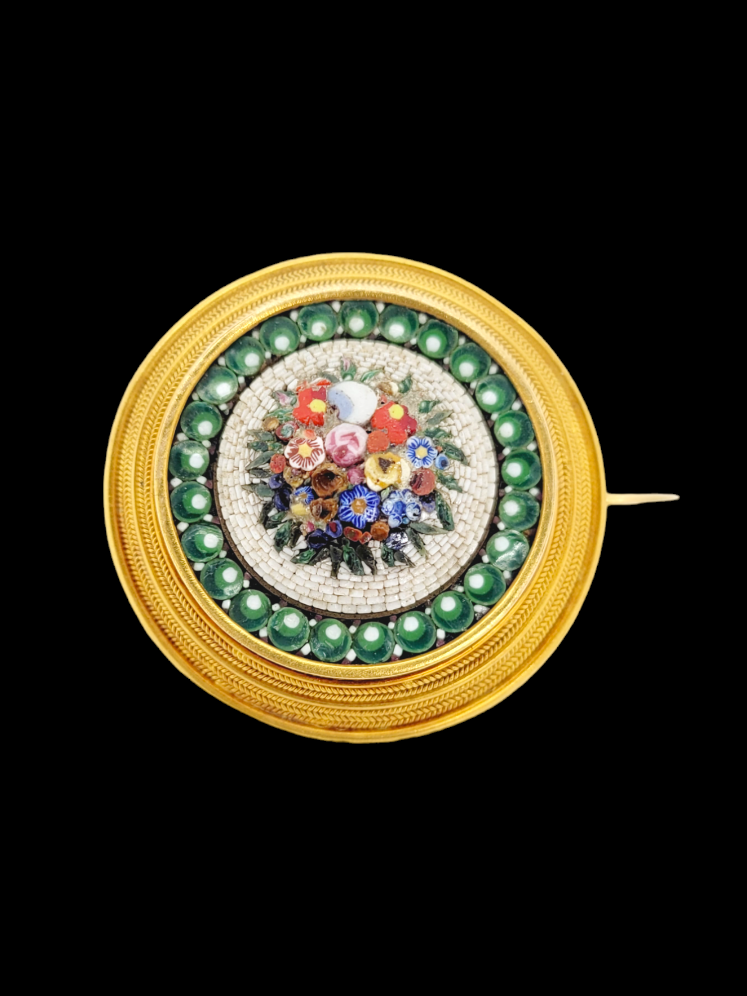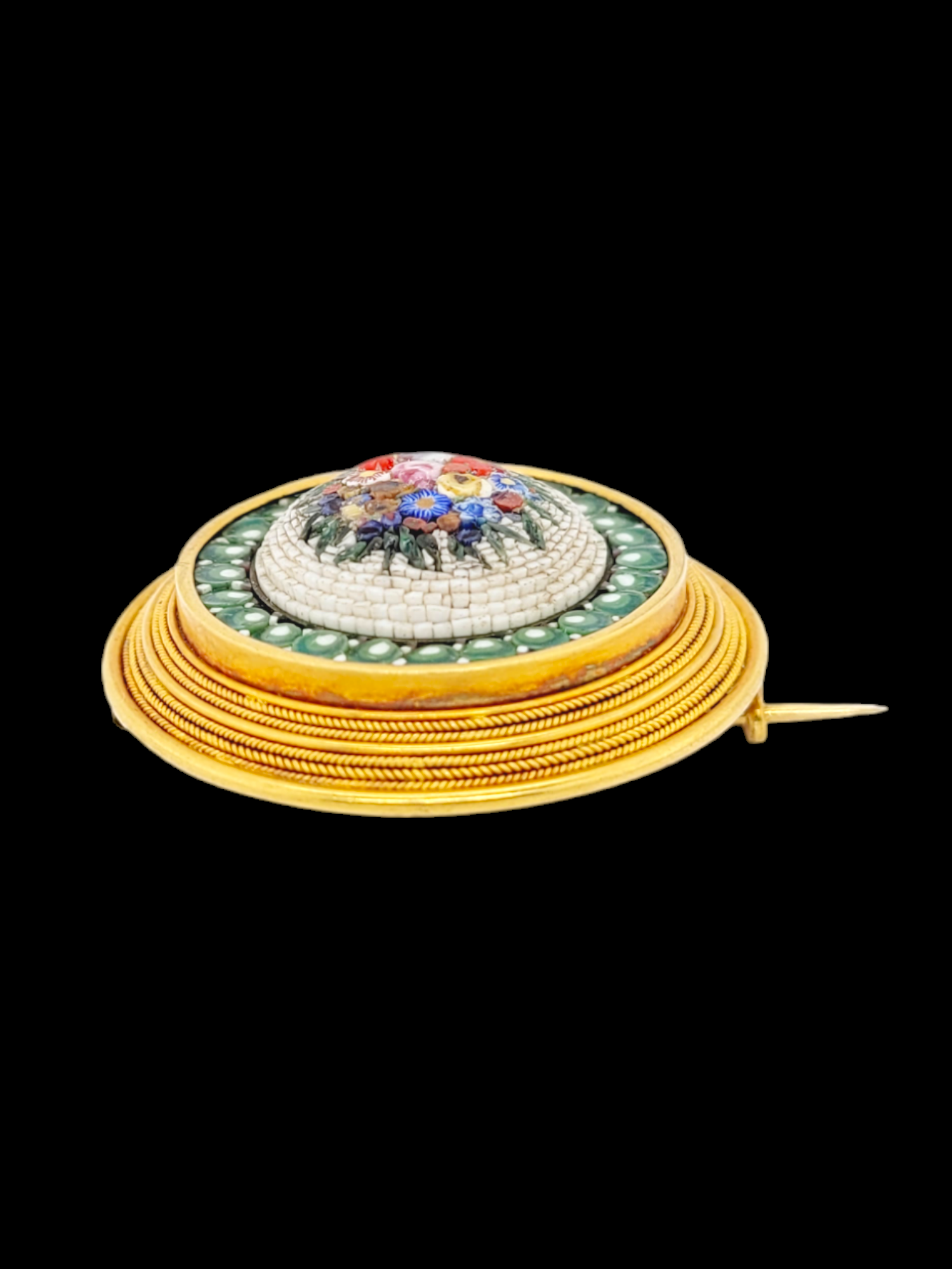 Micro mosaic floral scene surrounded by an 18ct gold mount with multiple twisted wire design. Italian circa 1870. 35mm diameter.