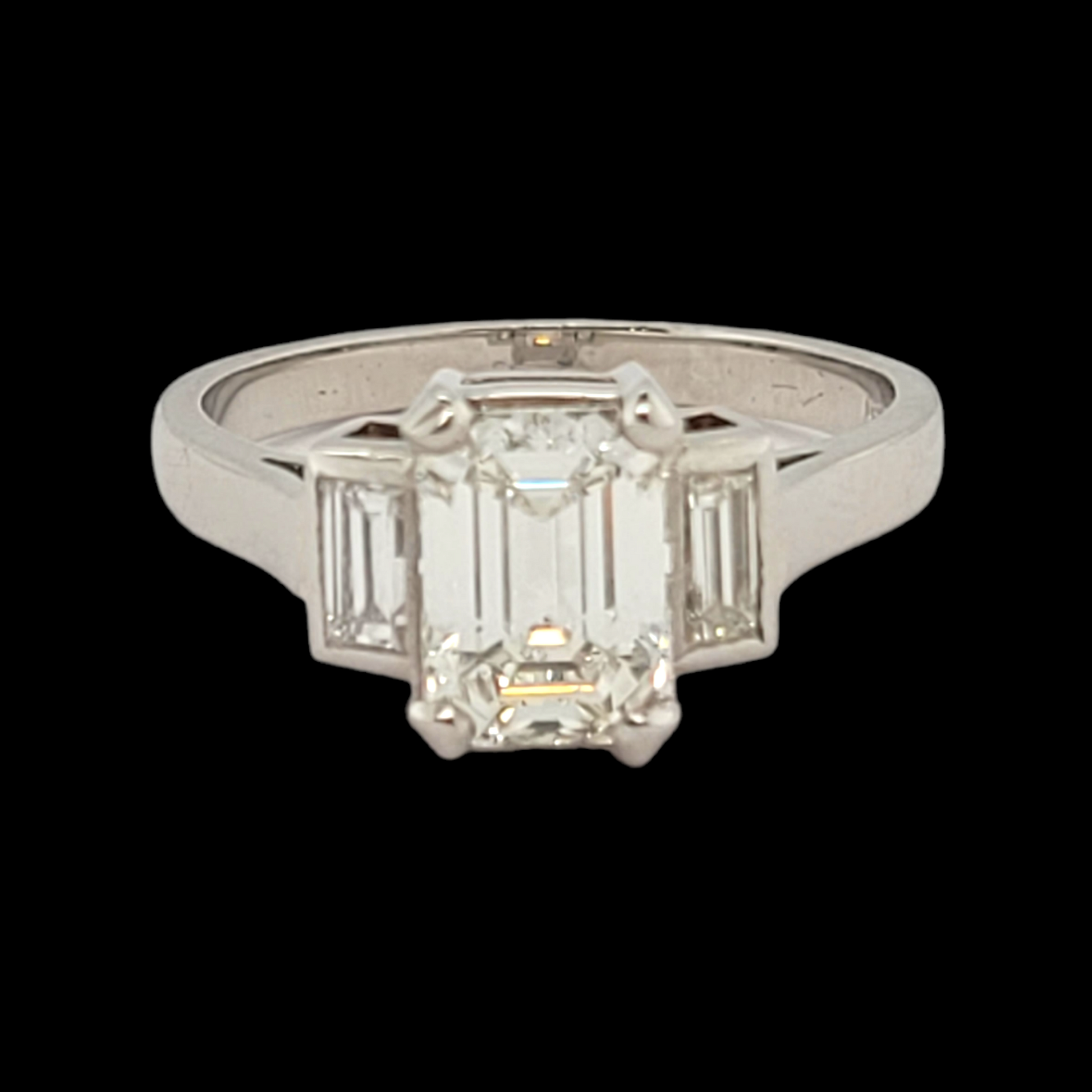 Emerald cut diamond certified 1.51ct I colour Vs2 with portrait baguette diamond shoulders set in platinum