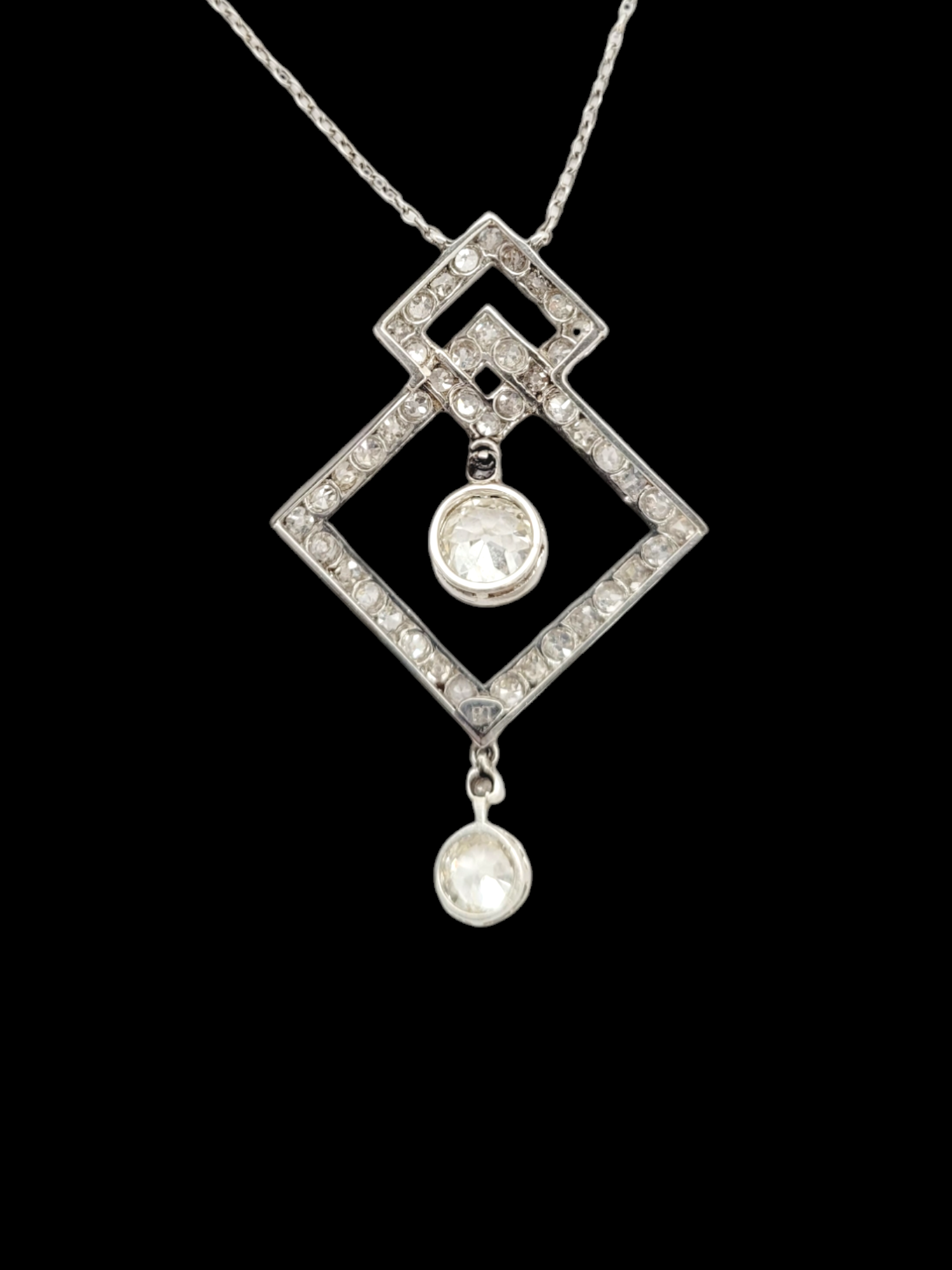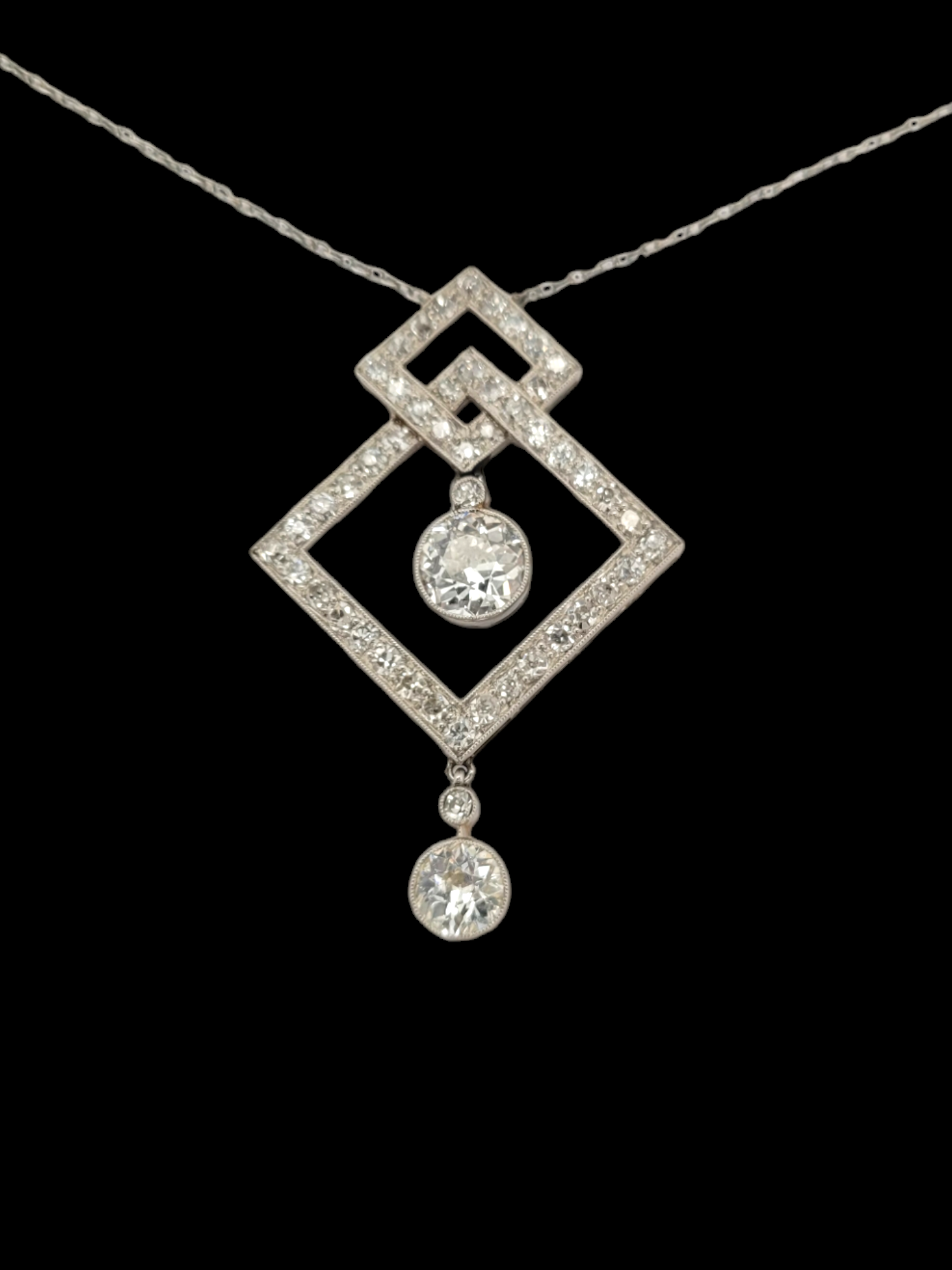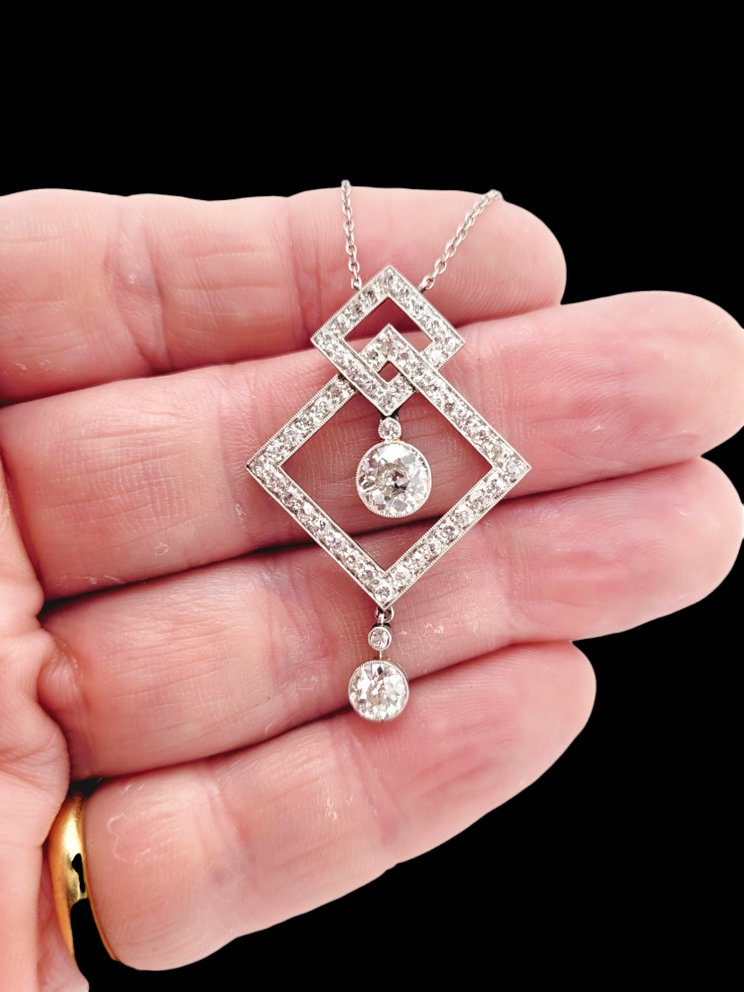 3.50cts of old European transitional cut diamonds set in milgrain platinum with 1ct principle stone with 1.50cts in entwined oblique squares and a half carat diamond drop. 42mm x 28mm. American circa 1920. 16 inch platinum trace chain.