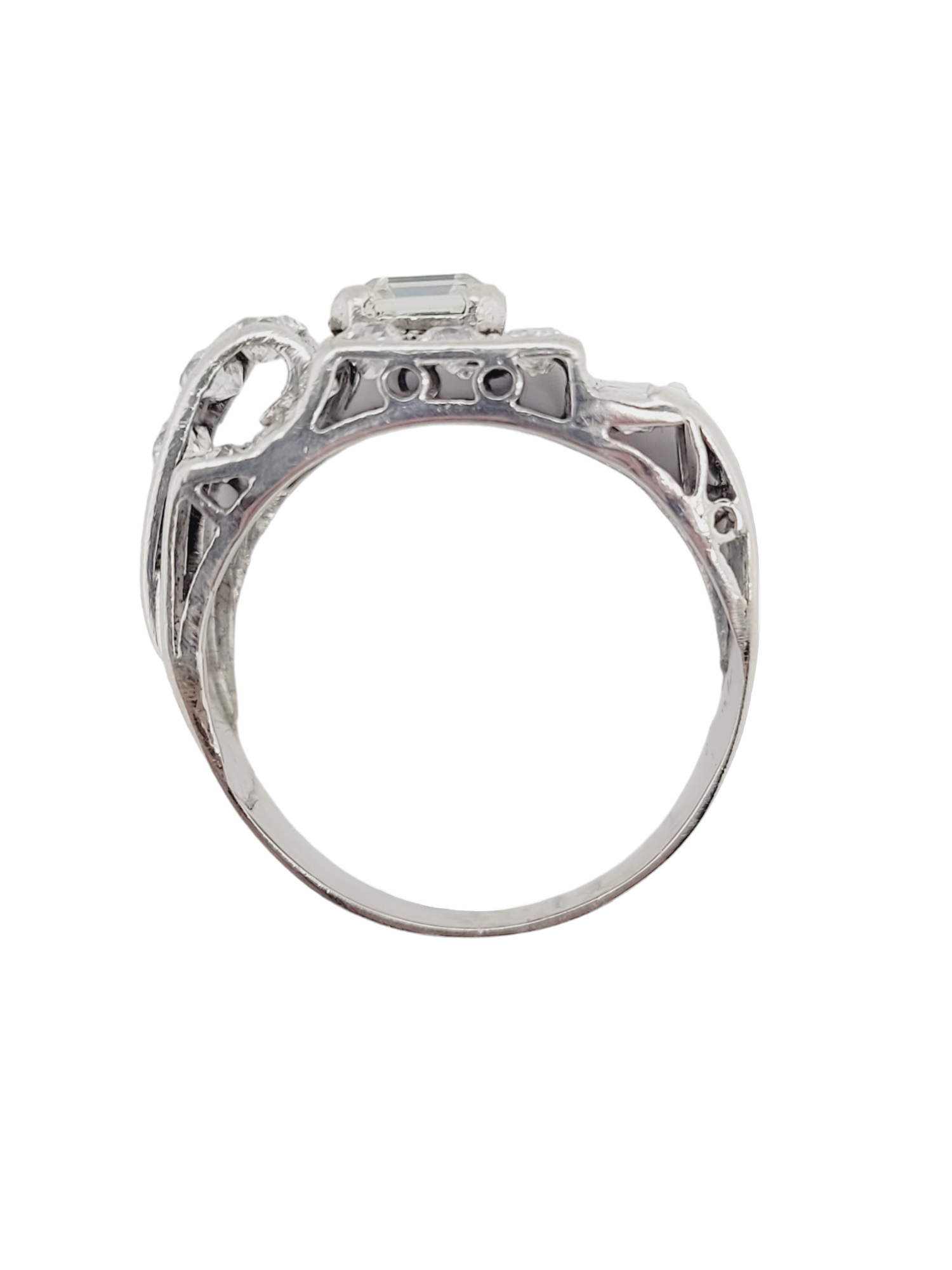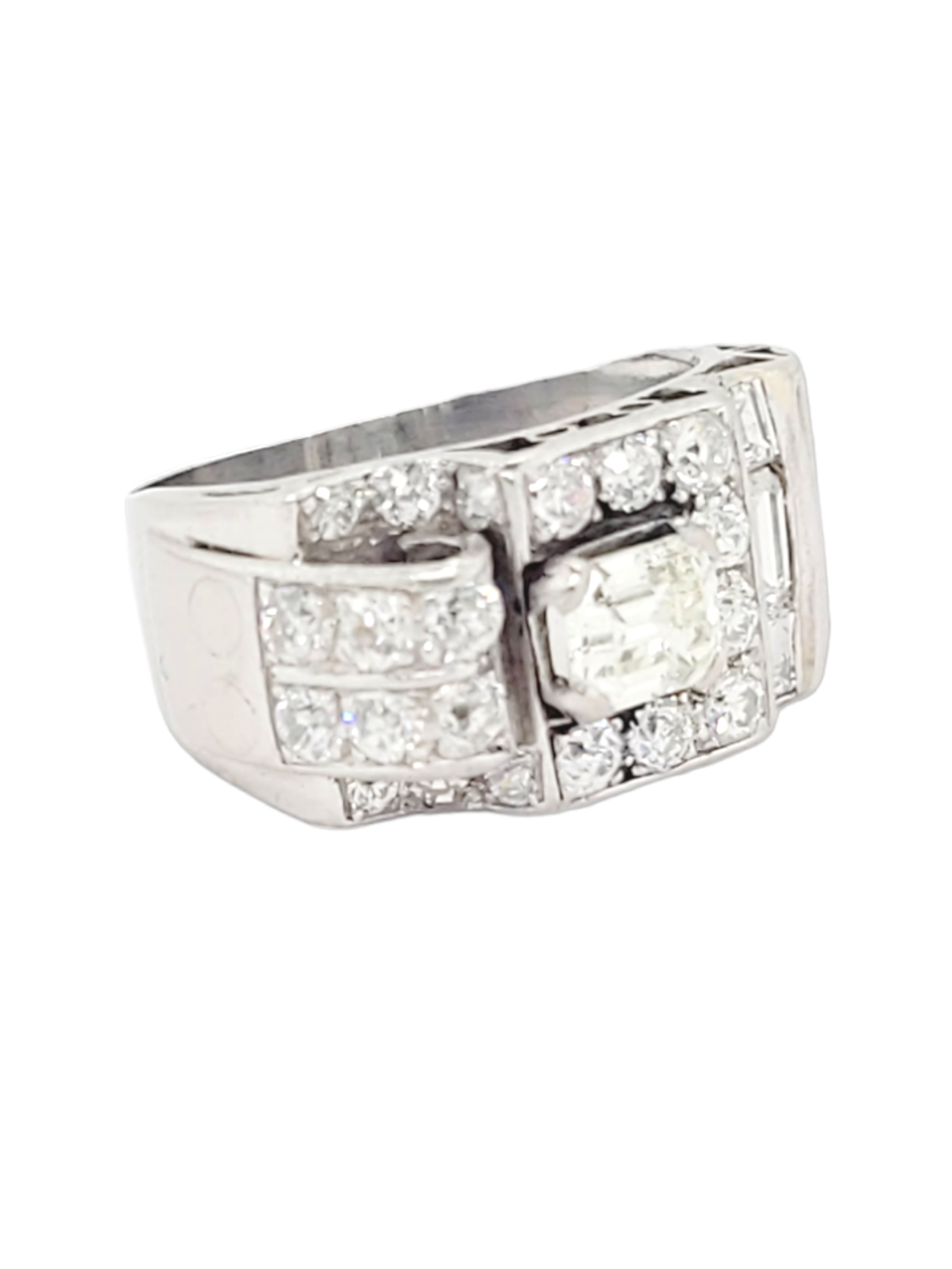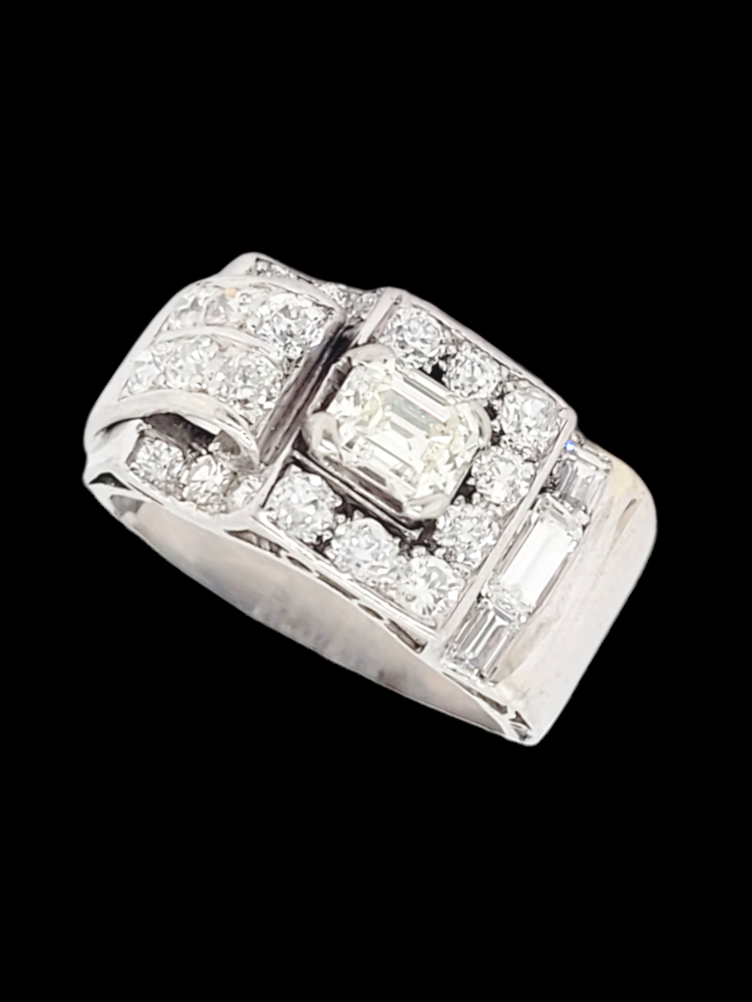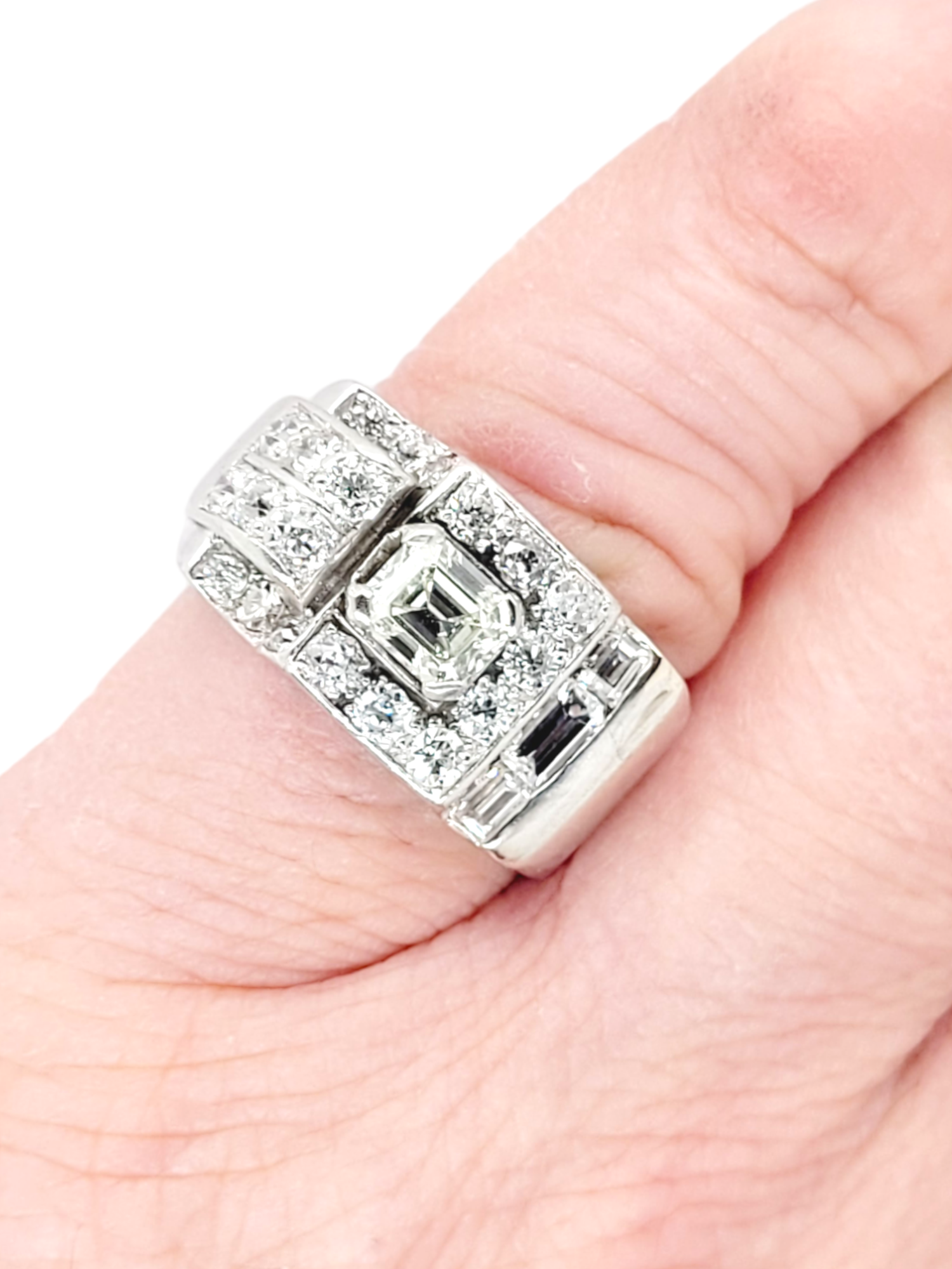 1.75cts of emerald cut, old European transitional cut and baguette cut diamonds set within an asymmetrical geometric unique handmade iconic ring. 11.5mm x 20mm head size. Sits low profile to finger, very comfortable to wear. Currently finger size Q (U.S 8.25)