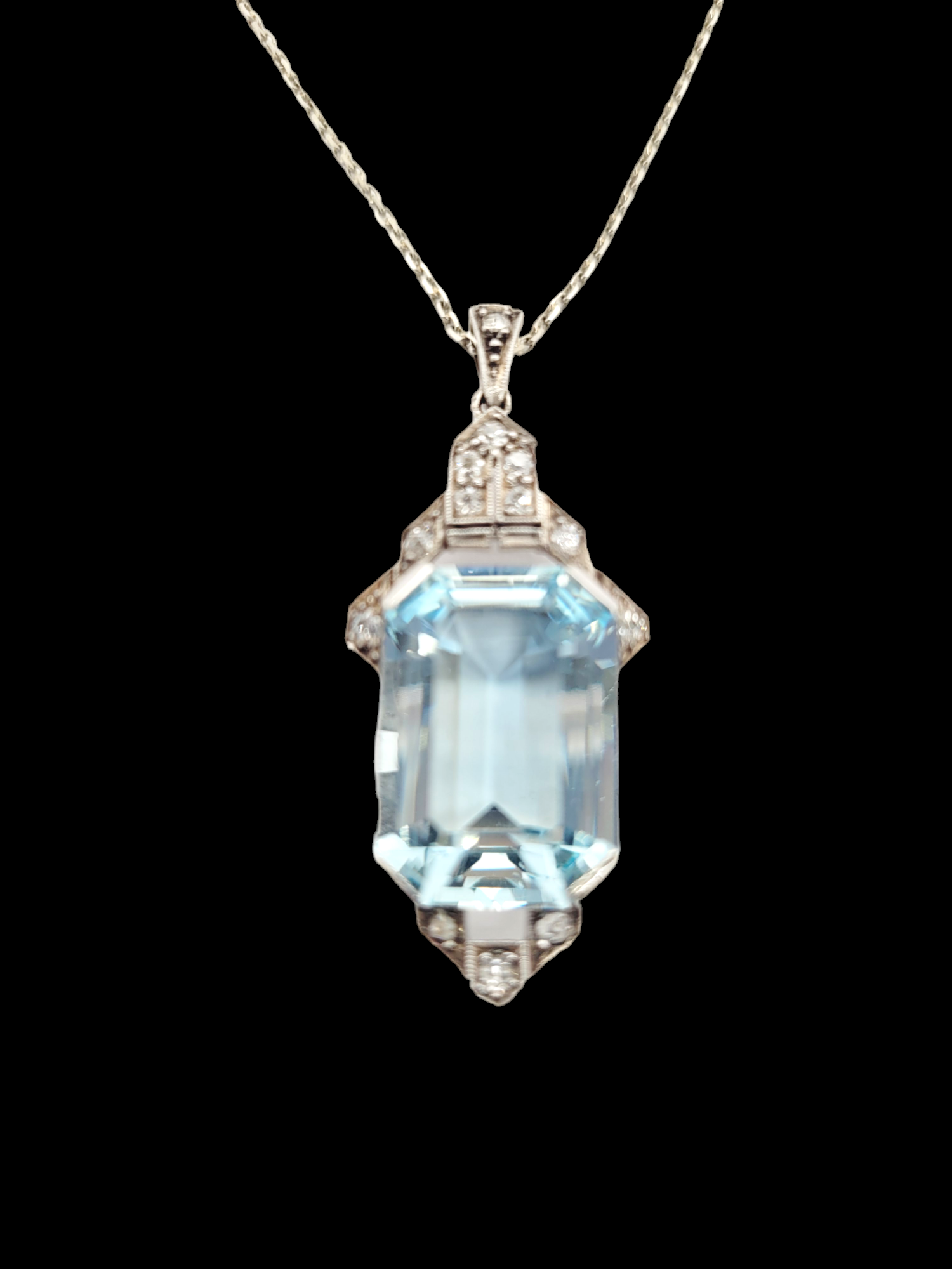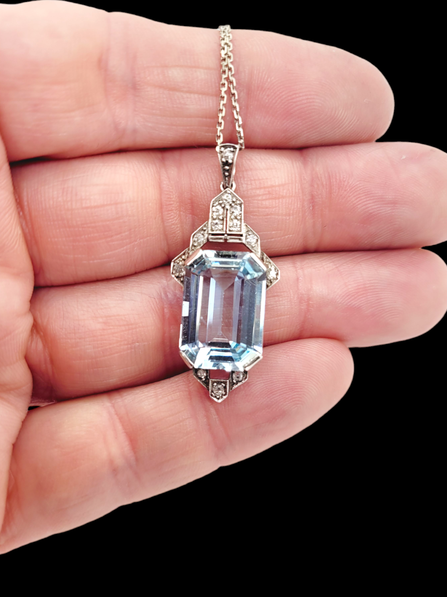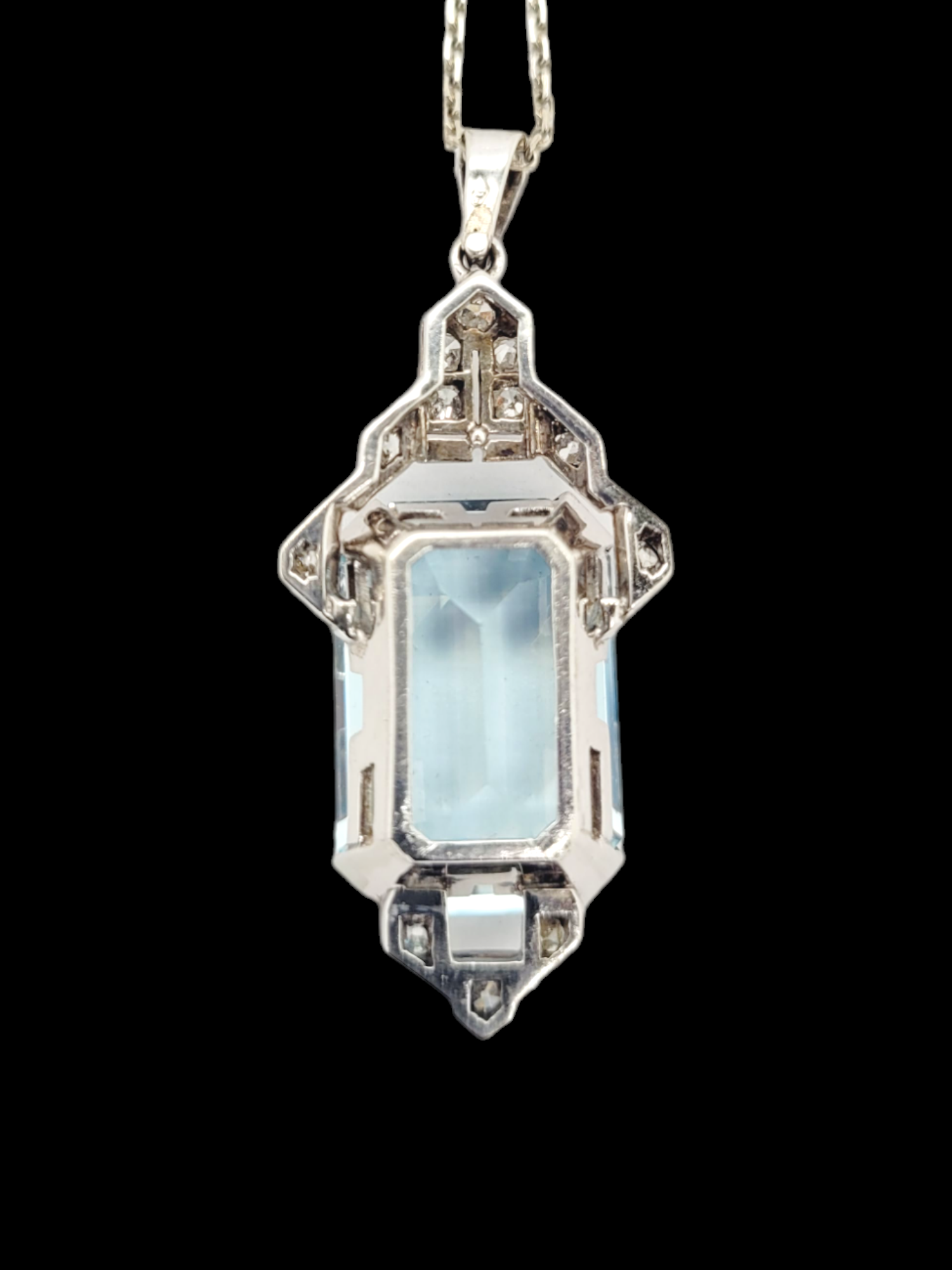 17mm x 12mm emerald cut aquamarine (10.47cts calculated) with geometric diamond top and bottom, 0.50cts set in 14ct white gold. European circa 1920. 40mm x 18mm. 18 inch oblong trace chain.