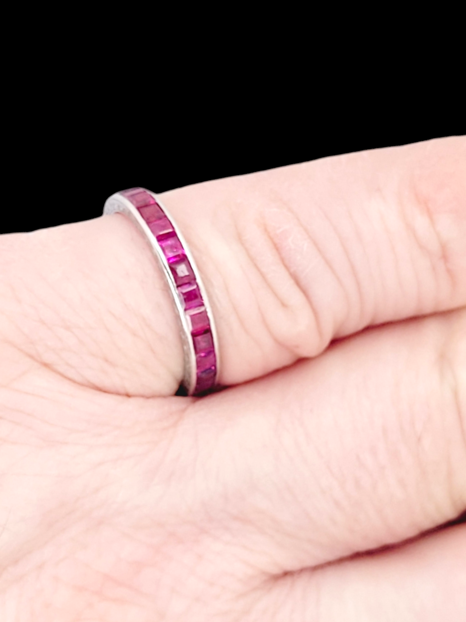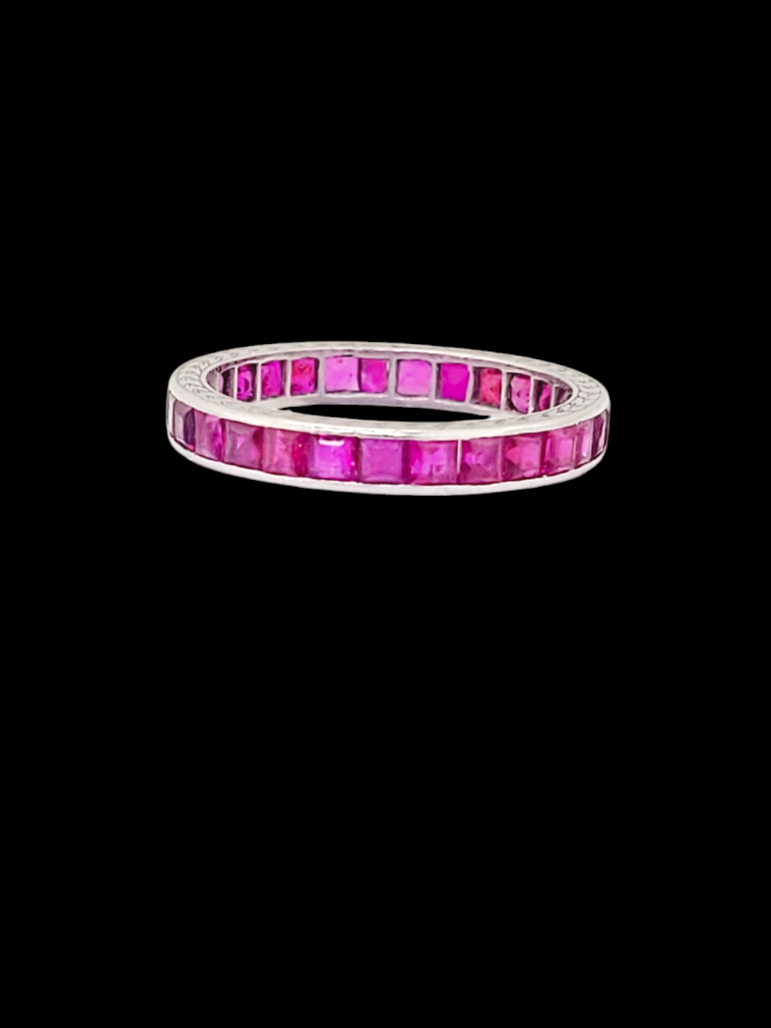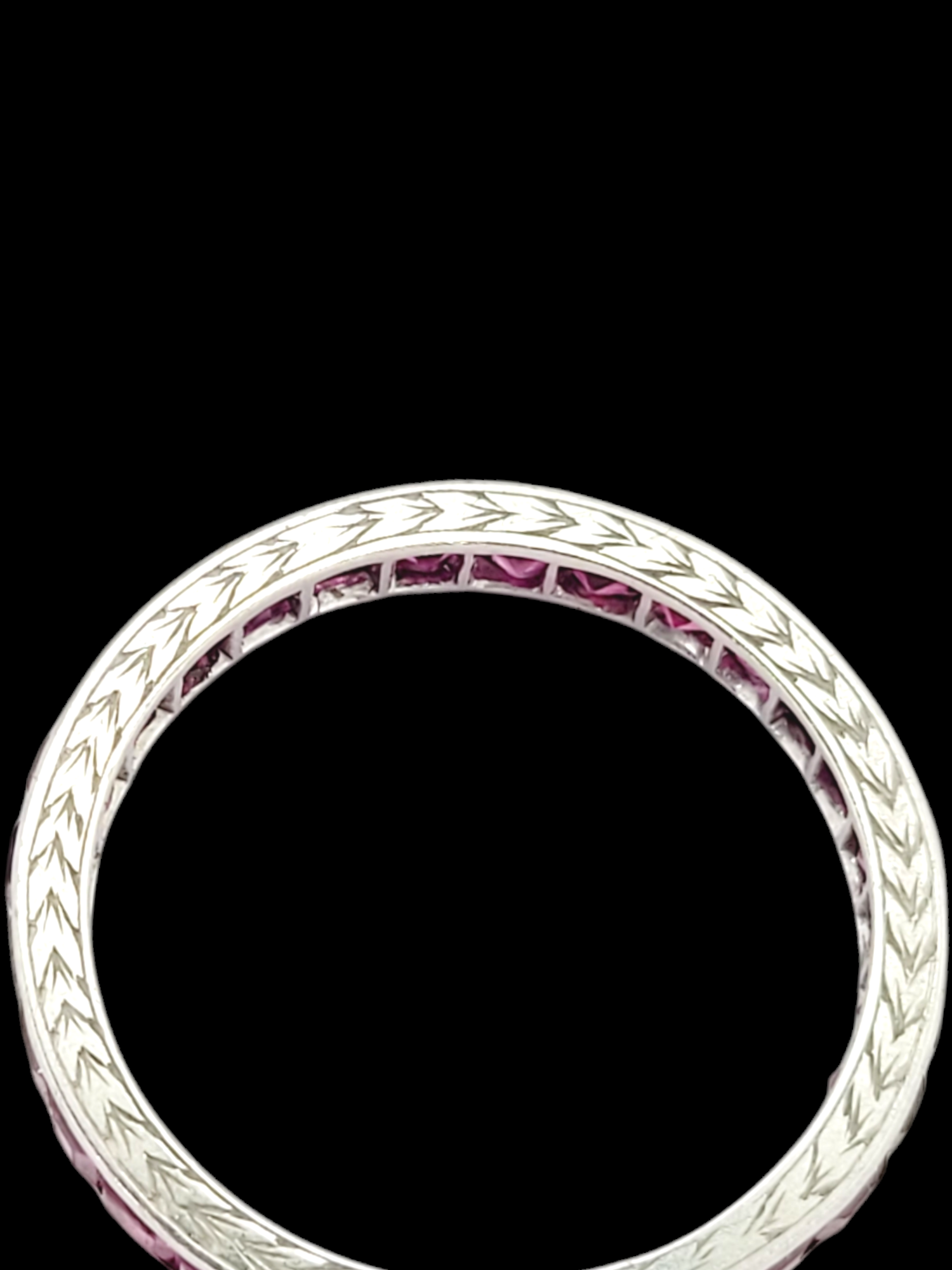 Gem ruby 1920's eternity ring. 3mm wide ruby ring set I platinum with engraved sides. 1.36cts of natural rubies. English circa 1920. Finger size N (U.S 6.75)