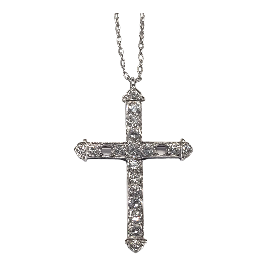 1ct of brilliant cut diamonds all milgrain set in platinum, 32mm x 22.5mm. On a platinum trace chain 15.5 inches long. English circa 1920