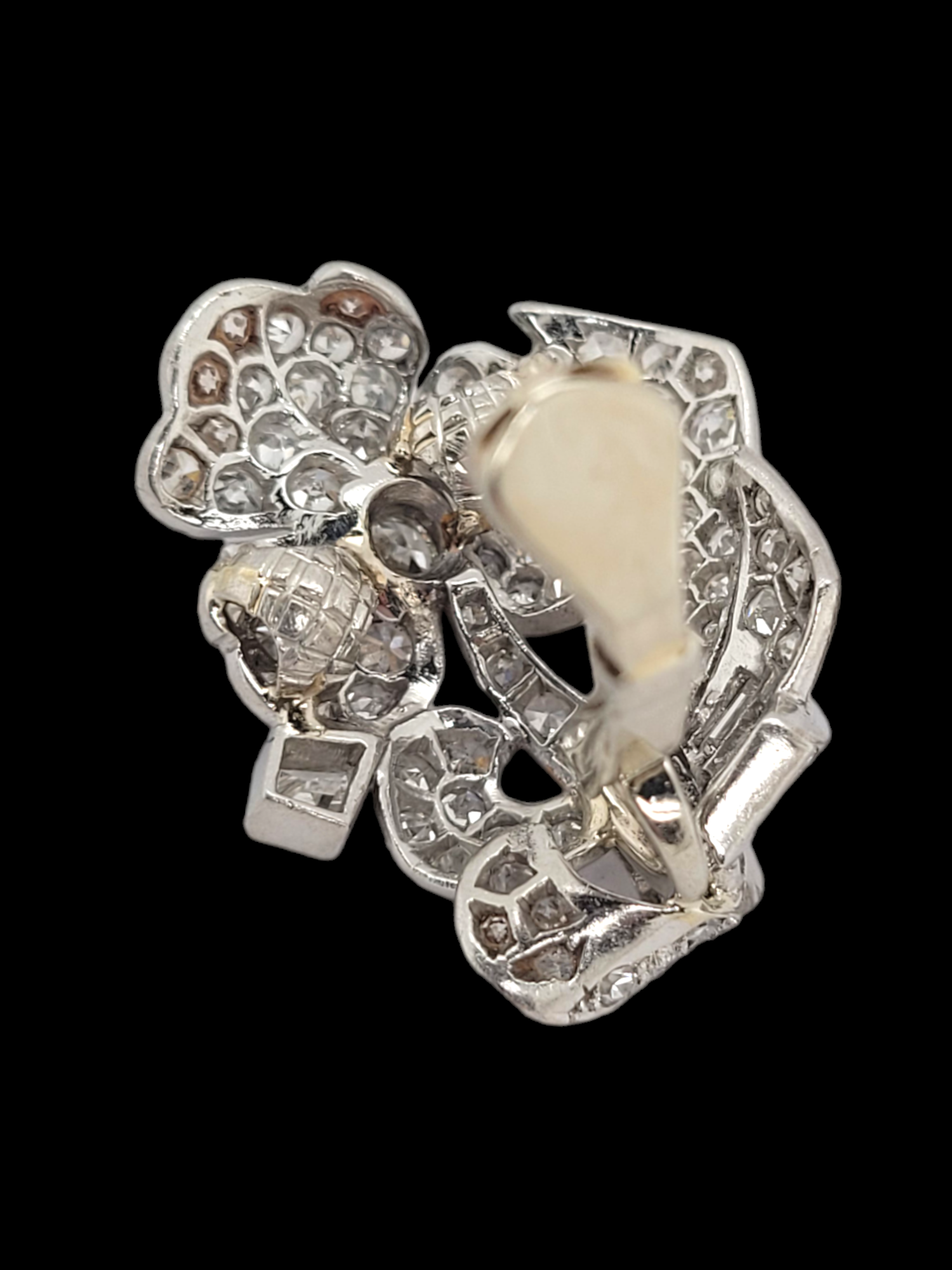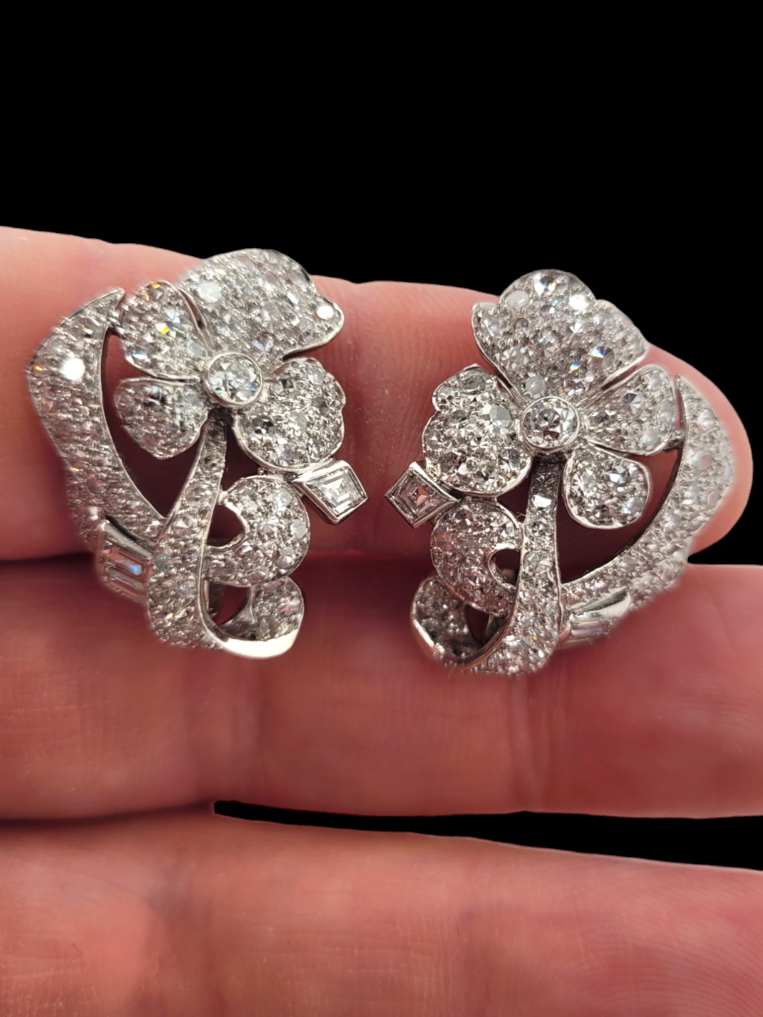 Top quality 2.5cts Old European transitional, baguette, trapeze and eight cut diamonds set in stylised floral and ribbon ear cuff. American circa 1920. 30mm x 20mm. Platinum set with 18ct white gold clips.