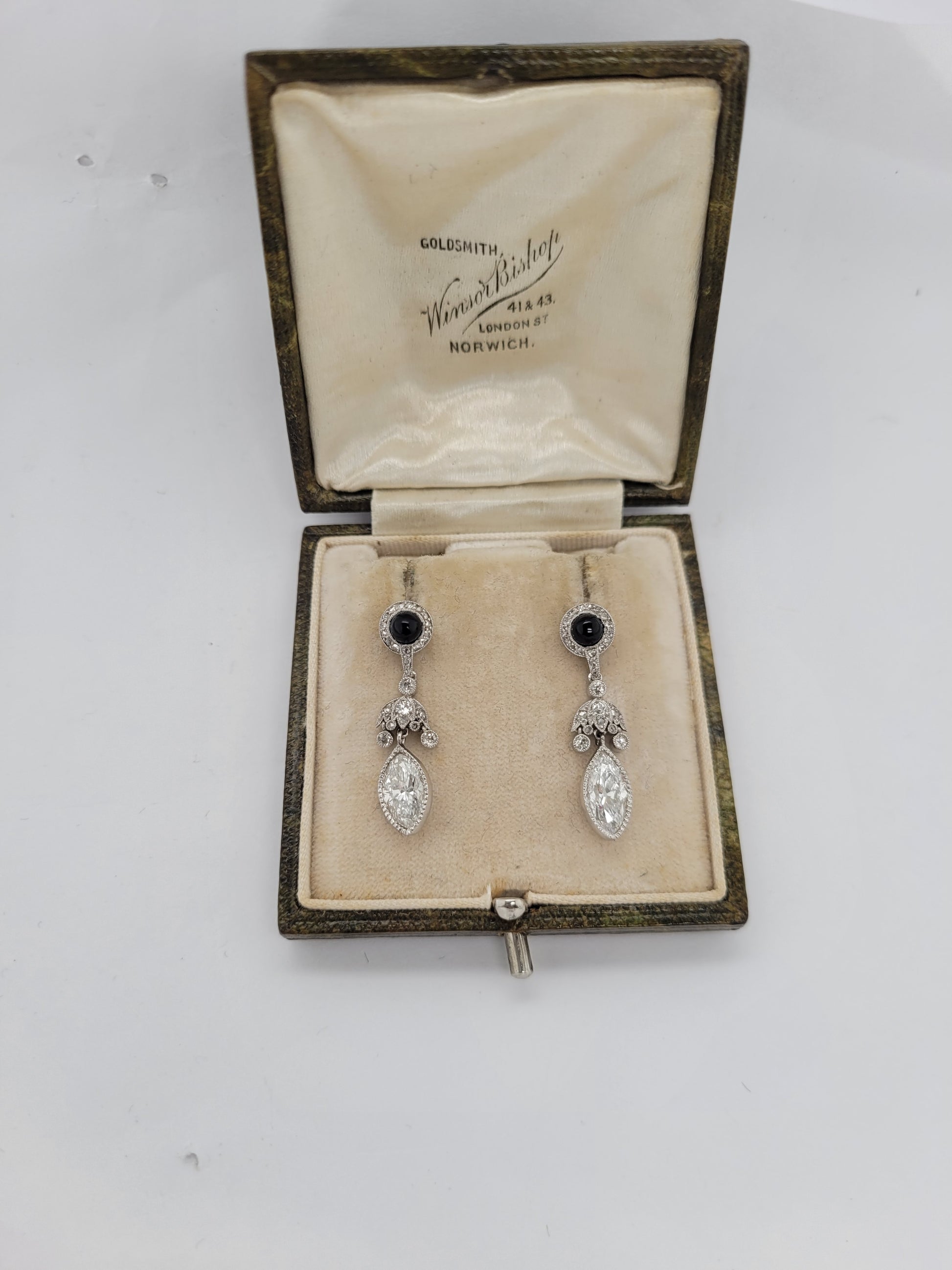 1920's drop earrings with a cabochon sapphire 3.5mm surrounded by miniscule milgrain rose cut diamonds suspending a diamond set umbrella with a central marquise diamond c.1ct and tiny milgrain old mine diamonds either side. Diamond weight approximately 2.20cts sapphire 0.50cts. American circa 1900. Later peg and scroll fittings. 27mm long.