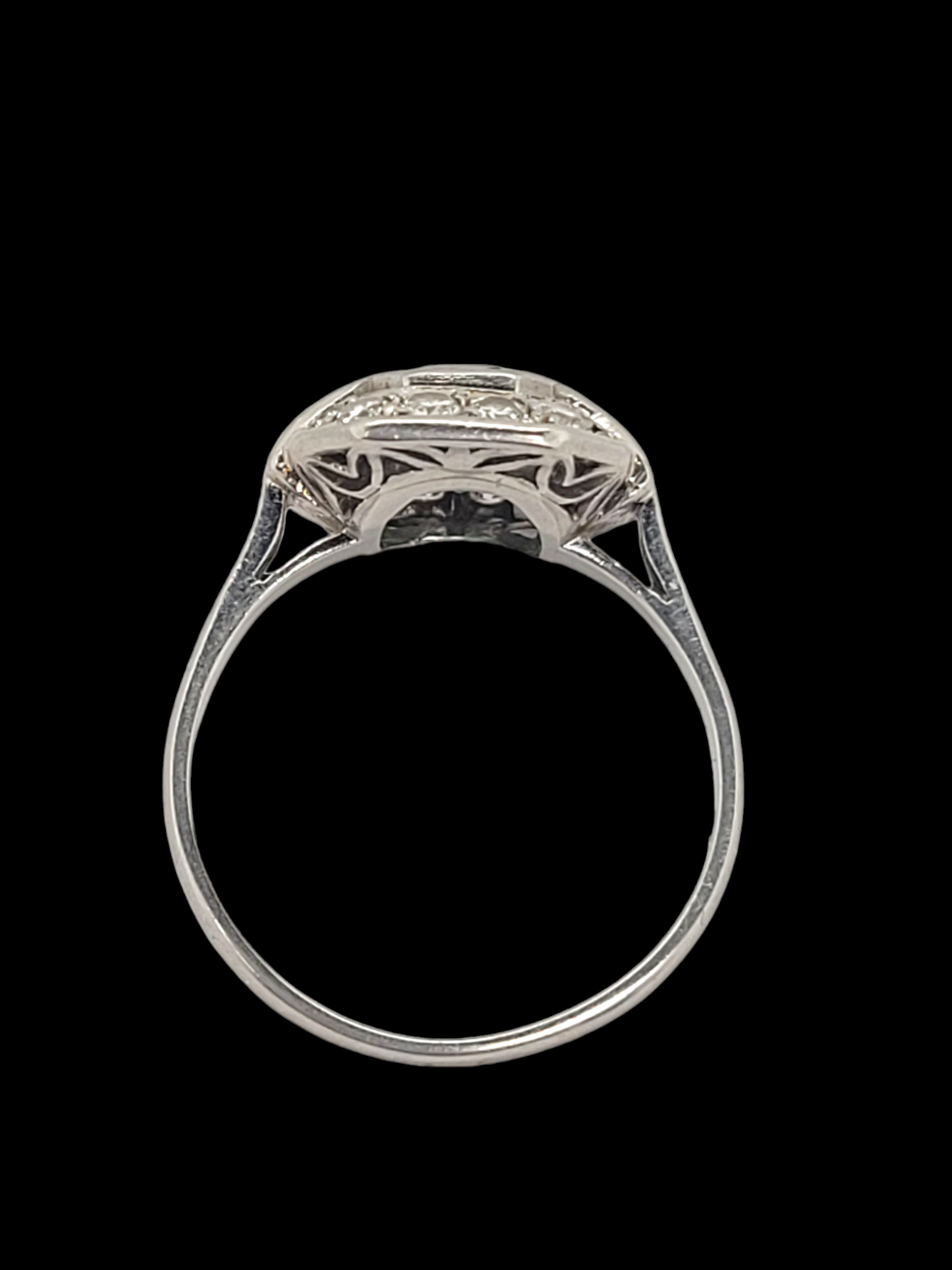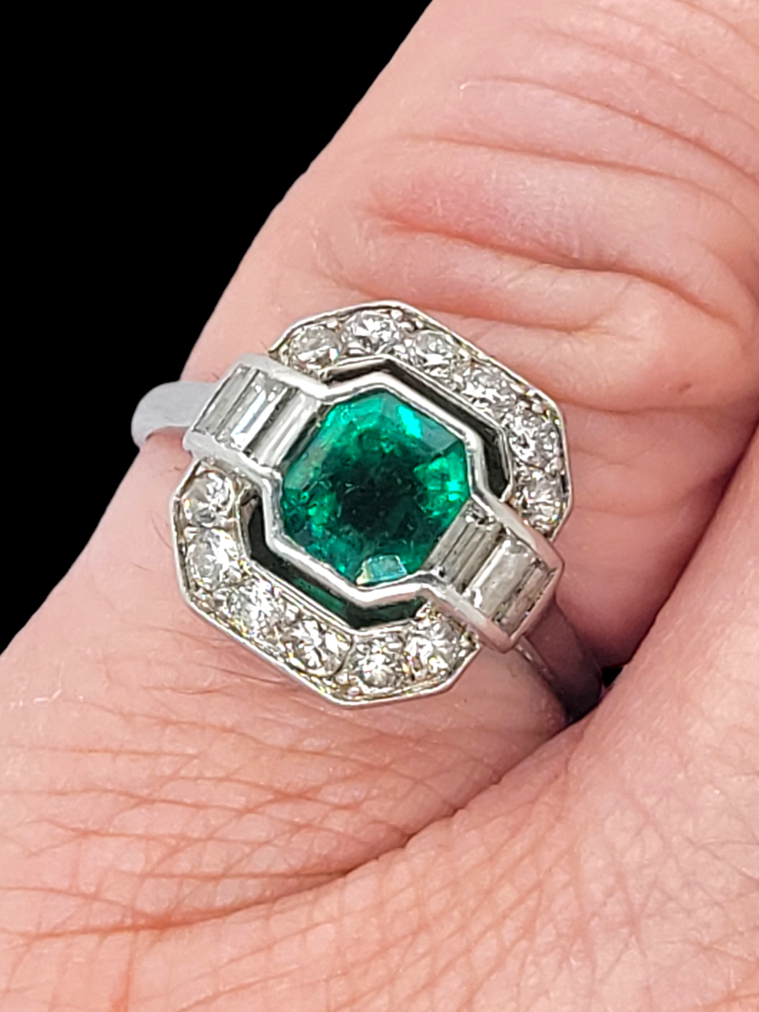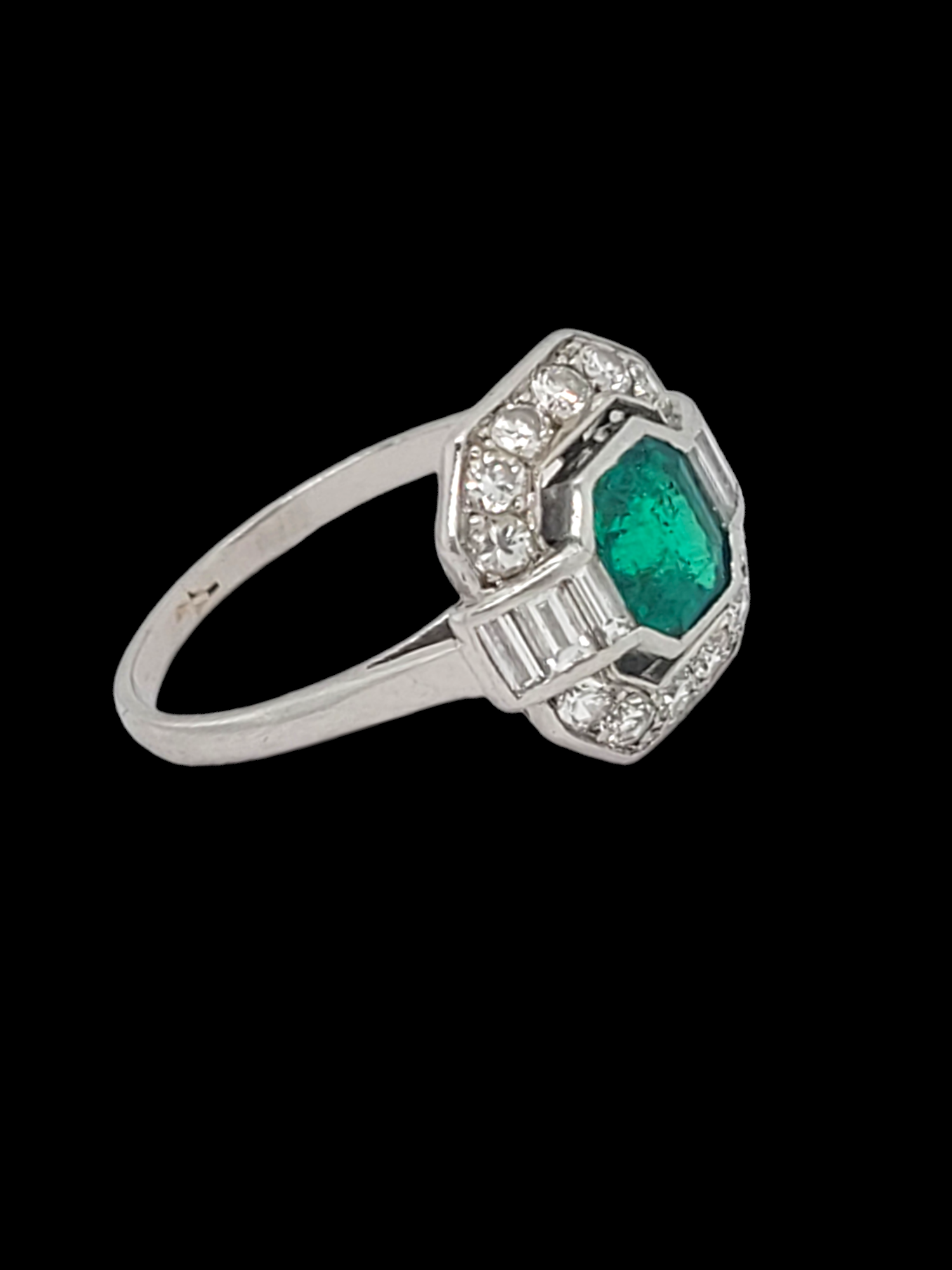 Gem Columbian 0.50ct emerald with baguette diamonds and old European transitional cut diamonds 0.54cts all set in a geometric artdeco design in platinum. 12.5mm head size. English circa 1920. Currently finger size M 1/2