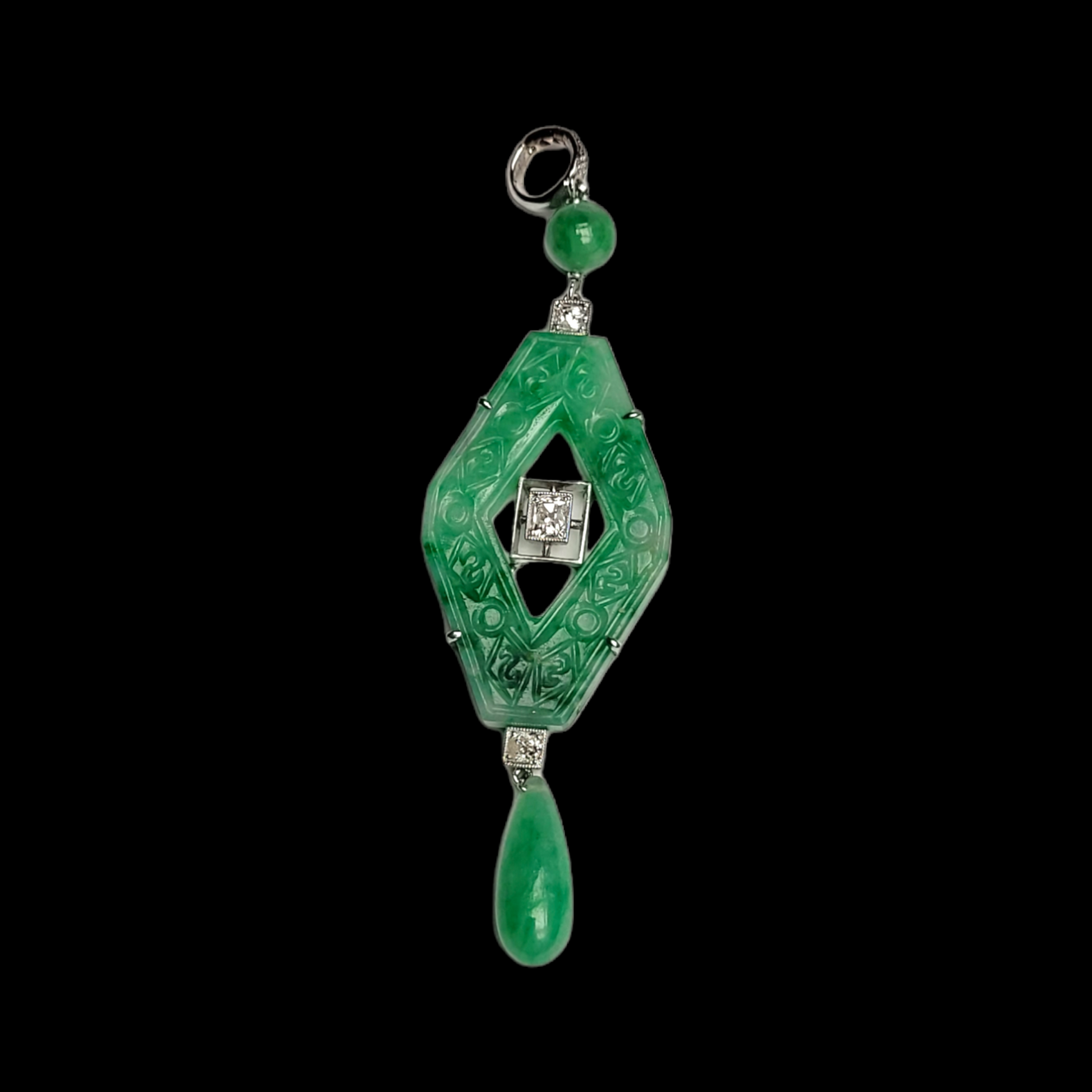 Apple jade carved central lozenge with an antique diamond to centre. Diamond toland bottomset in milgrain platinum suspendinfapear drop jade. Diamond loop and jade bead to top. 70mm x 20mm. Circa 1920