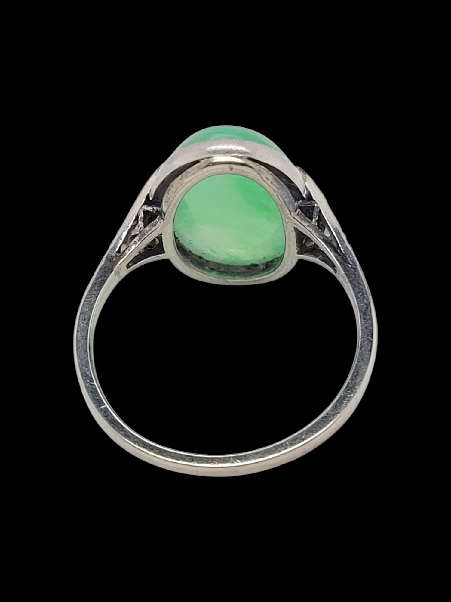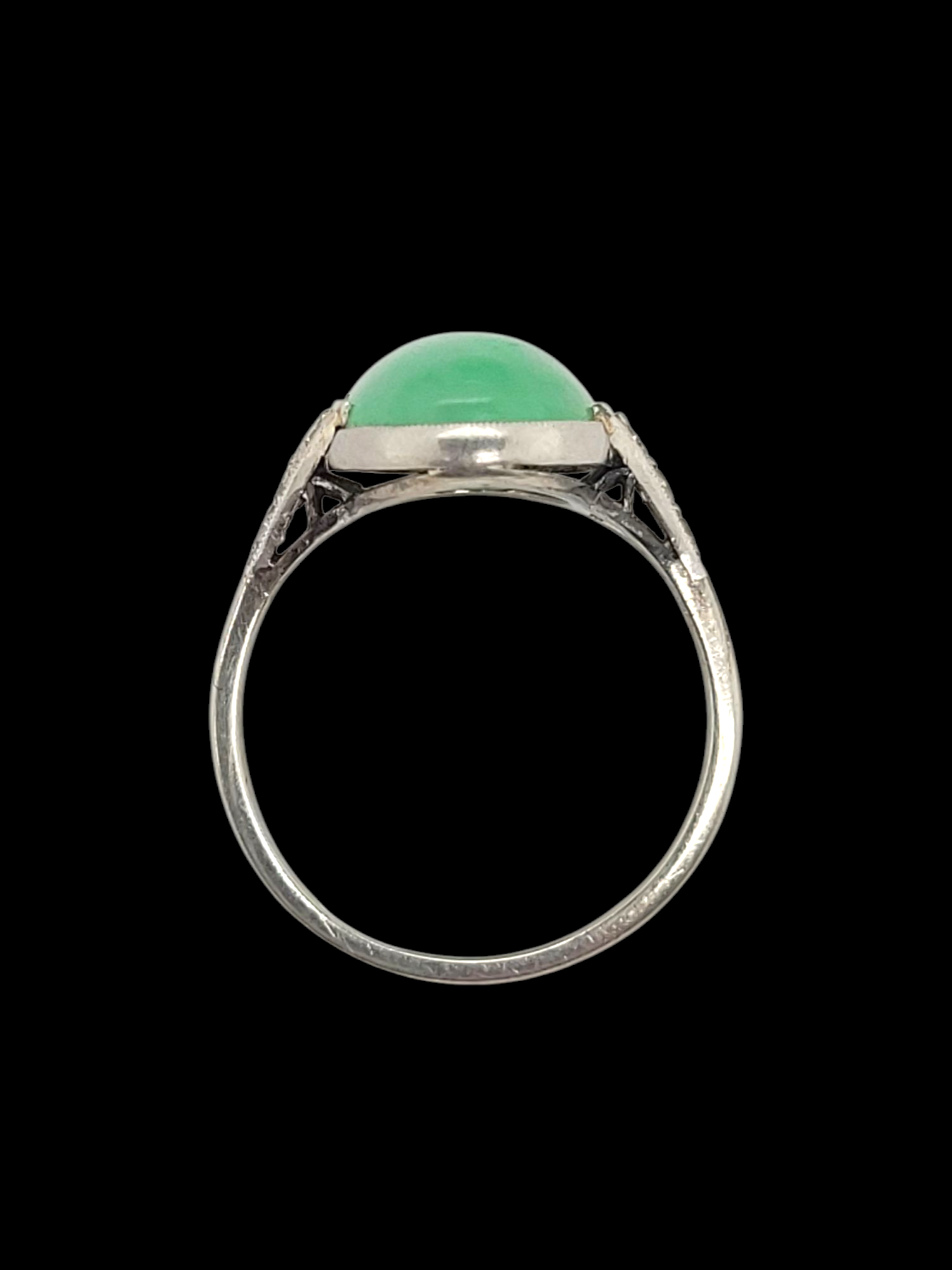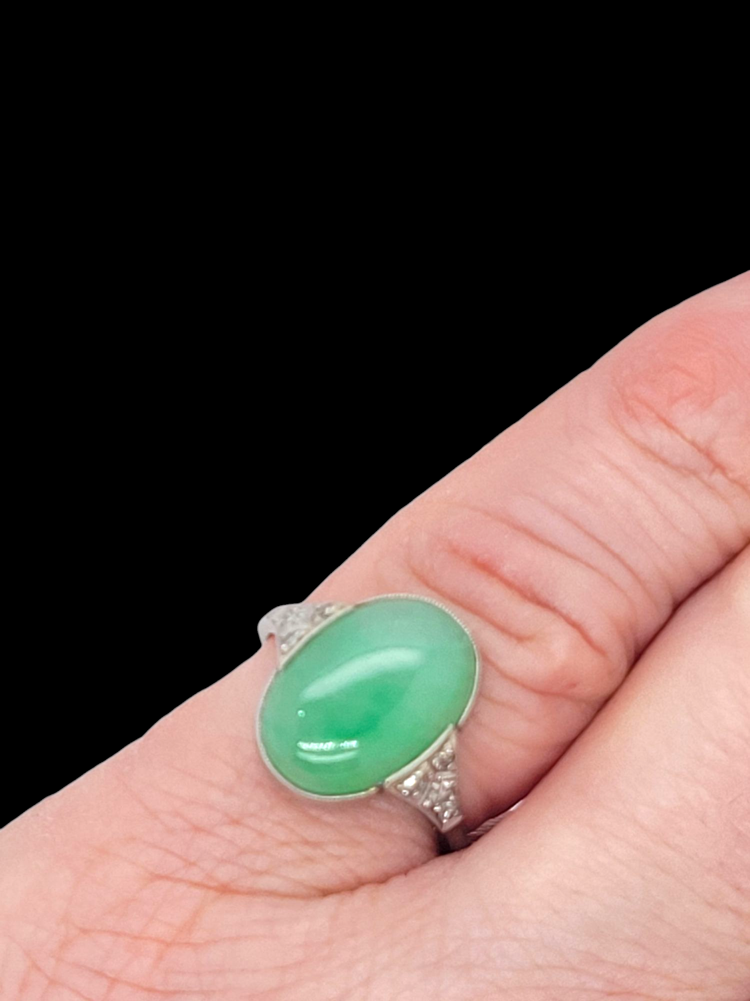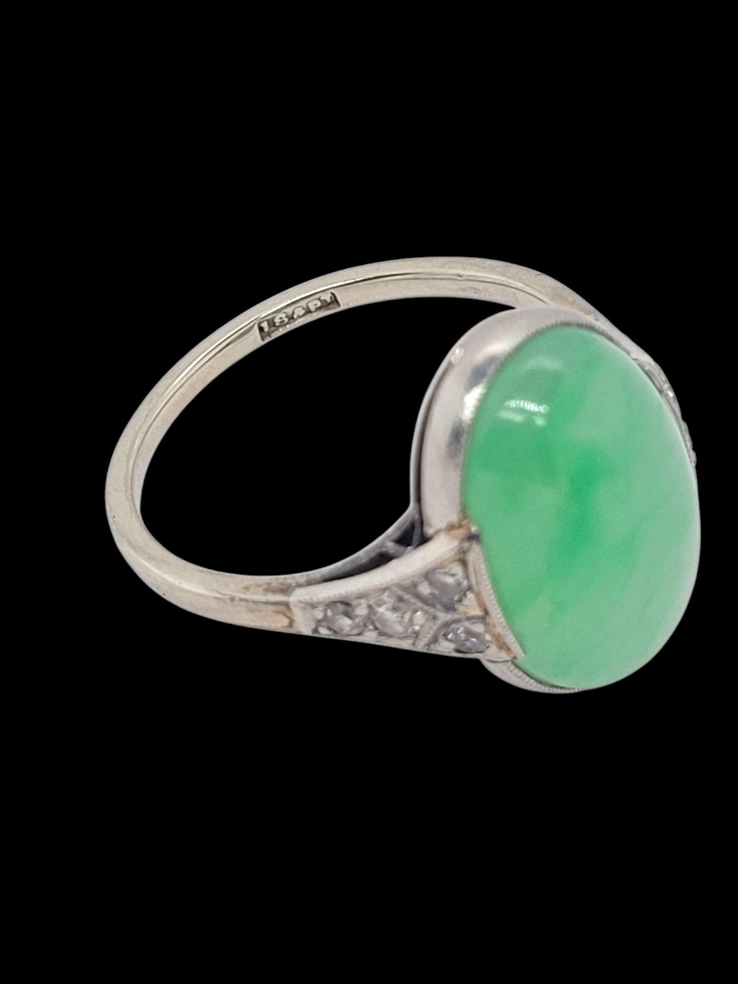 Apple green cabochon oval jade stone 14.5mm x 10.5mm bezel set with diamond set shoulders. Hallmarked 18ct & Pt. (Platinum) . American circa 1910. Currently finger size N (U.S 6.75)